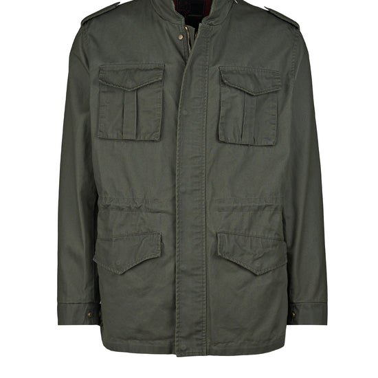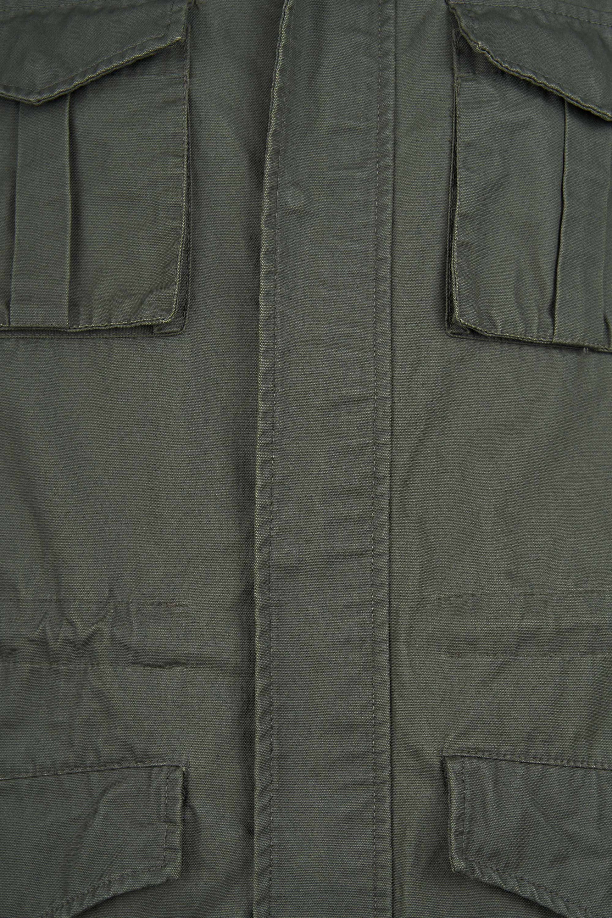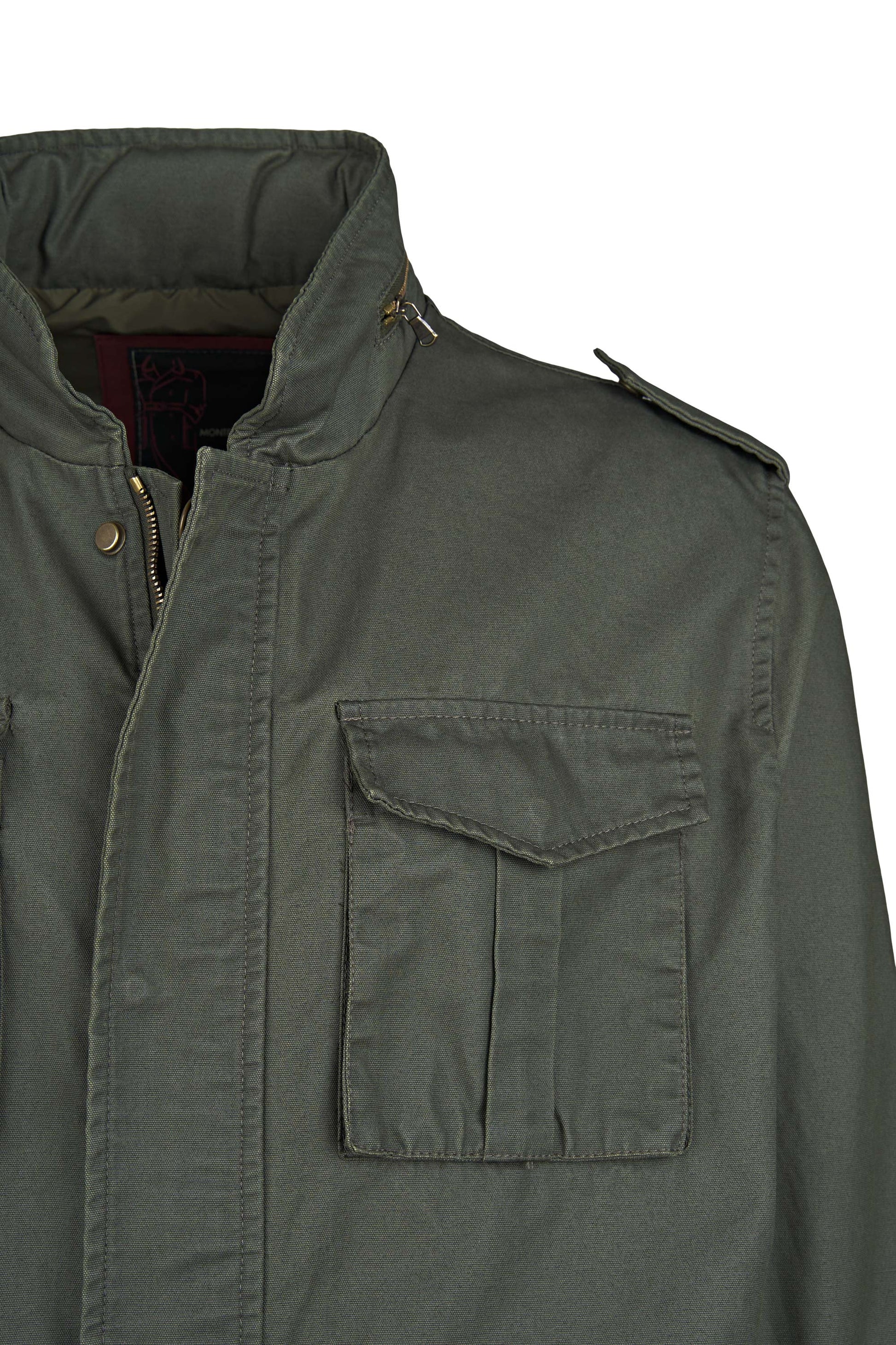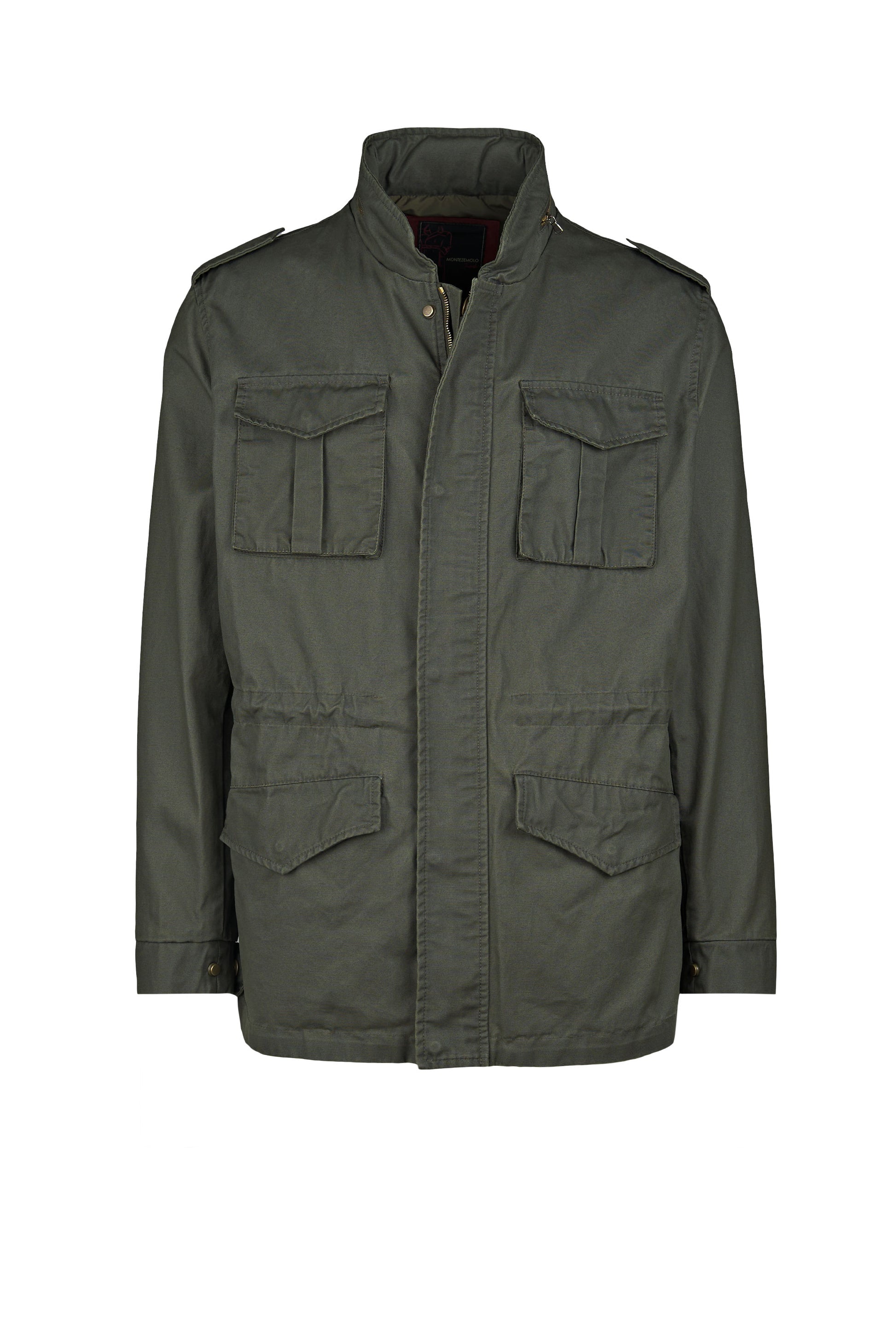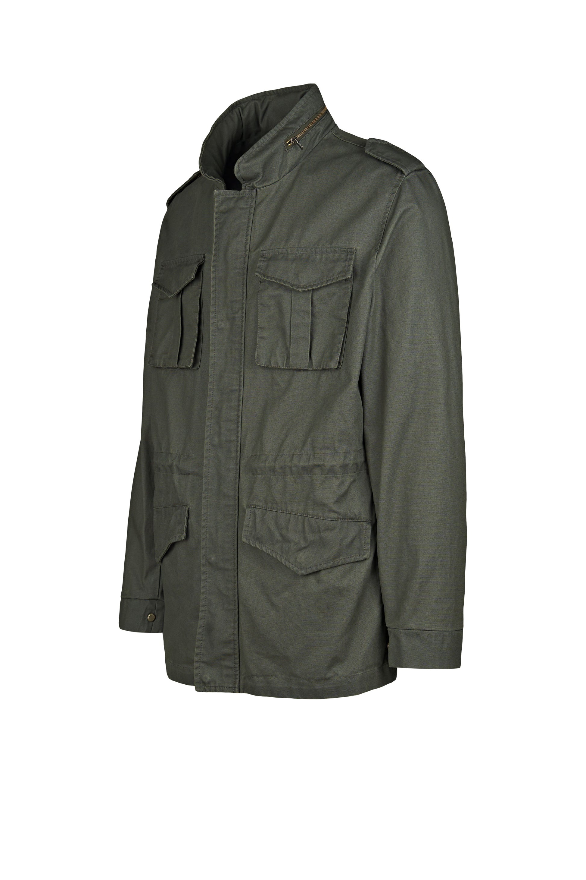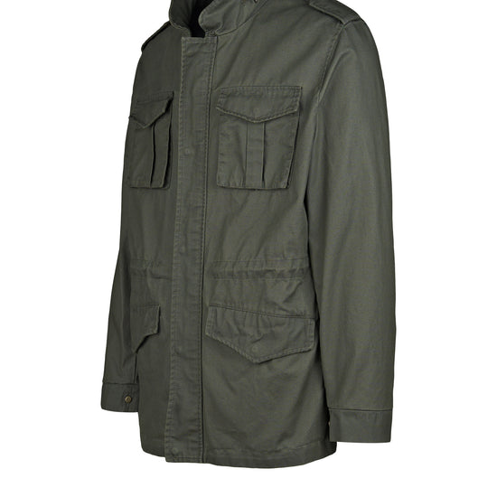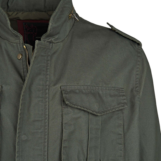 Cotton / polyurethane canvas with lived-in finish and light weather resistance; high stand collar with wind flap and side zip; four roomy flap pockets; zip front with snap storm placket; military epaulettes, adjustable cuffs and reinforced top-stitching; collar hidden hood
