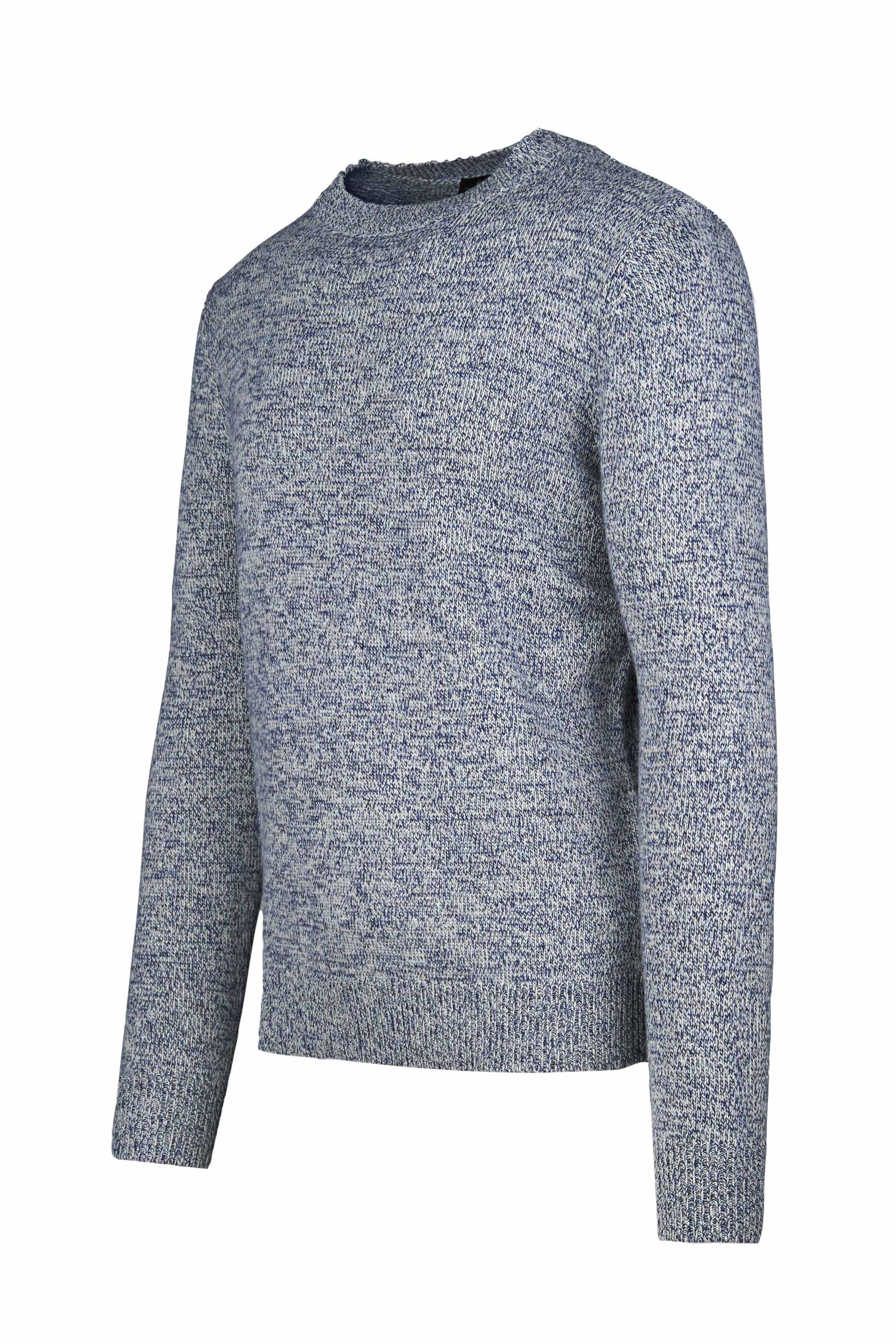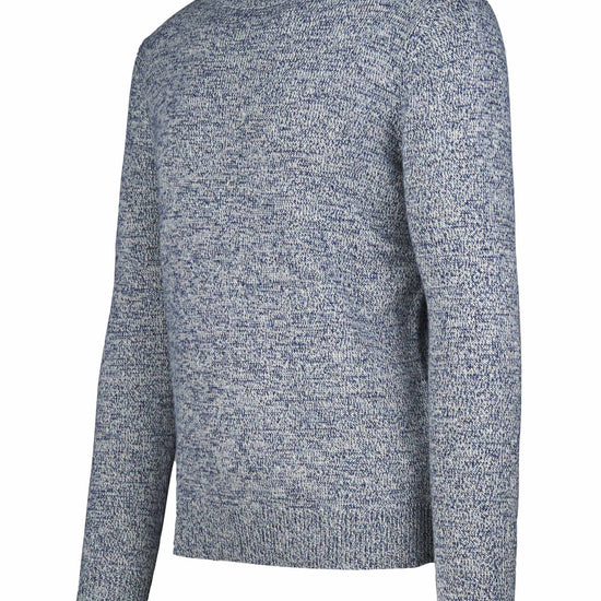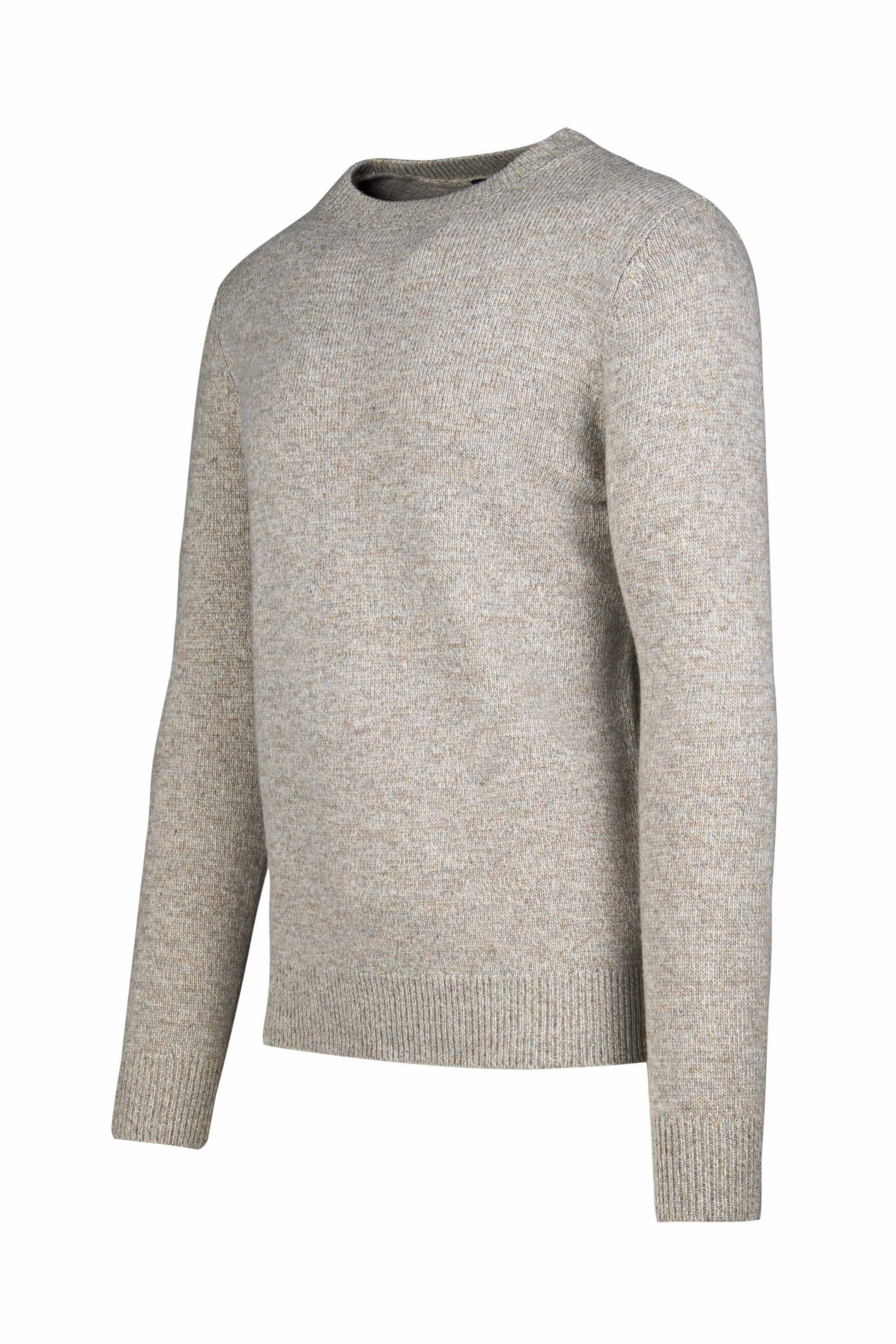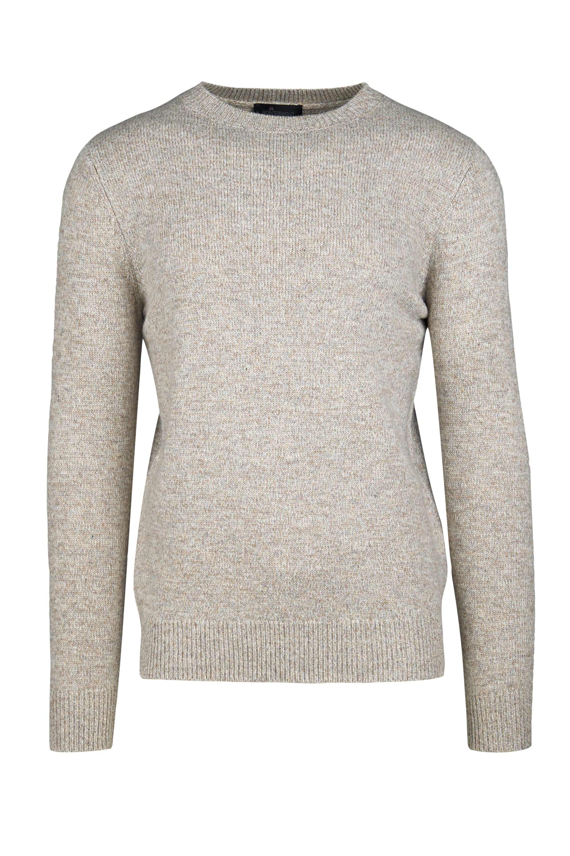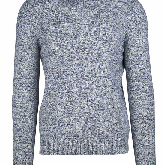 Mouliné two-tone mélange yarn; compact medium-weight plain knit; ribbed crew neckline; set-in sleeves; ribbed cuffs and hem; soft hand feel; clean shoulder and side seams.