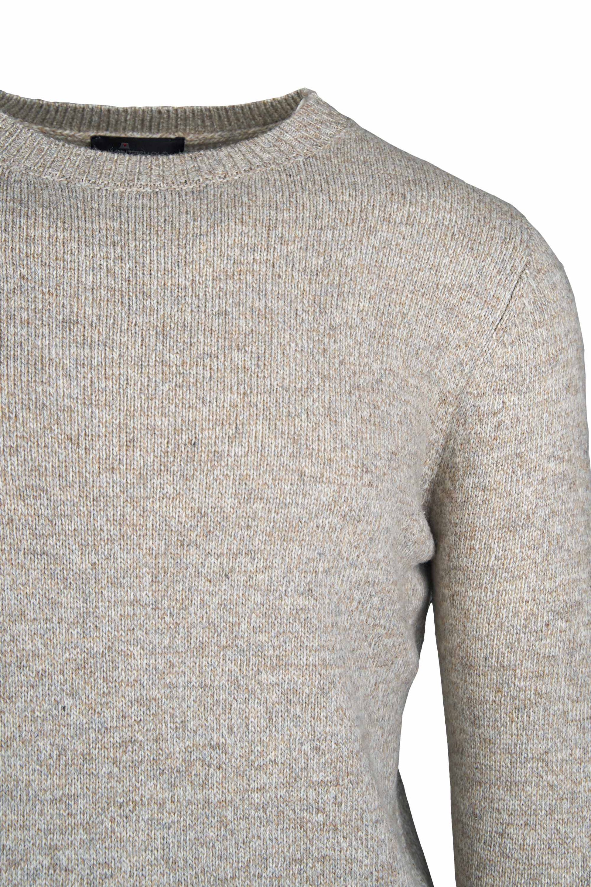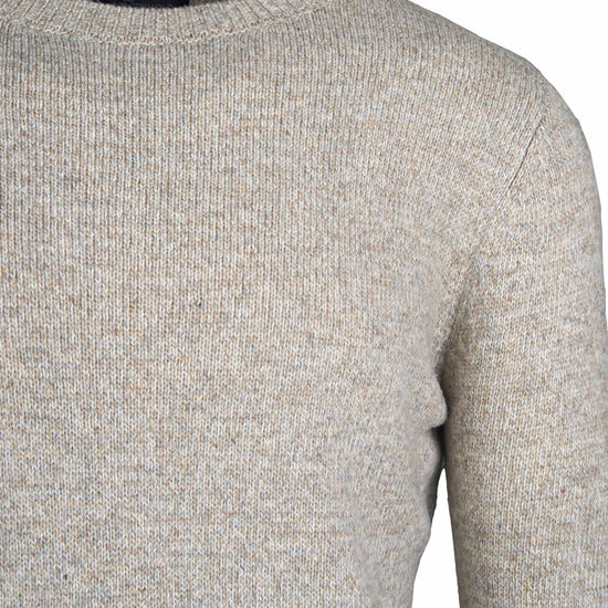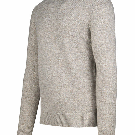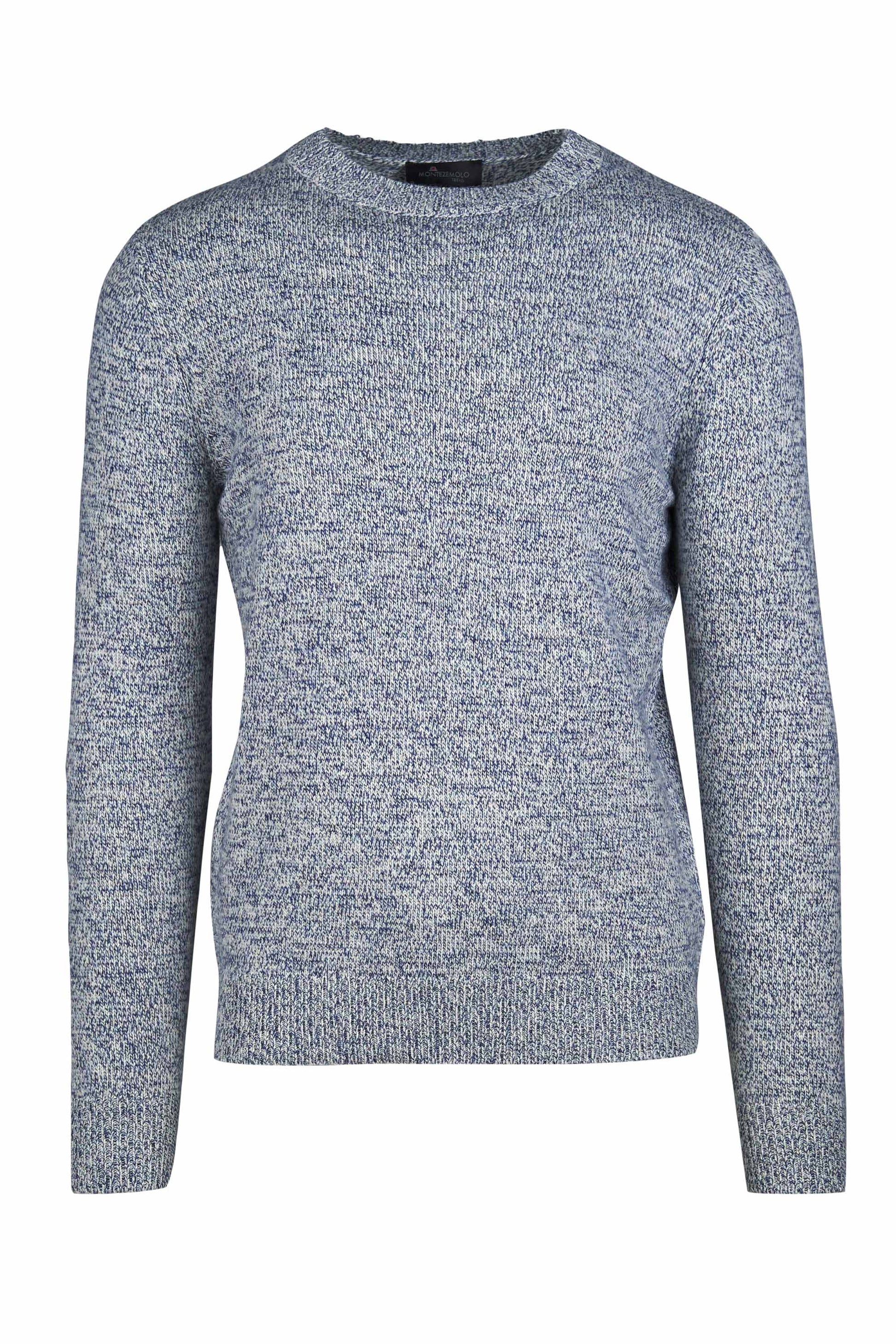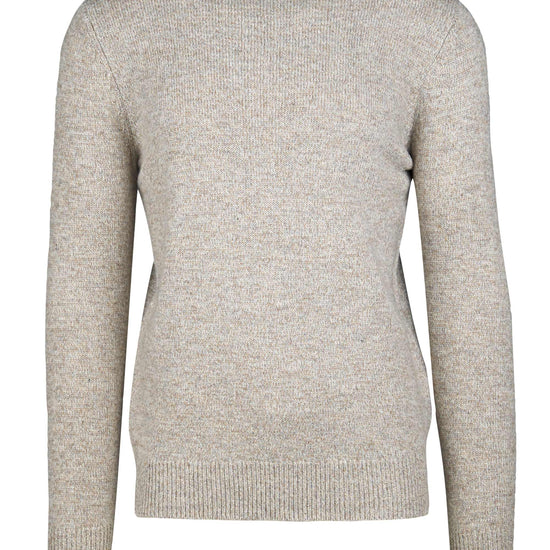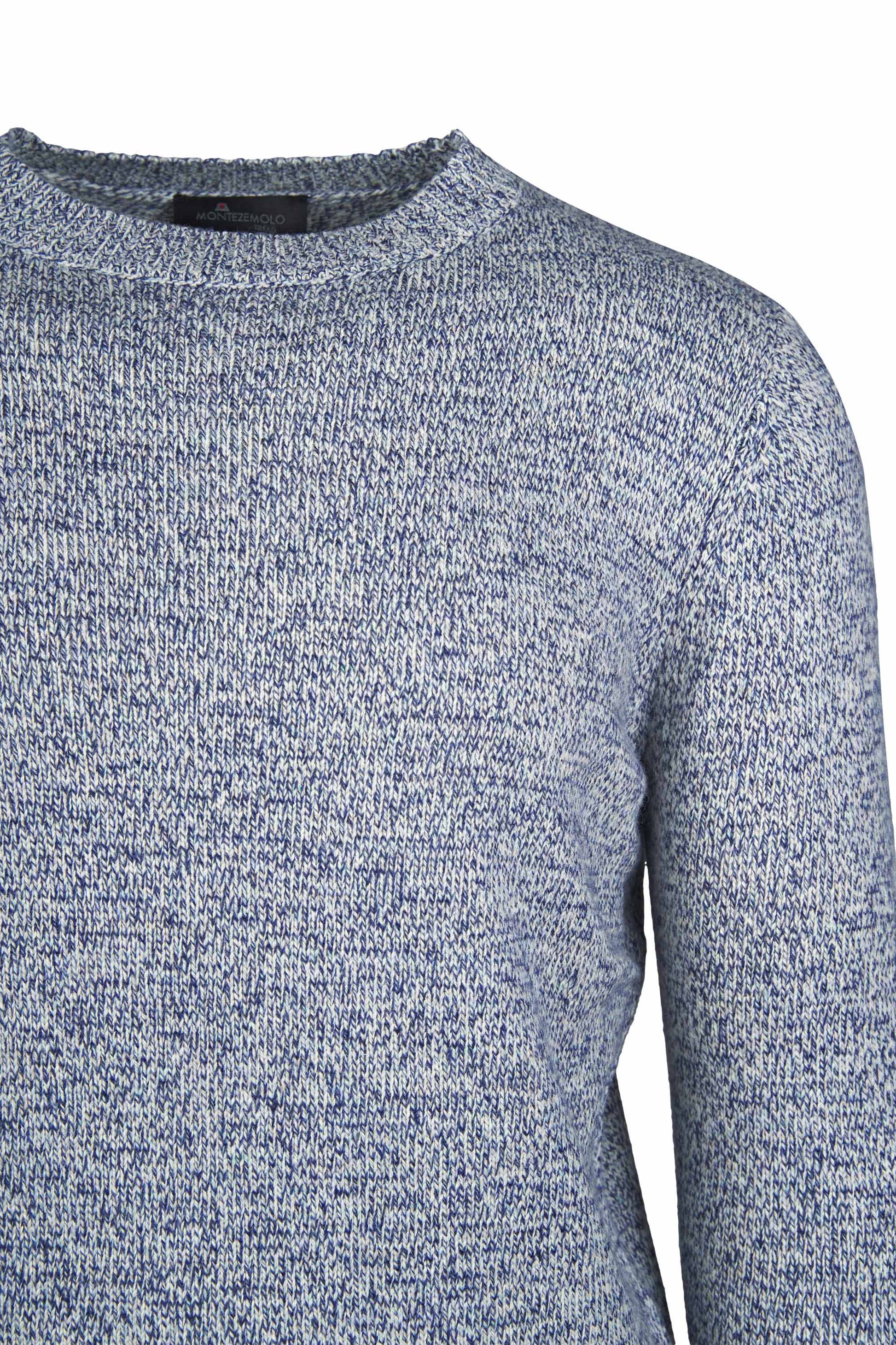 Mouliné two-tone mélange yarn; compact medium-weight plain knit; ribbed crew neckline; set-in sleeves; ribbed cuffs and hem; soft hand feel; clean shoulder and side seams.