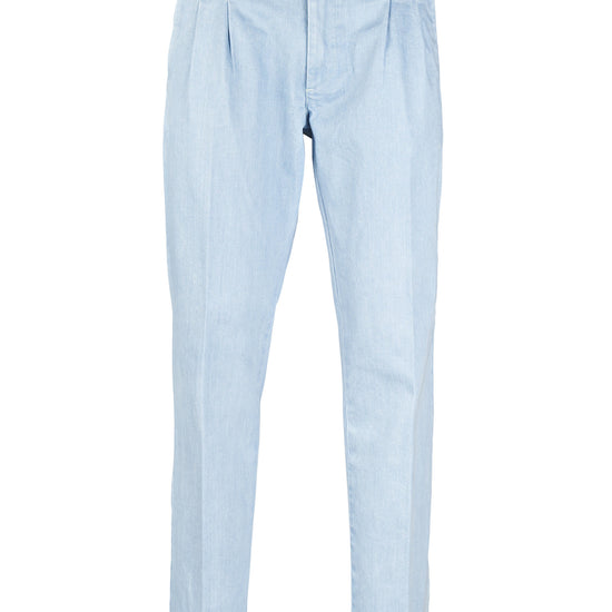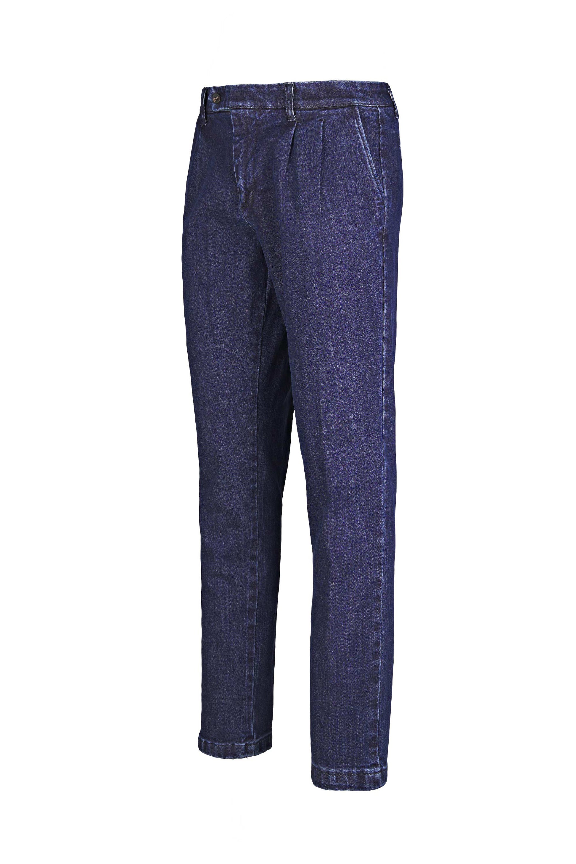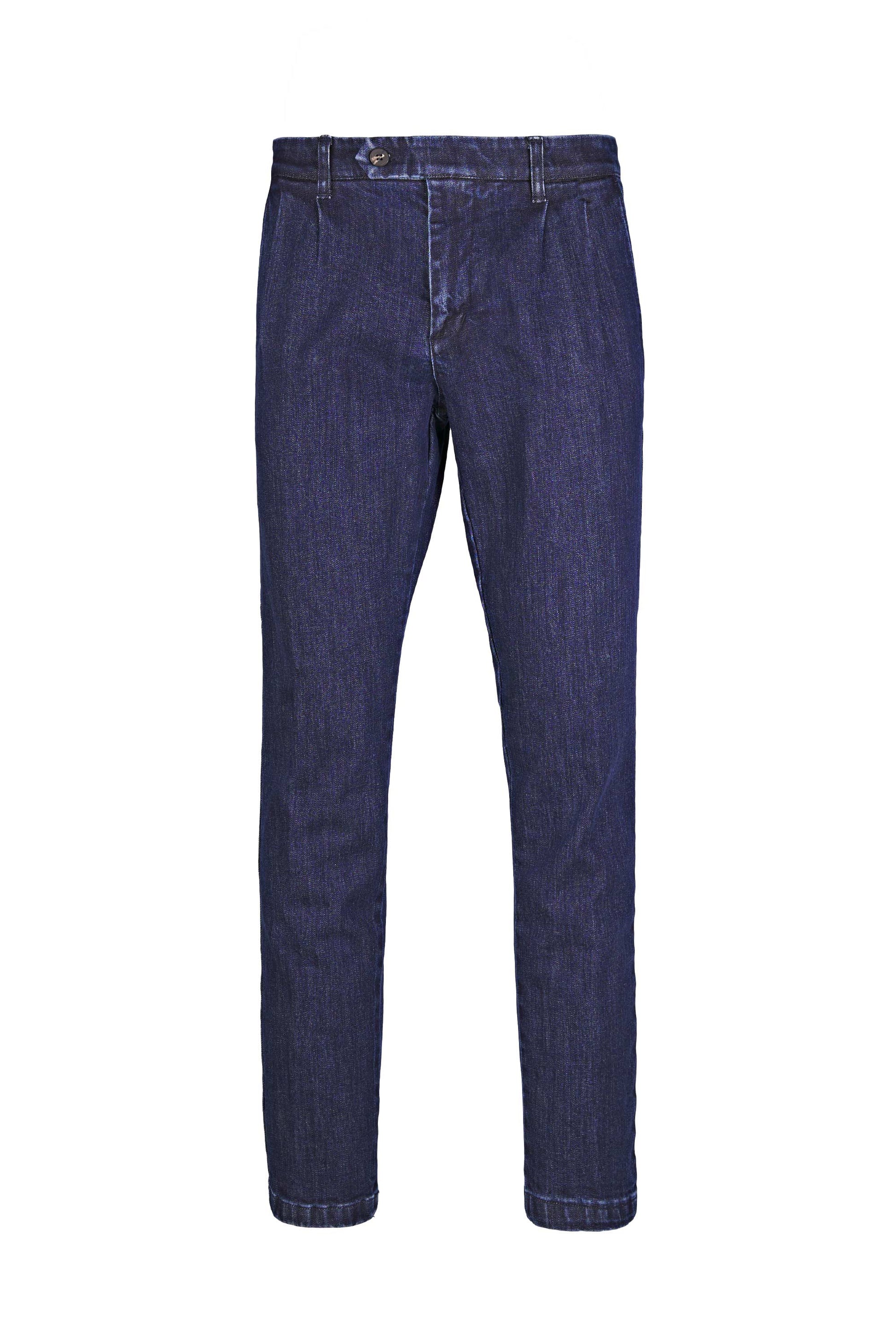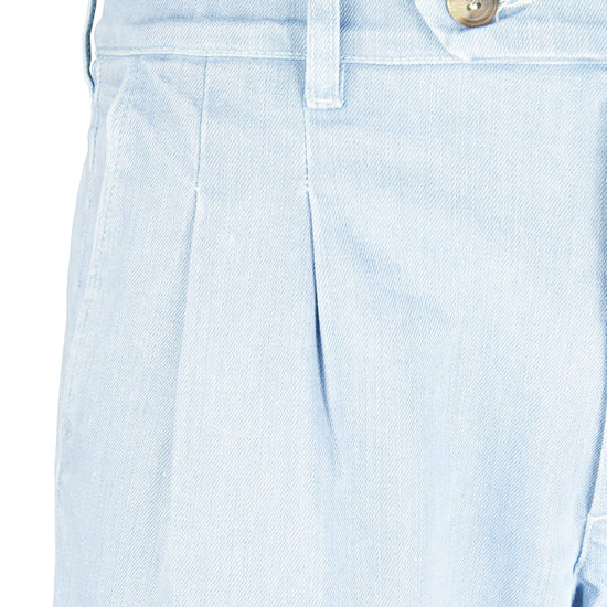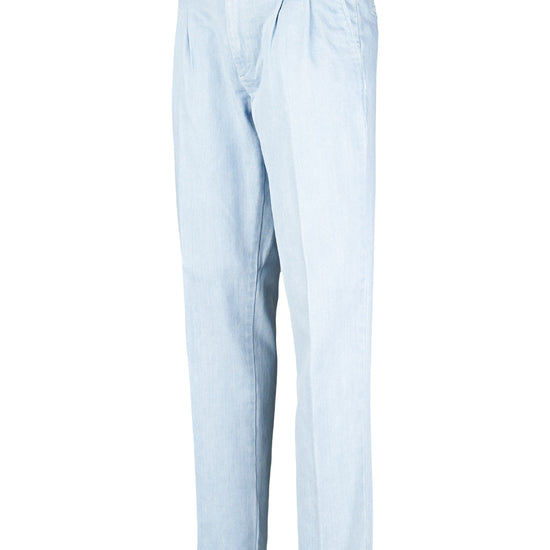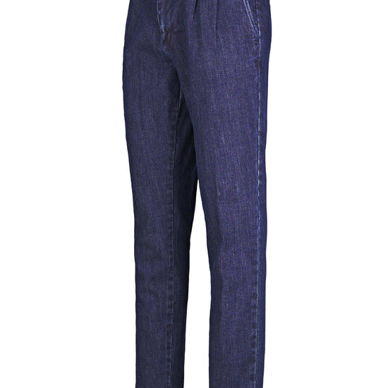 Crafted from a gently washed stretch denim, these trousers reinterpret the classic jean with tailored precision. The double front pleats add a touch of structure while enhancing comfort, and the slim leg falls to a straight 20 cm hem for a clean and modern profile. The fabric has a soft, compact hand with a subtle diagonal weave, offering both durability and comfort for day-long wear. Belt loops, button and zip fastening, slanted side pockets and rear welt pockets complete this versatile staple – ideal for relaxed yet refined styling.