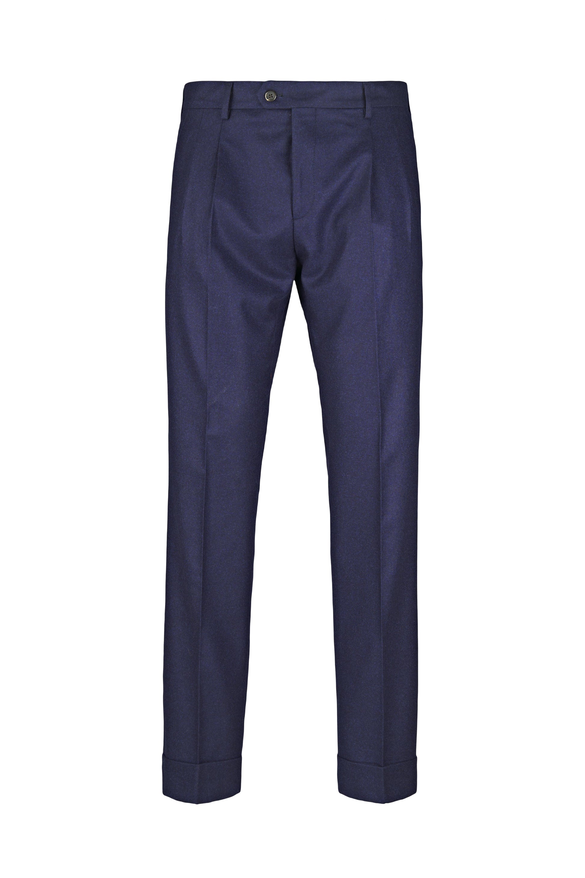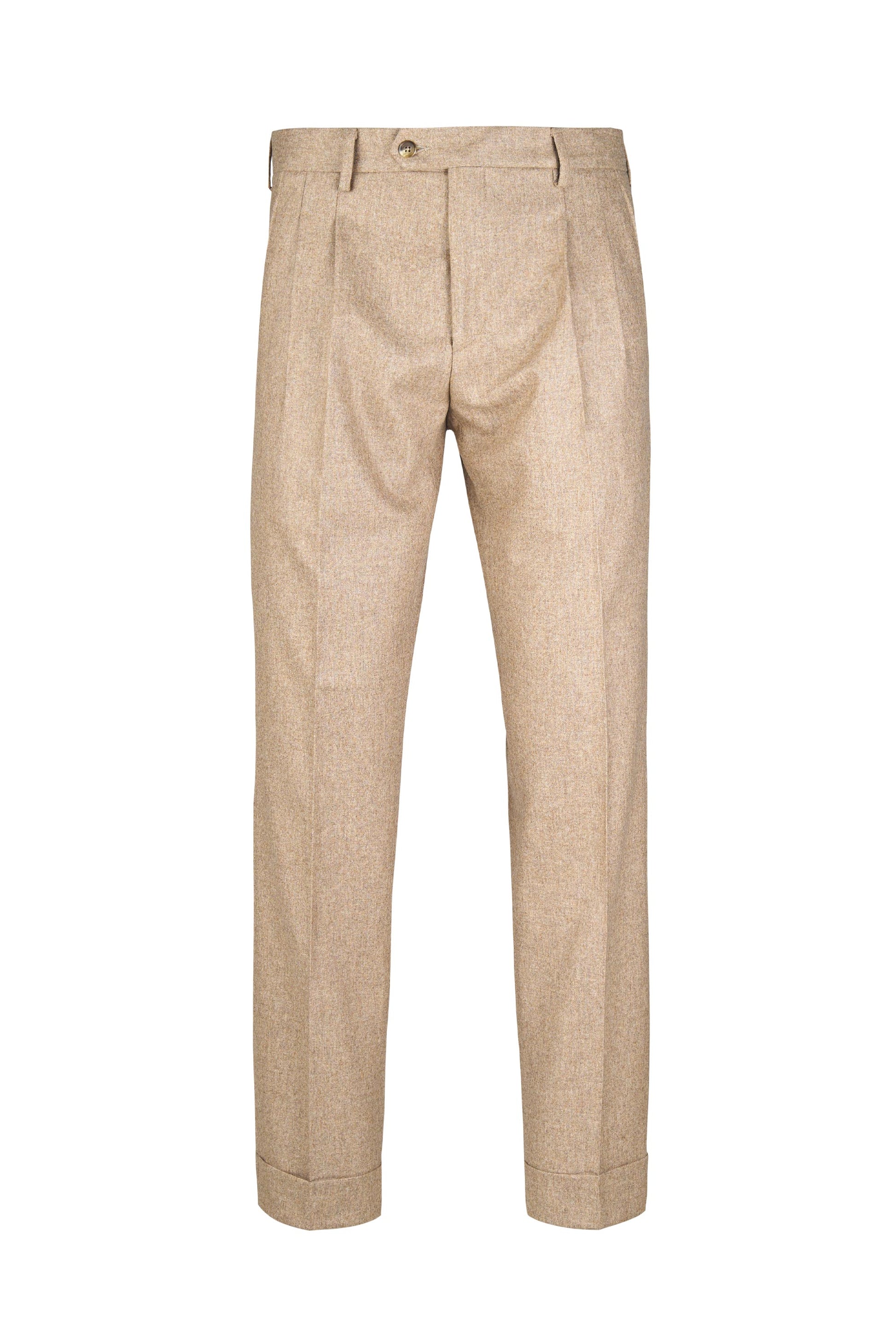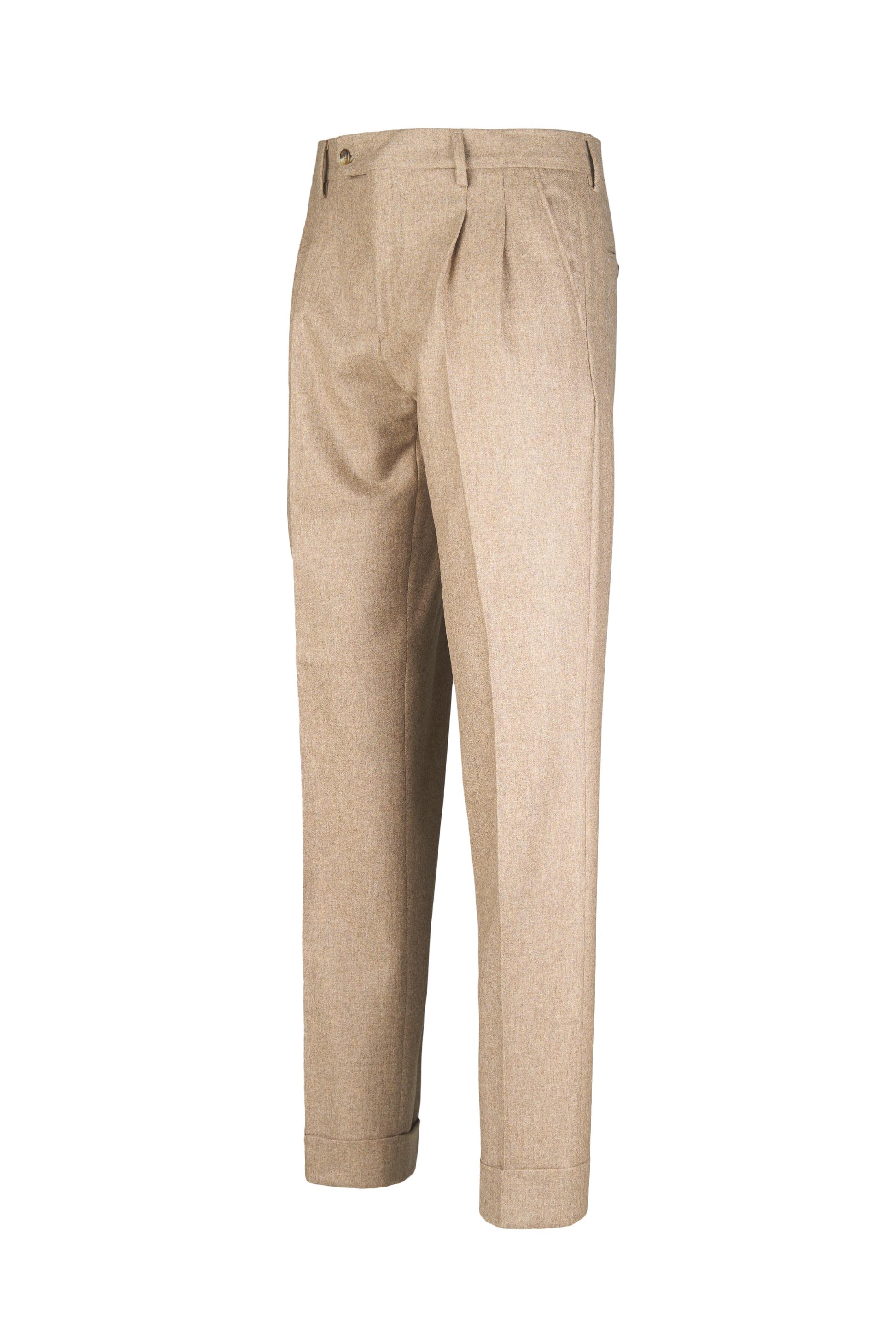 Tailored trousers crafted from a fine Italian wool and cashmere blend, enriched with a touch of technical fiber for improved durability and shape retention. The silhouette is defined by deep double pleats at the front, offering volume and relaxed structure while maintaining a tapered leg. The hem measures 20 cm and features a neatly sewn cuff, lending a smart, elevated finish. The waistband includes belt loops and a front closure with horn button and hidden zip. A refined option that blends comfort with contemporary sophistication, ideal for both elevated casualwear and semi-formal settings.