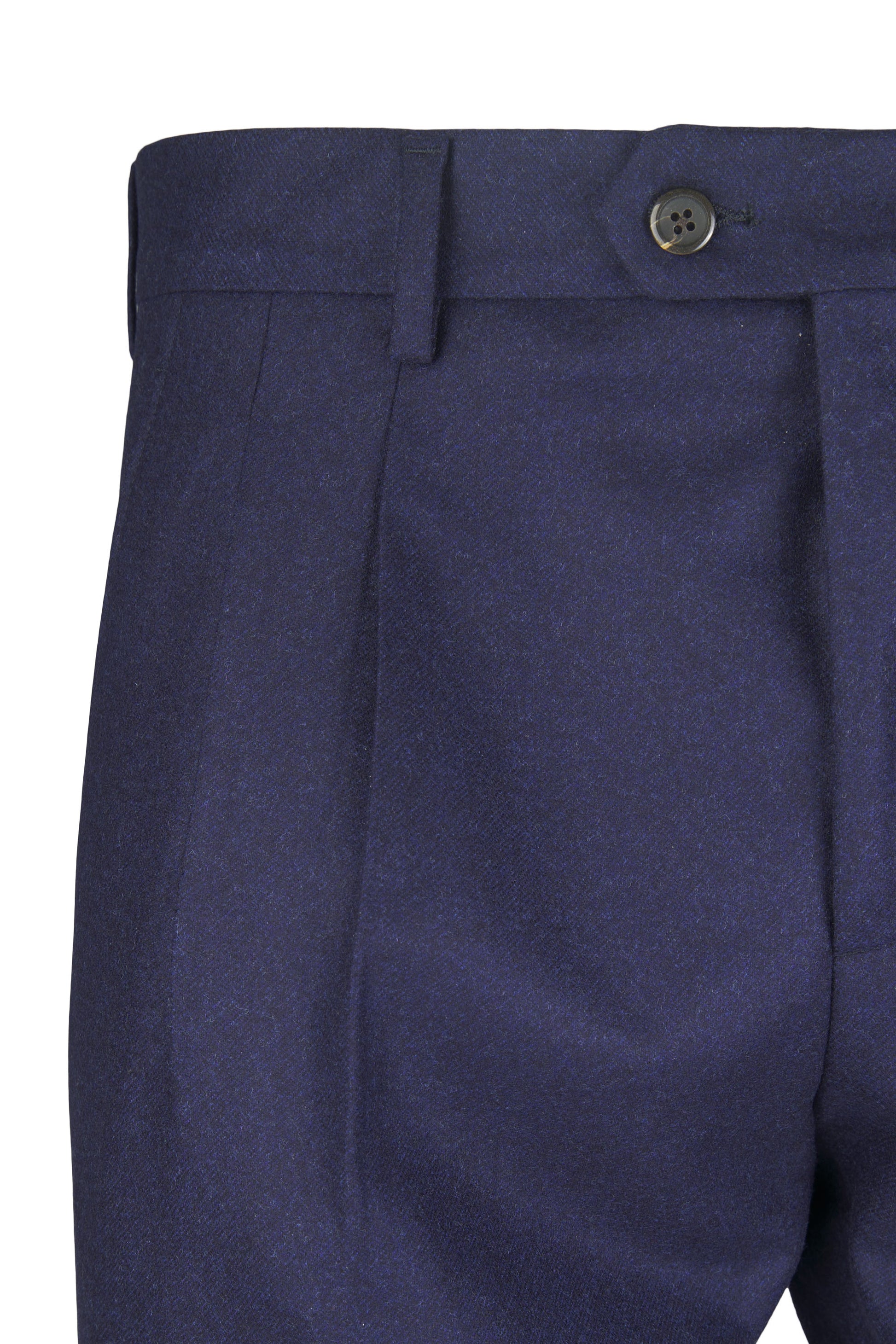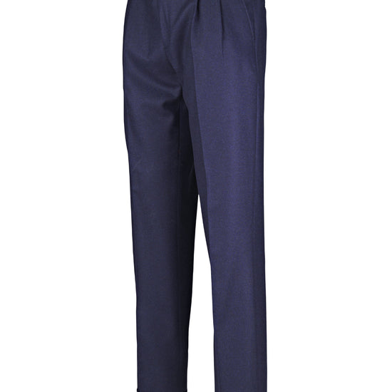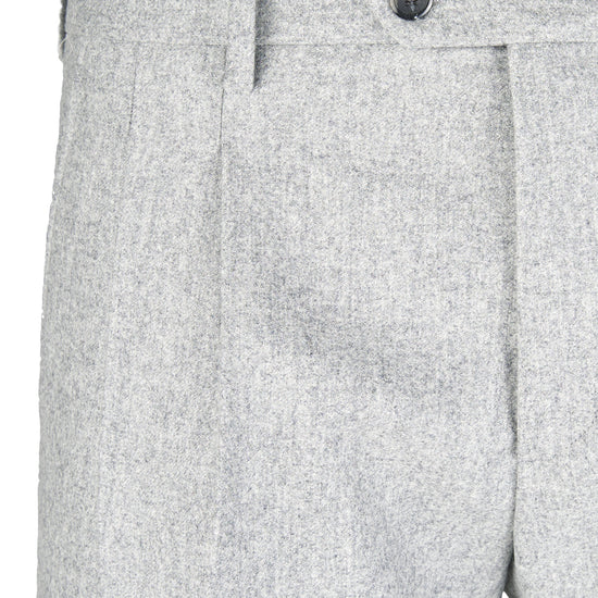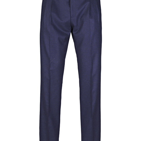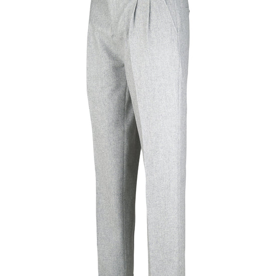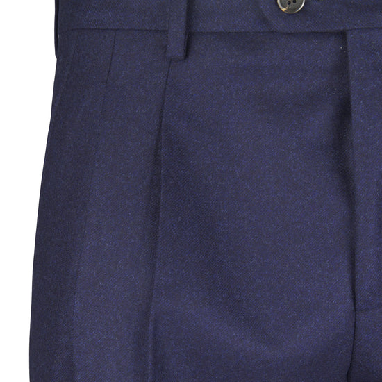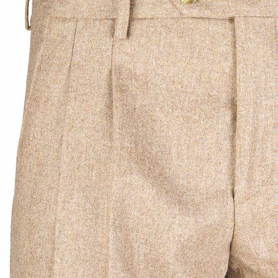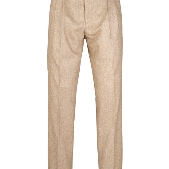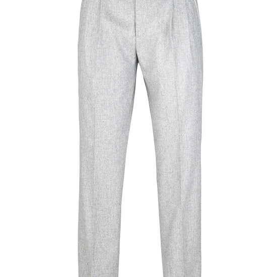 Tailored trousers crafted from a fine Italian wool and cashmere blend, enriched with a touch of technical fiber for improved durability and shape retention. The silhouette is defined by deep double pleats at the front, offering volume and relaxed structure while maintaining a tapered leg. The hem measures 20 cm and features a neatly sewn cuff, lending a smart, elevated finish. The waistband includes belt loops and a front closure with horn button and hidden zip. A refined option that blends comfort with contemporary sophistication, ideal for both elevated casualwear and semi-formal settings.