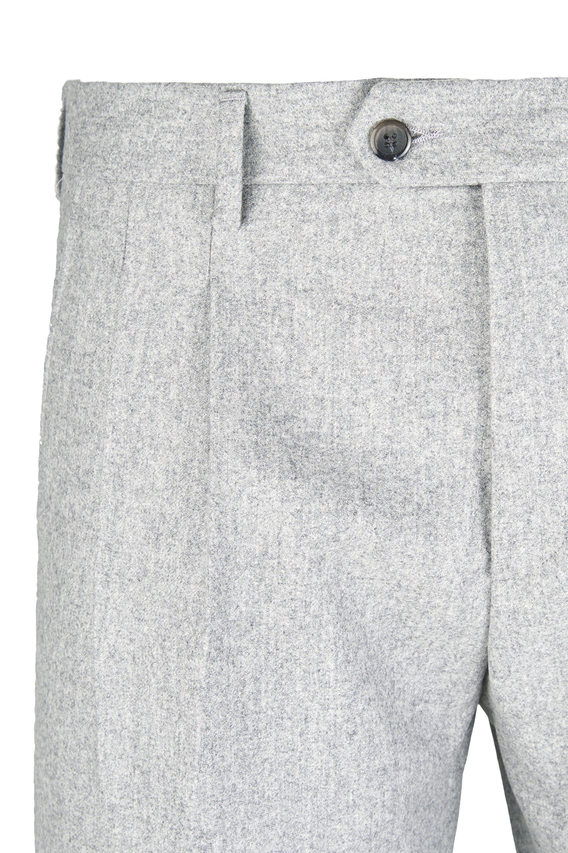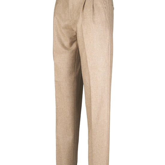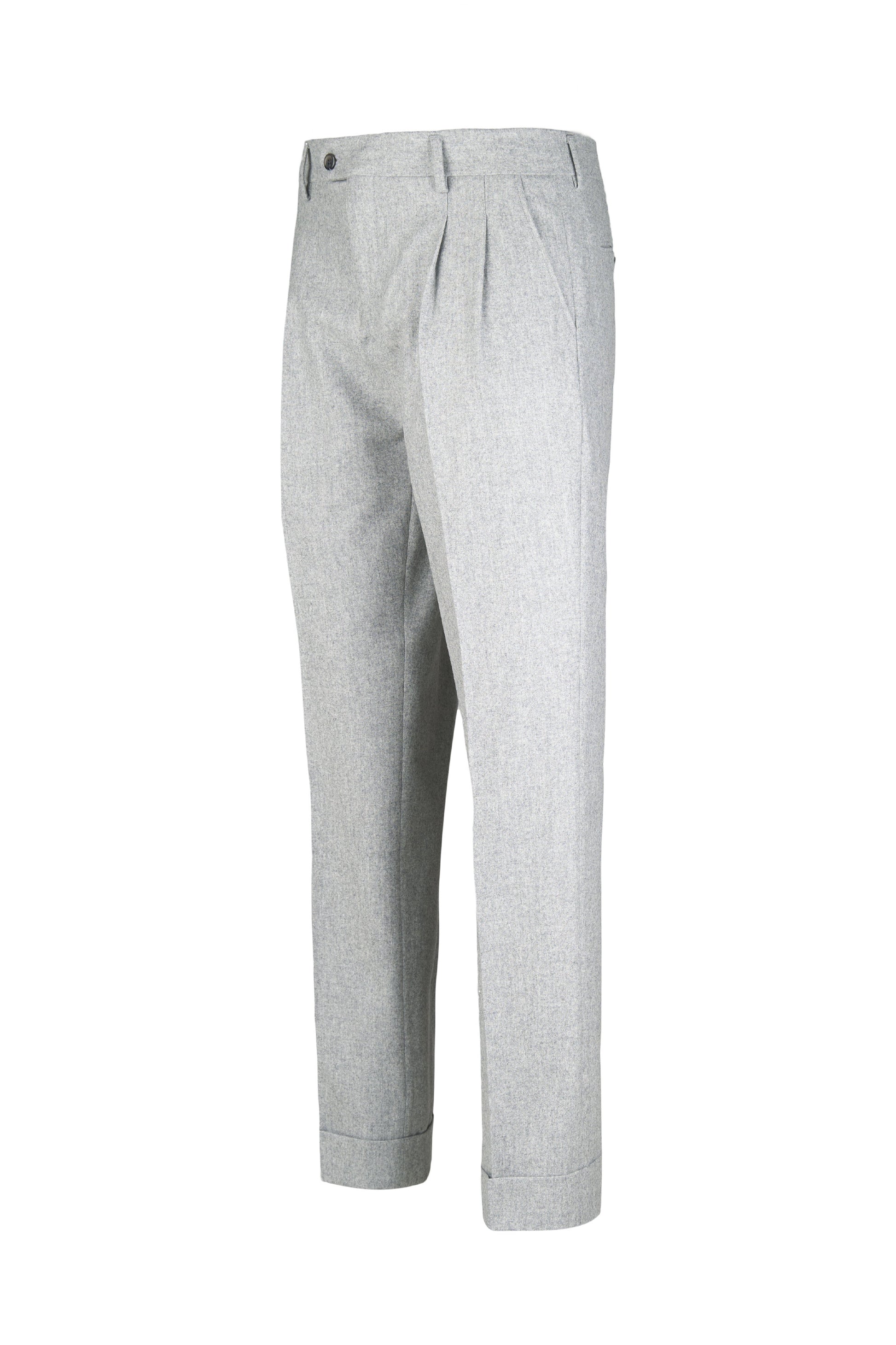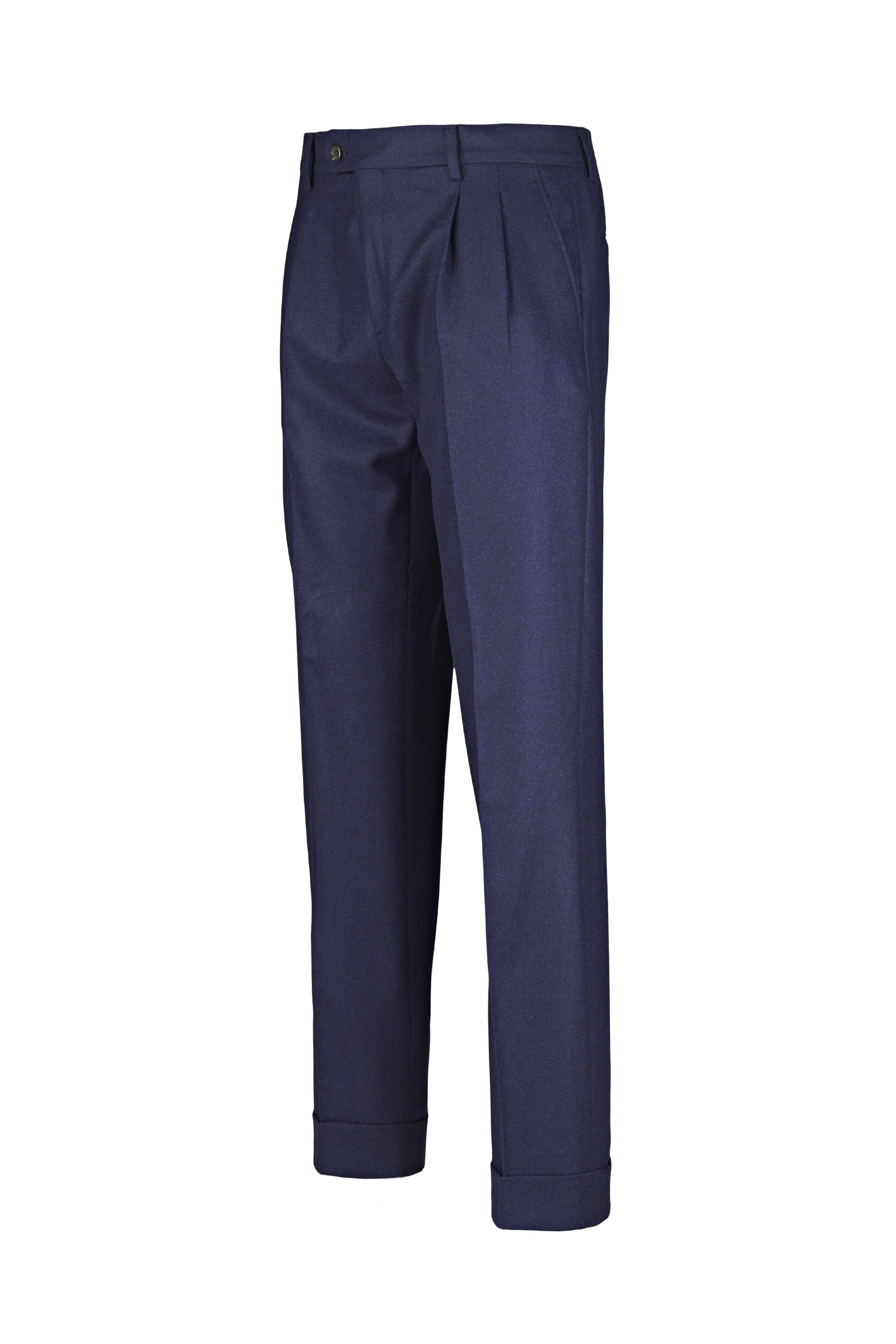 Deep double pleats, 20 cm hem with sewn cuff, wool/cashmere fabric, horn button, front zip closure, belt loops, tapered fit