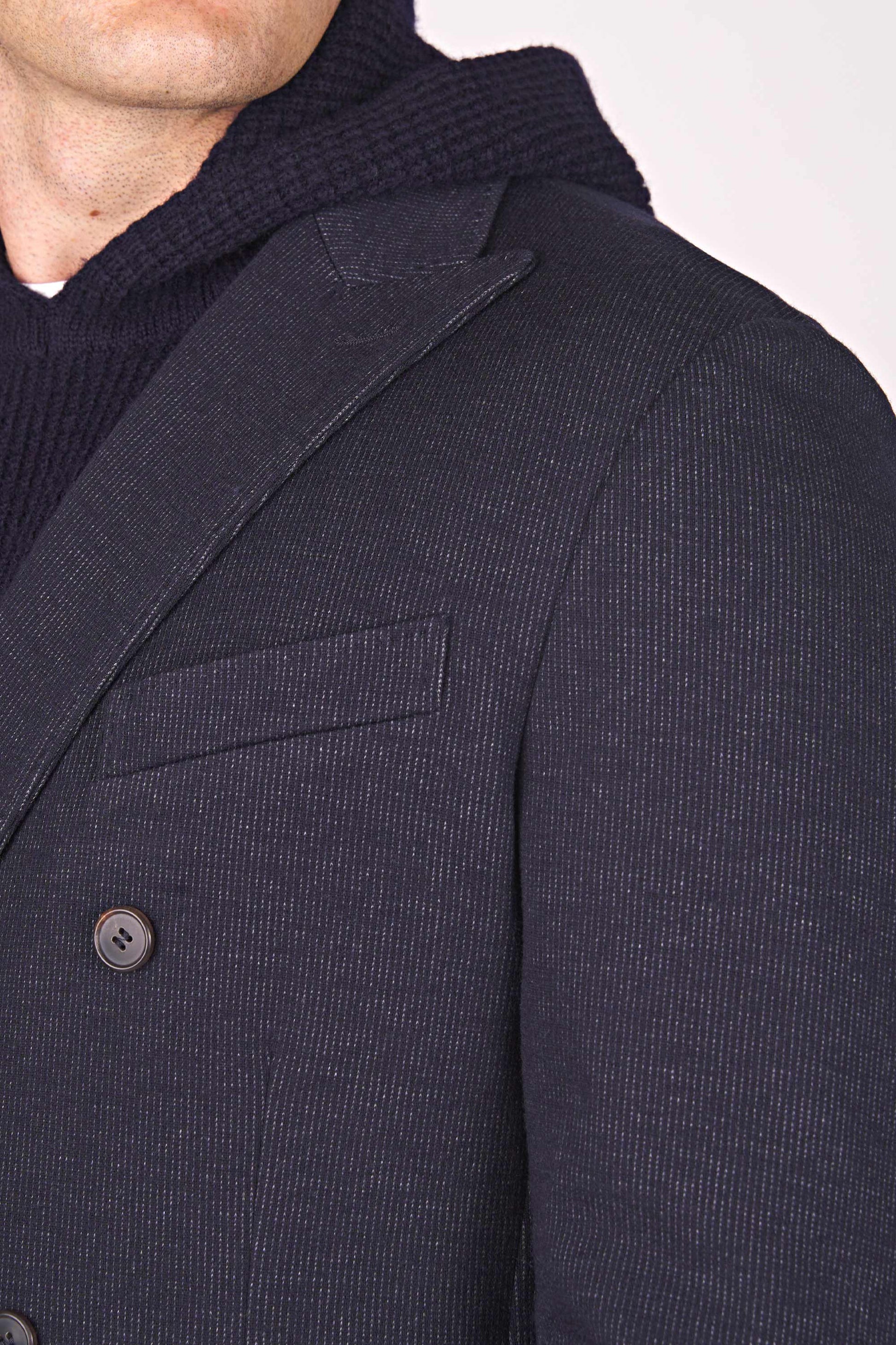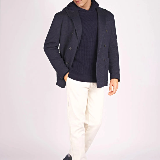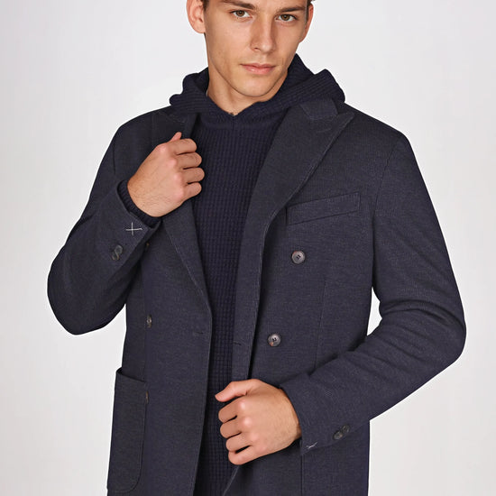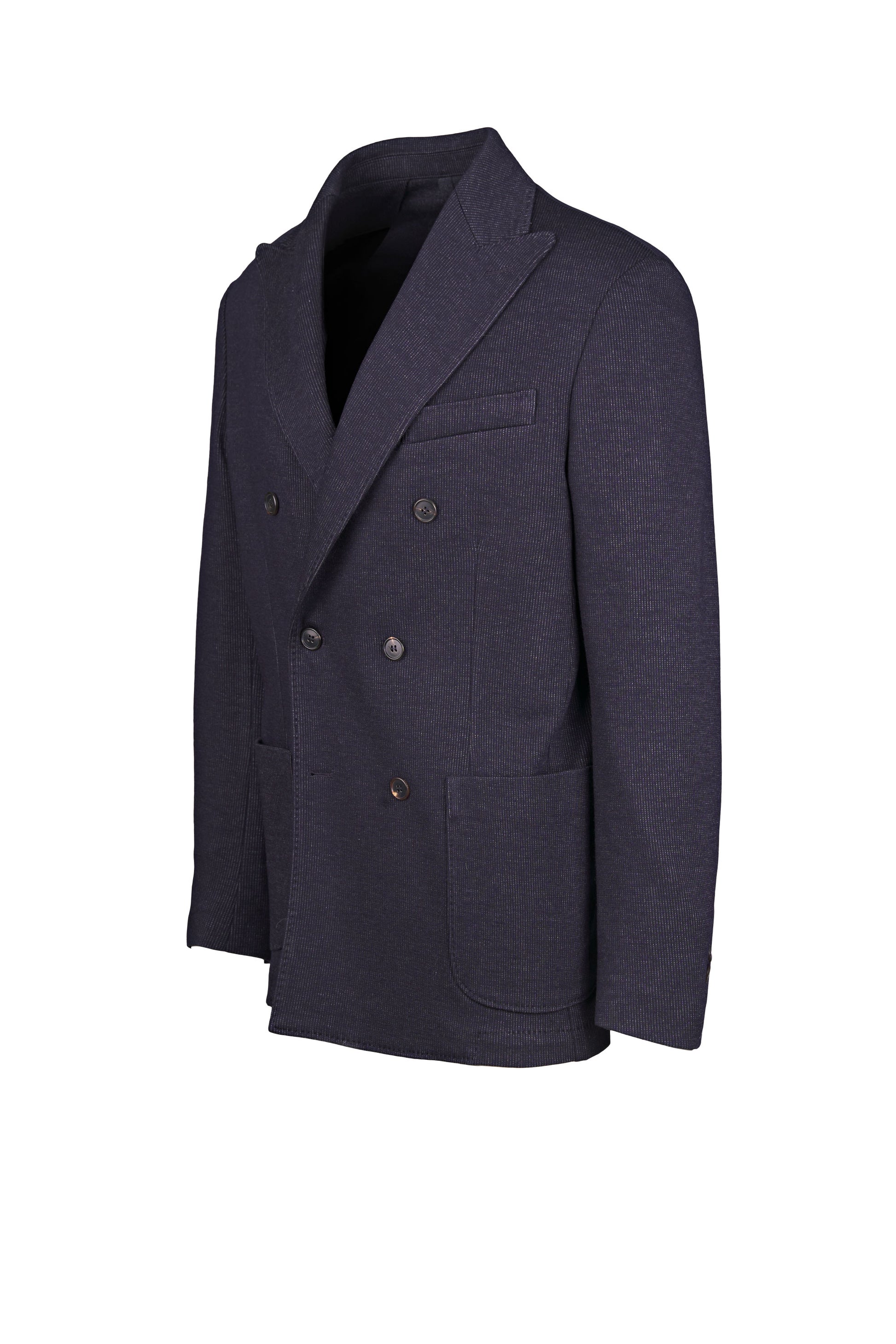 Experience luxury with our Doublebreasted Pinstriped Jersey Weave Jacket. Made from 100% pure virgin wool, this blazer features a fancy jersey weave and light pinstriped pattern. Its tailored fit and unlined design, along with a natural shoulder, provide both comfort and style. Upgrade your wardrobe with this timeless piece.