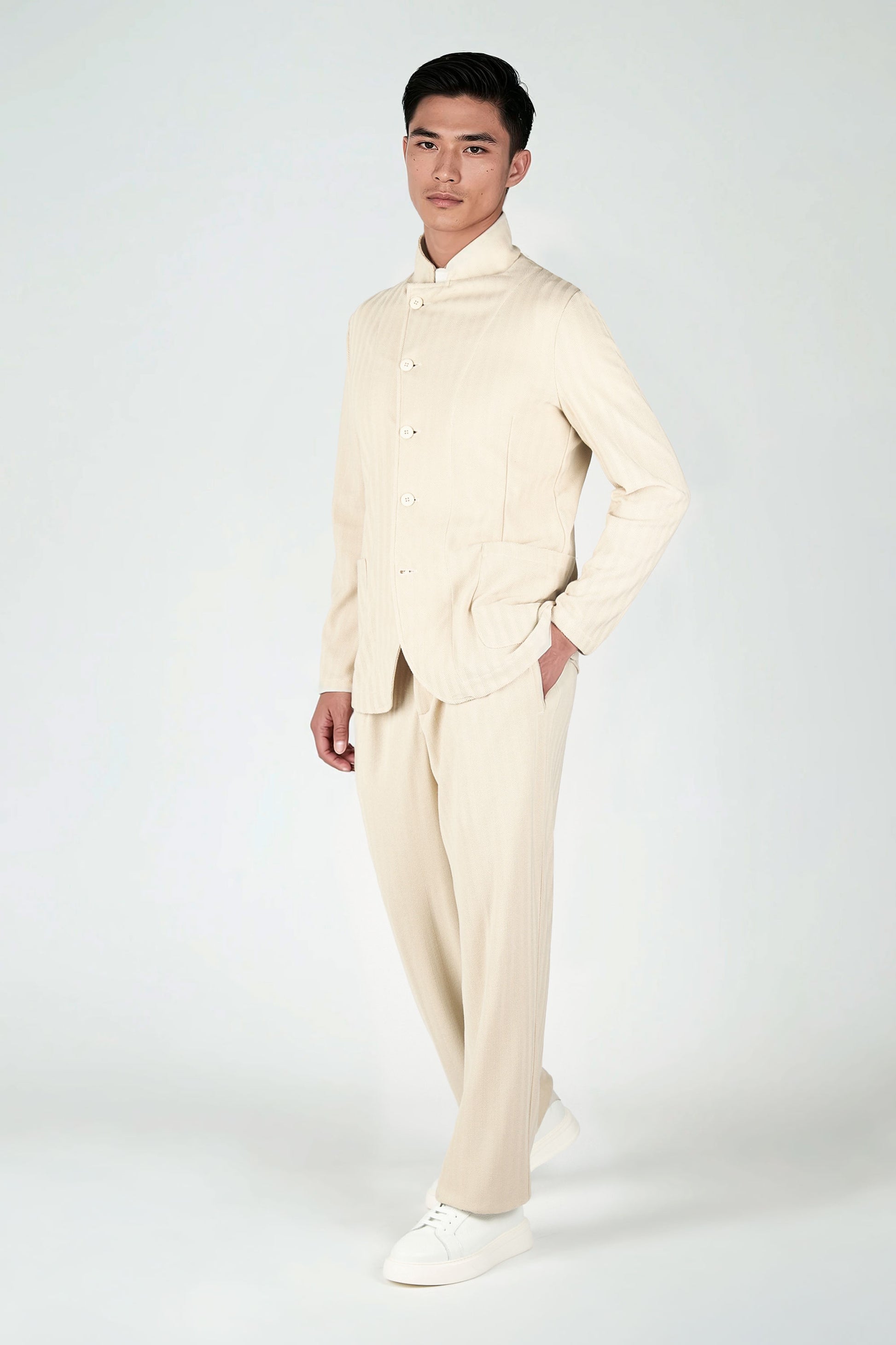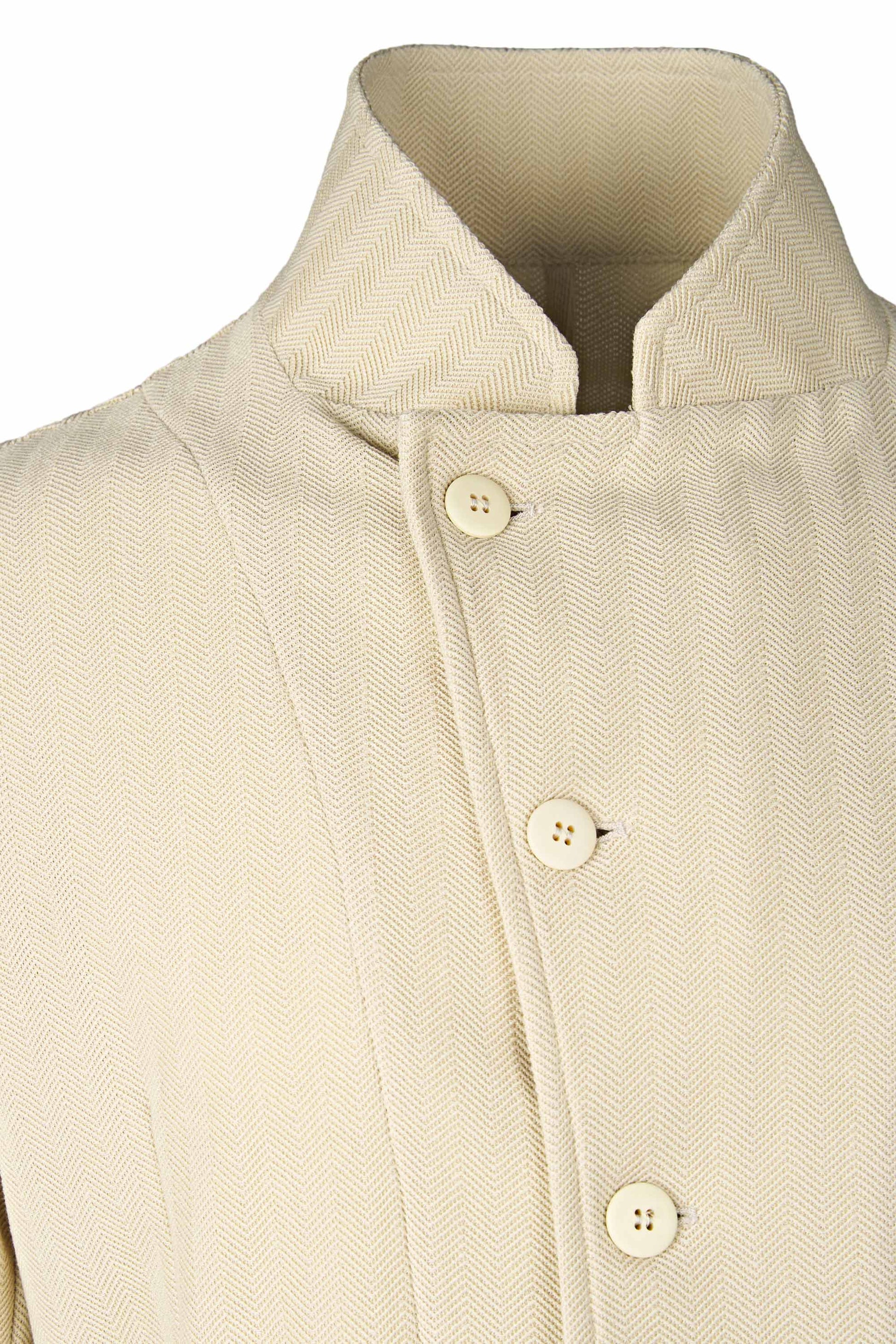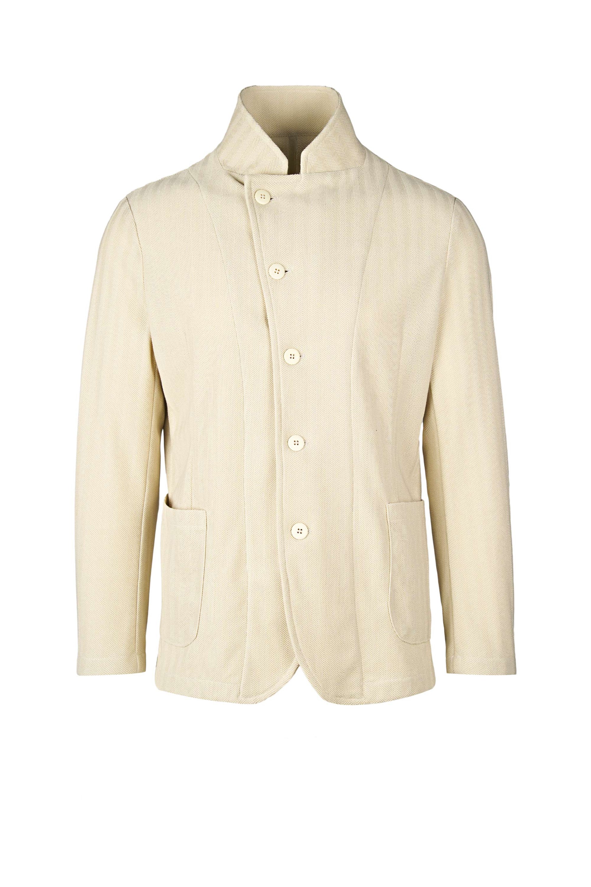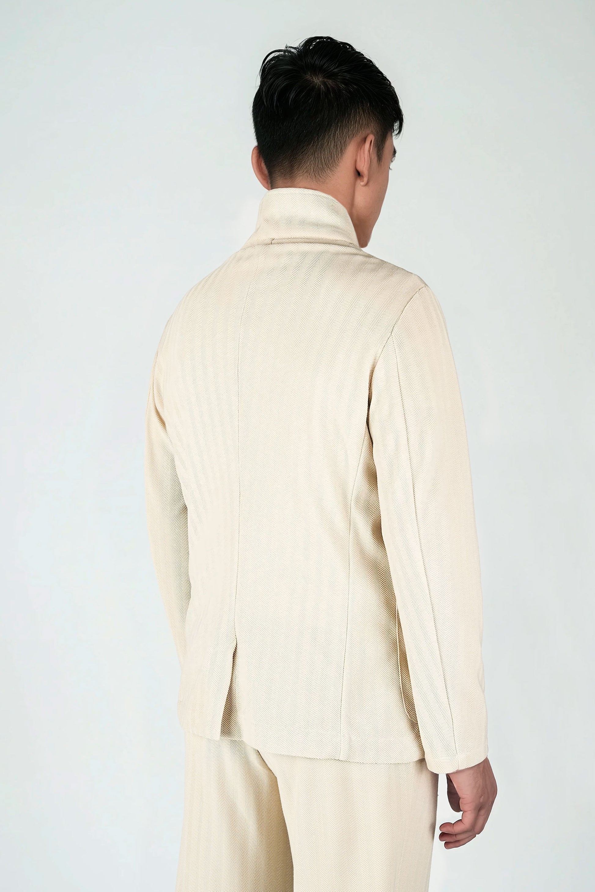Our star-collar style jacket, crafted in a refined herringbone fabric. A contemporary take on a timeless menswear essential, it features an exclusive collar design, elegant asymmetrical buttoning, and meticulous details that elevate its sophistication. With its distinctive pattern and modern silhouette, this jersey-fabric jacket is the ideal statement piece for those who appreciate timeless style with a fresh, contemporary twist.