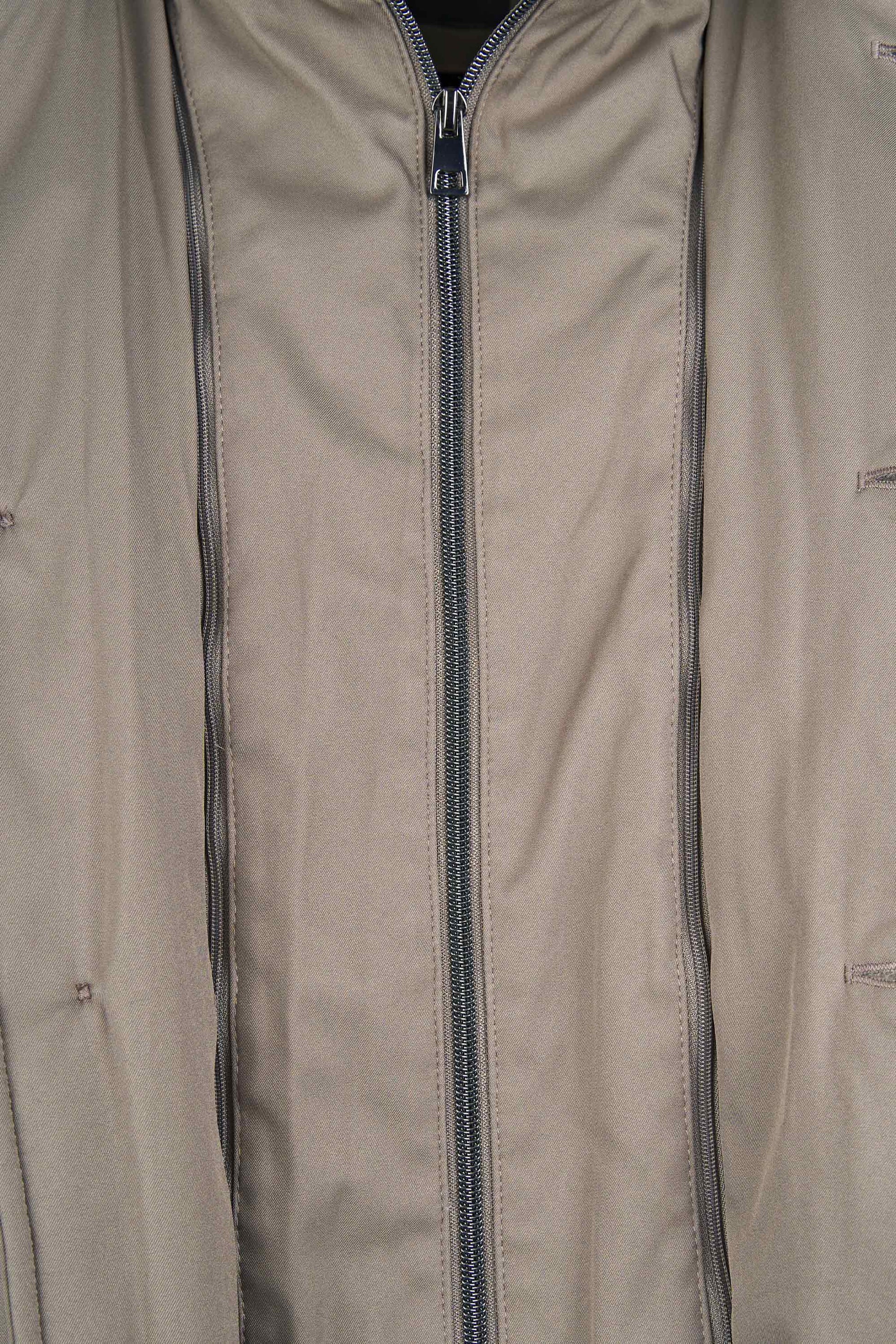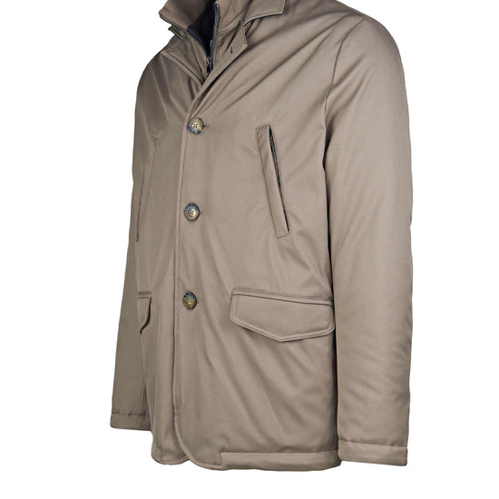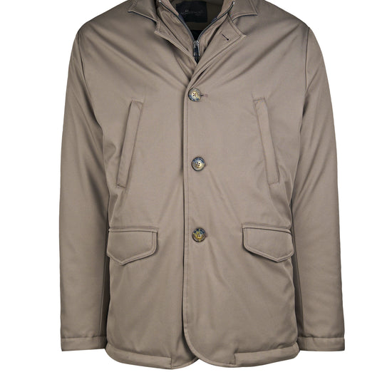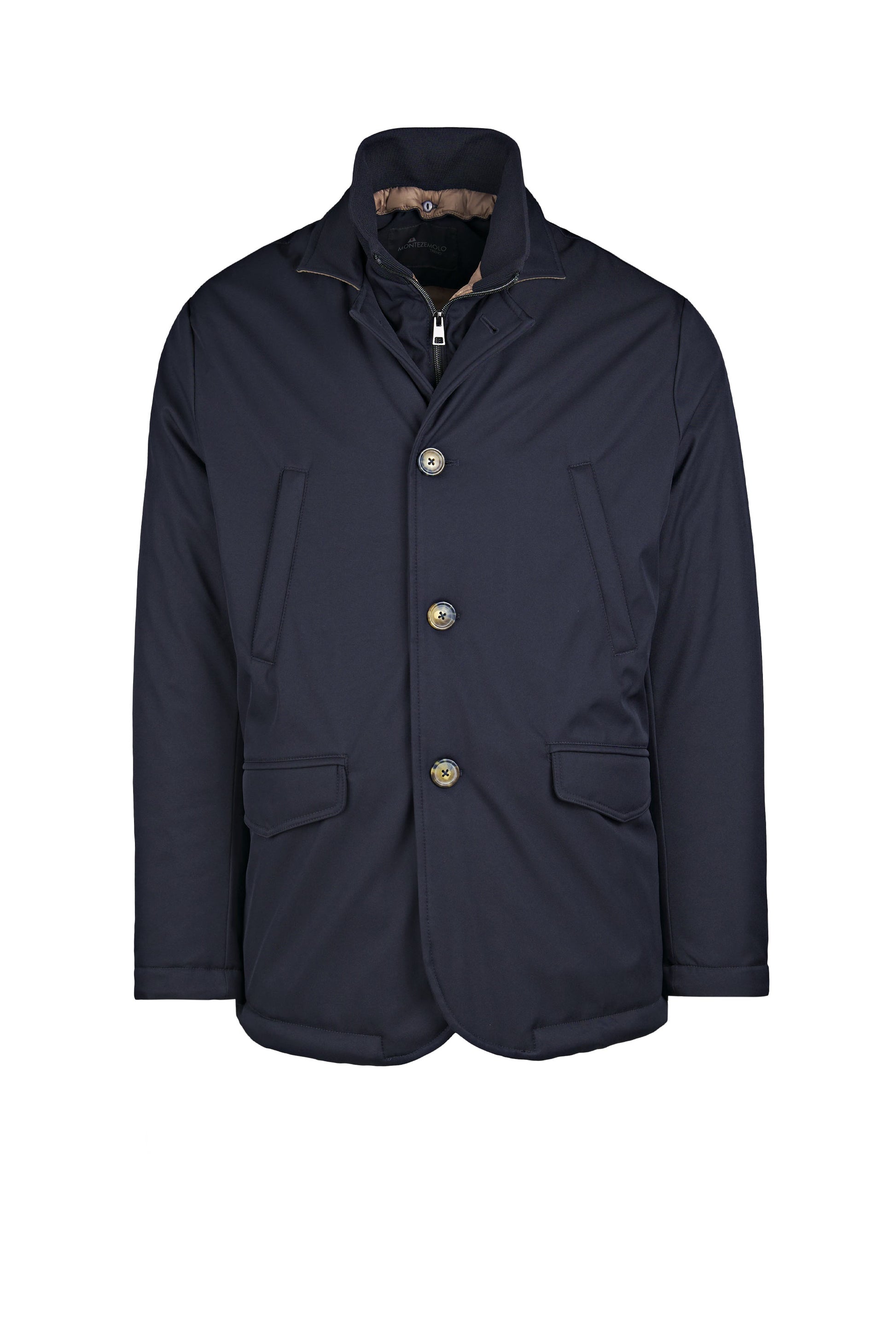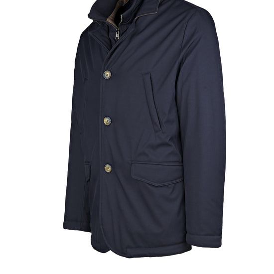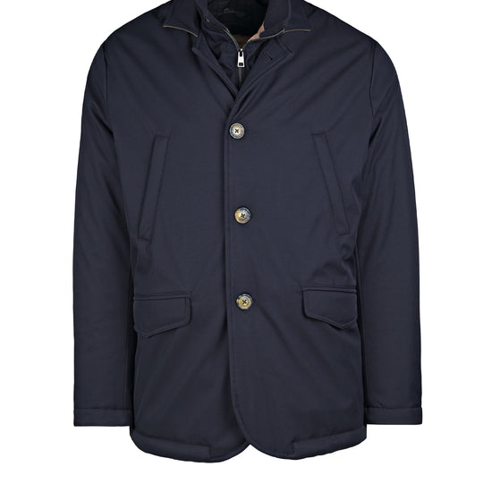 City-ready technical lightly padded jacket designed for transitional weather. Its standout feature is the detachable inner bib with a stand-up collar and zip closure: it zips in along the inside edges and comes off in seconds, letting you dial warmth up or down. The outer shell in nylon and polyester has a smooth, clean look. The front closes with three buttons and compact lapels; the hem is rounded with neat edge stitching. Pockets include two vertical welt hand-warmer pockets at the chest and two lower flap pockets with angled corners. Plain cuffs, tone-on-tone stitching and horn-effect buttons finish the piece. Regular fit, hip length. Available in two colors.