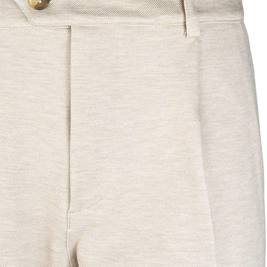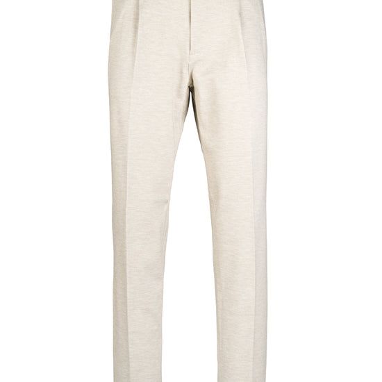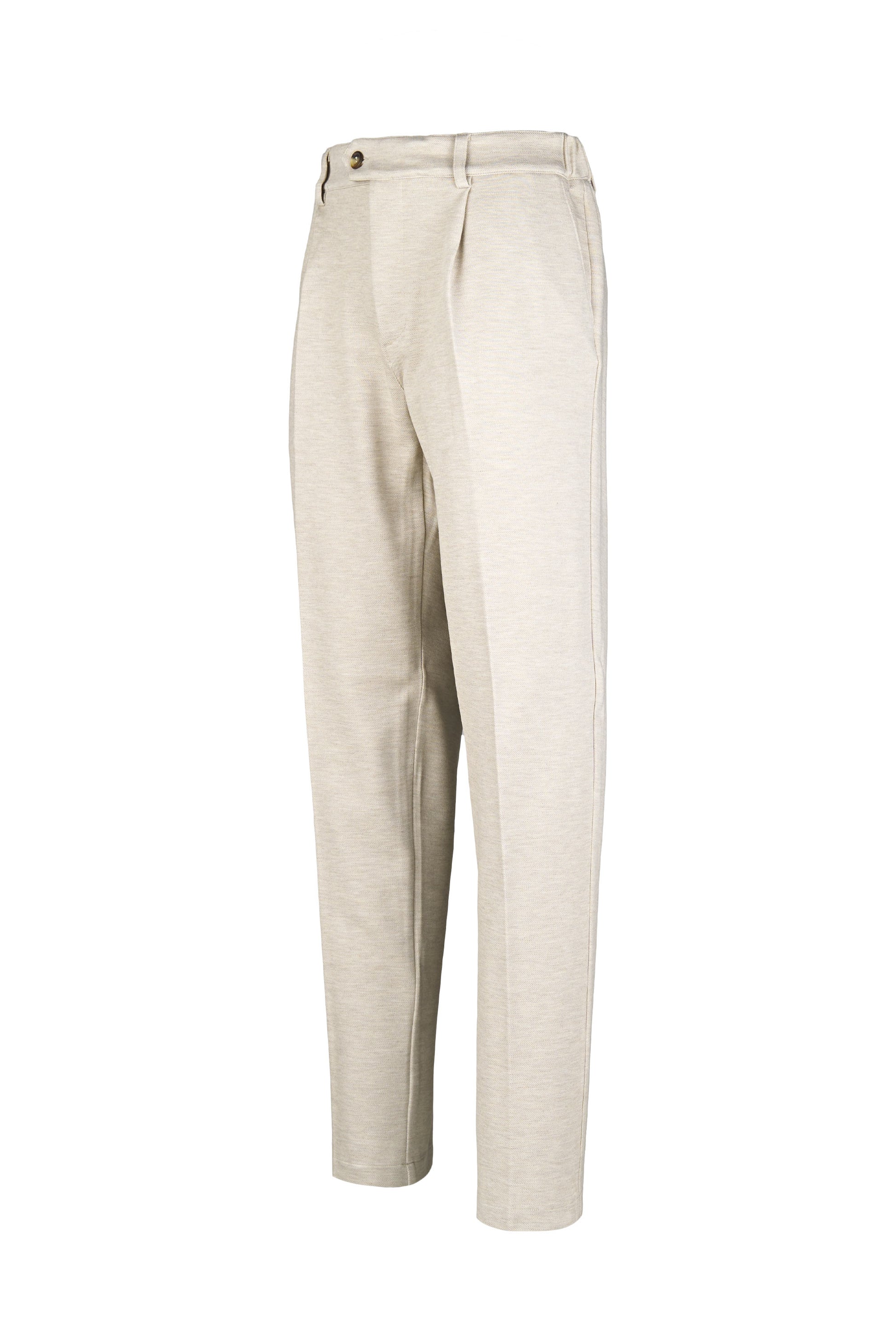 These trousers deliver tailored neatness with the ease of stretch jersey twill, featuring a refined mélange surface that drapes cleanly. The waistband comes with belt loops, a shaped tab with button and a zip fly; on the inside, discreet side elastic inserts provide adaptive comfort and a touch of extra give while preserving a crisp exterior look. A single pleat on each side offers controlled ease through the front, and the leg falls straight with a gentle taper to the hem. Slanted side pockets and welt back pockets complete the minimal design. Built for all-day wear, it pairs with a blazer for a relaxed yet polished suit, or with knitwear and sneakers/derbies for effortless smart-casual style. Available in three versatile colours—from mélange grey to light sand—to span business-casual and off-duty dressing.