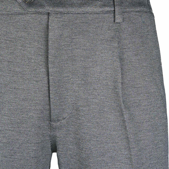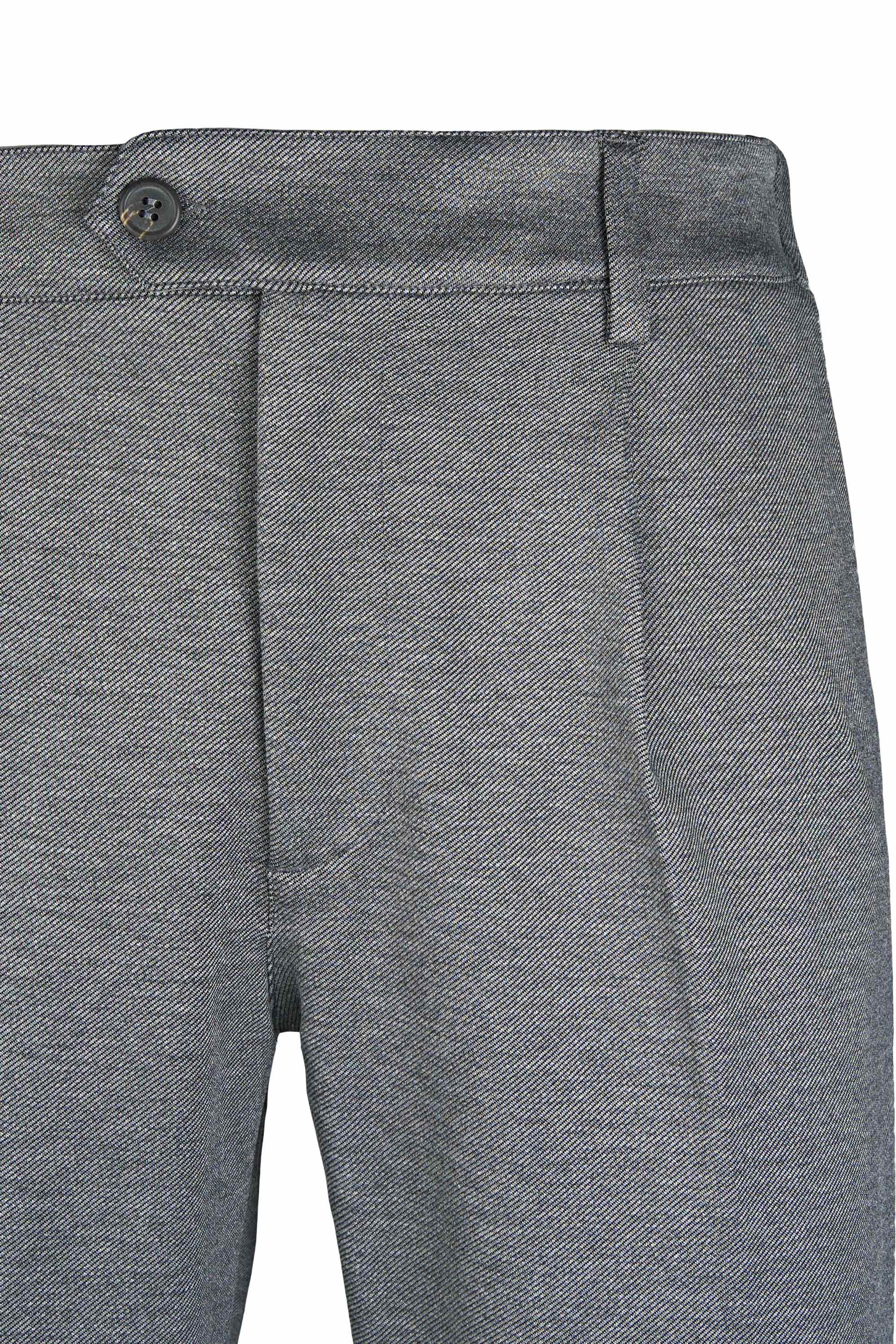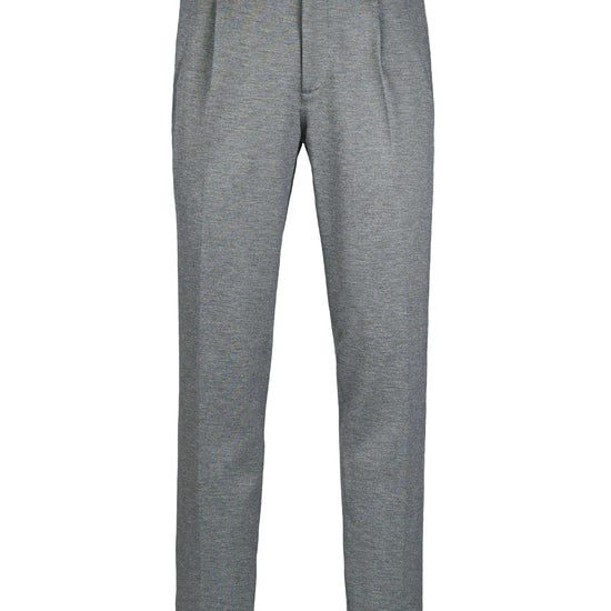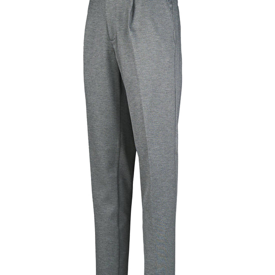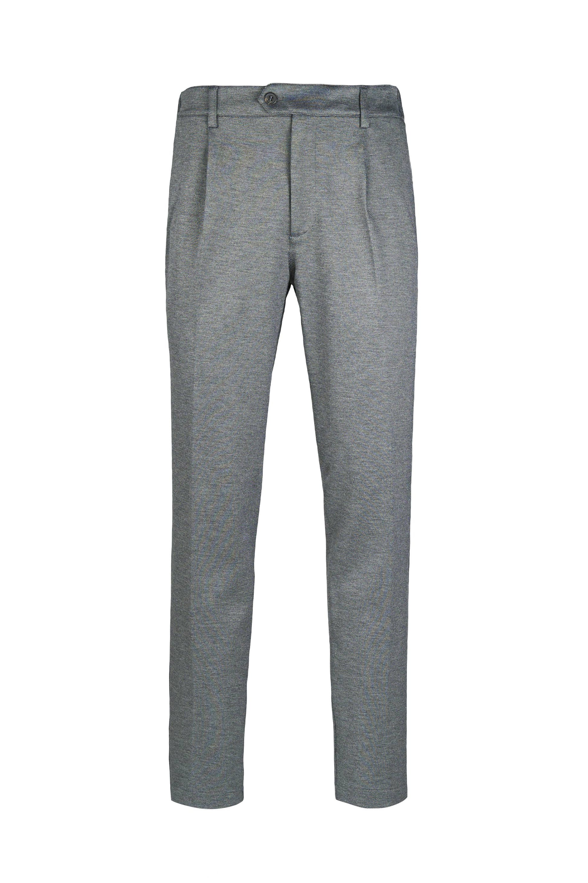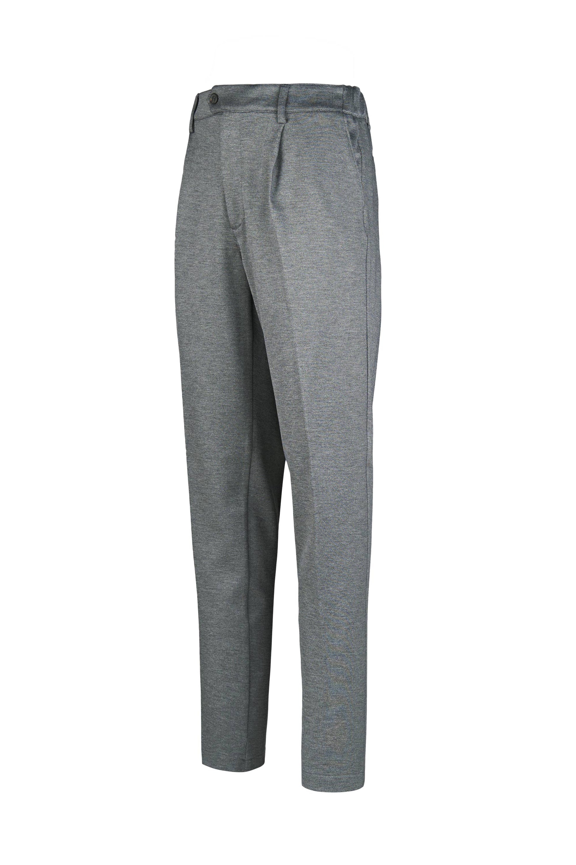 The waistband is finished with belt loops and a shaped extension tab with button, featuring hidden side elastics for dynamic comfort and adaptive fit. The closure is a zip fly with a clean front and tone-on-tone stitching. The pockets are slanted at the front and welted at the back for a tidy profile. The construction features one pleat per side to add ease without losing the line. The silhouette is modern and gently tapered with a straight hem at the ankle. The fabric is a compact, stretch jersey twill with a mélange look, designed for comfort, breathability and shape retention. The finishing includes horn-effect buttons and precise top-stitching for durability.