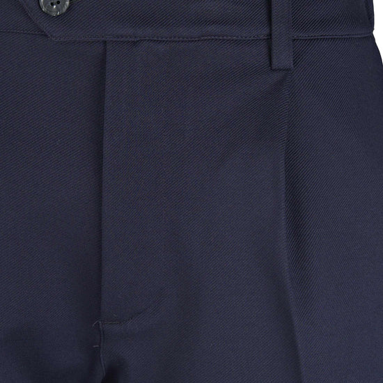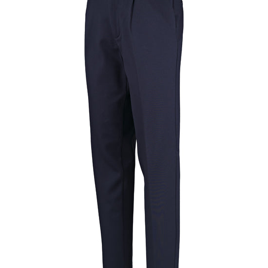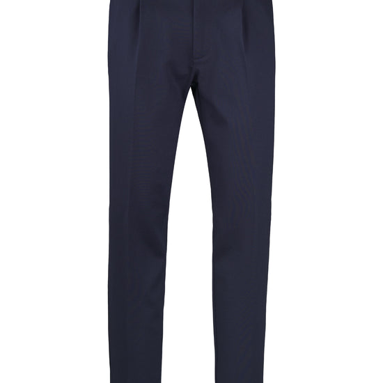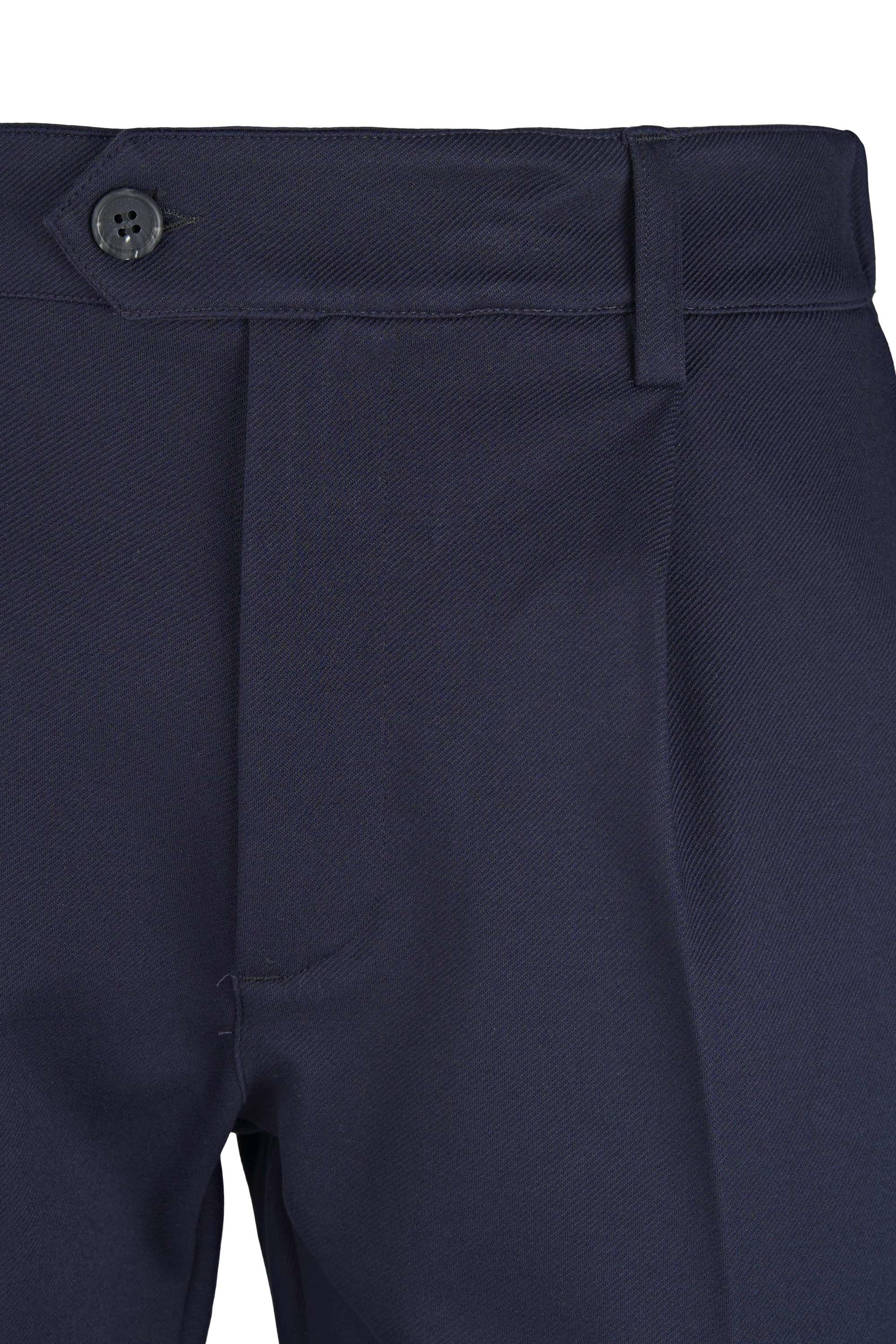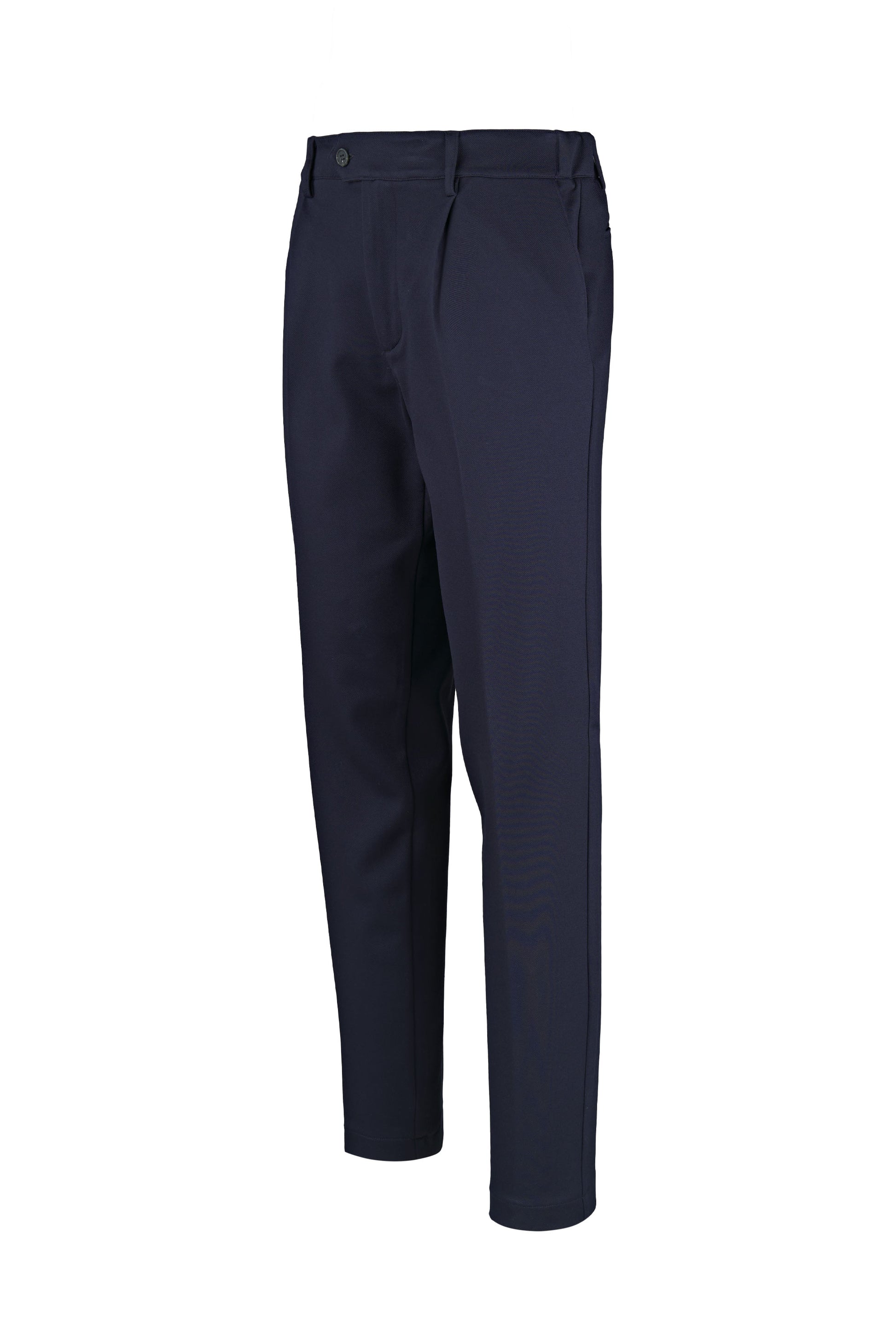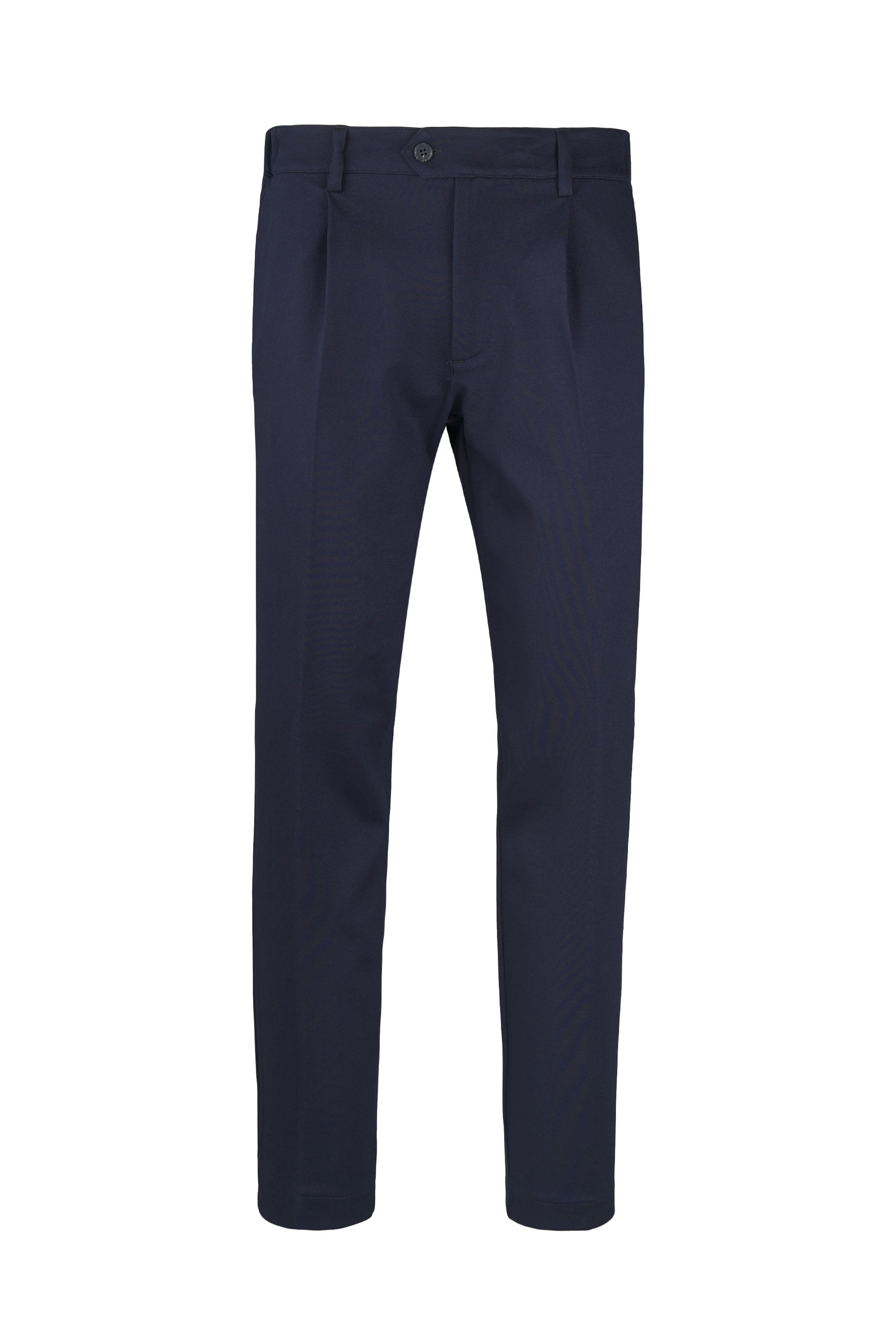 The waistband is finished with belt loops and a shaped extension tab with button, featuring hidden side elastics for dynamic comfort and adaptive fit. The closure is a zip fly with a clean front and tone-on-tone stitching. The pockets are slanted at the front and welted at the back for a tidy profile. The construction features one pleat per side to add ease without losing the line. The silhouette is modern and gently tapered with a straight hem at the ankle. The fabric is a compact, stretch jersey twill with a mélange look, designed for comfort, breathability and shape retention. The finishing includes horn-effect buttons and precise top-stitching for durability.