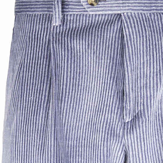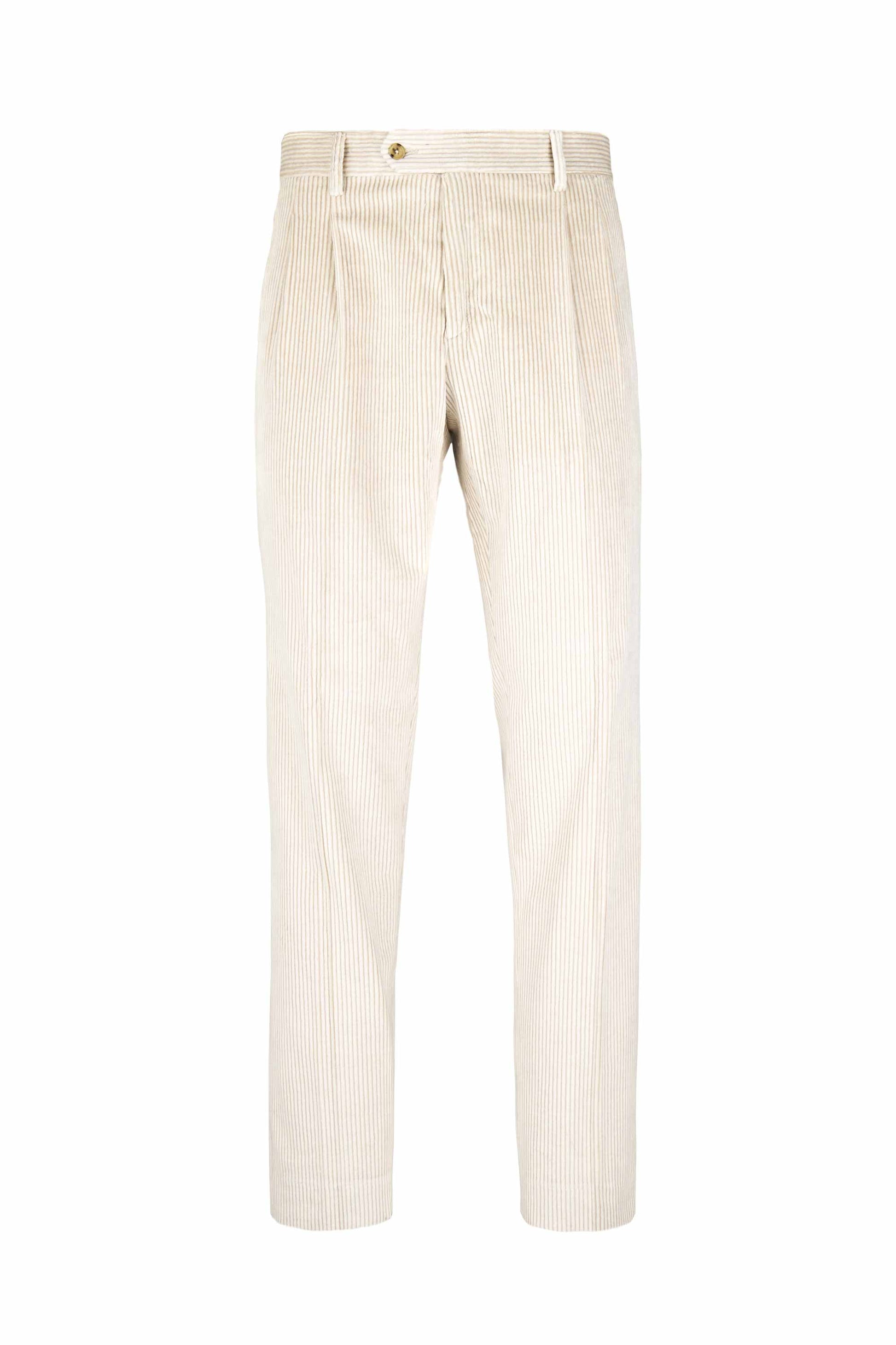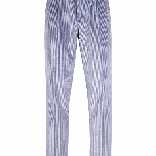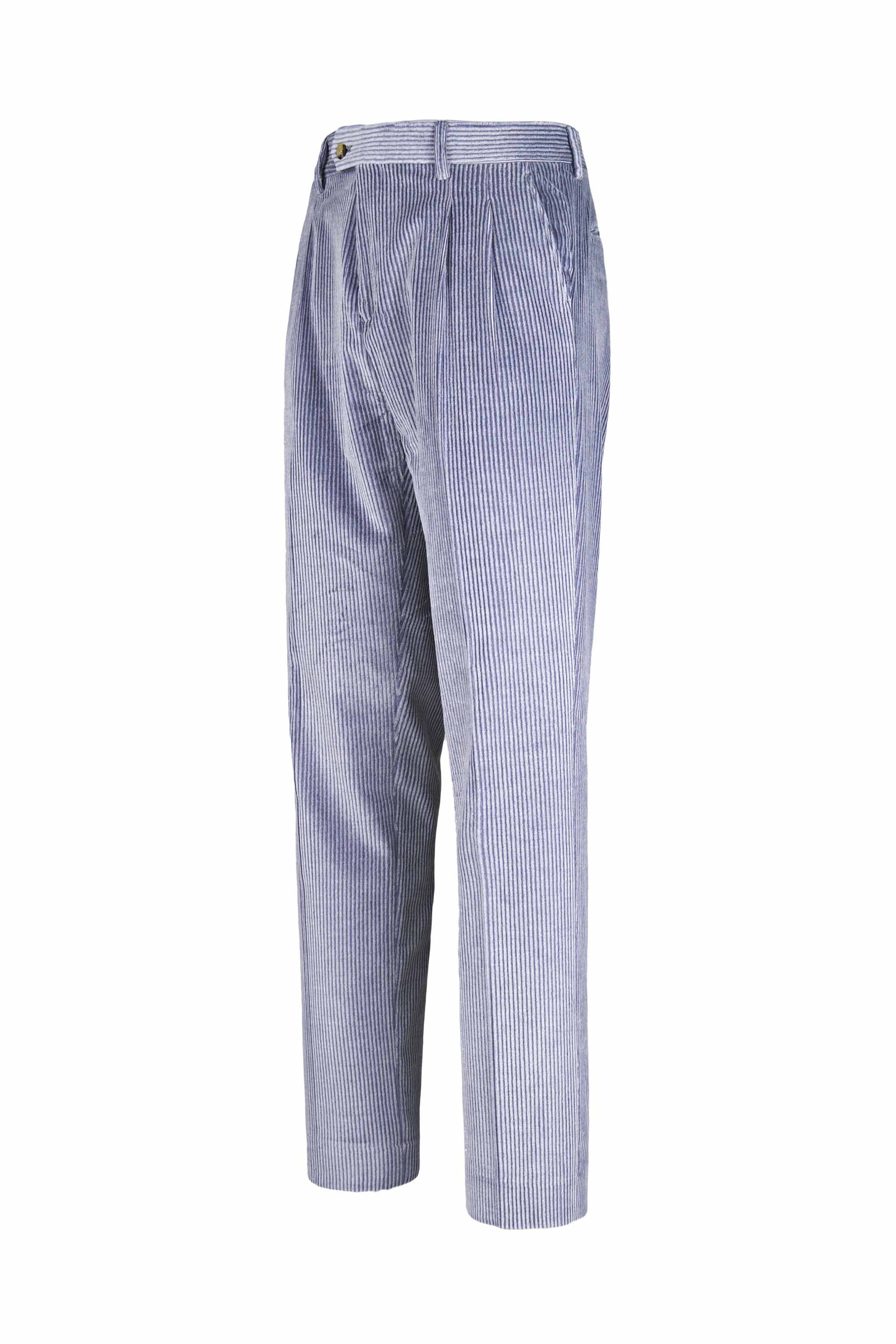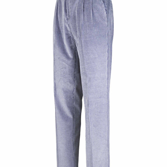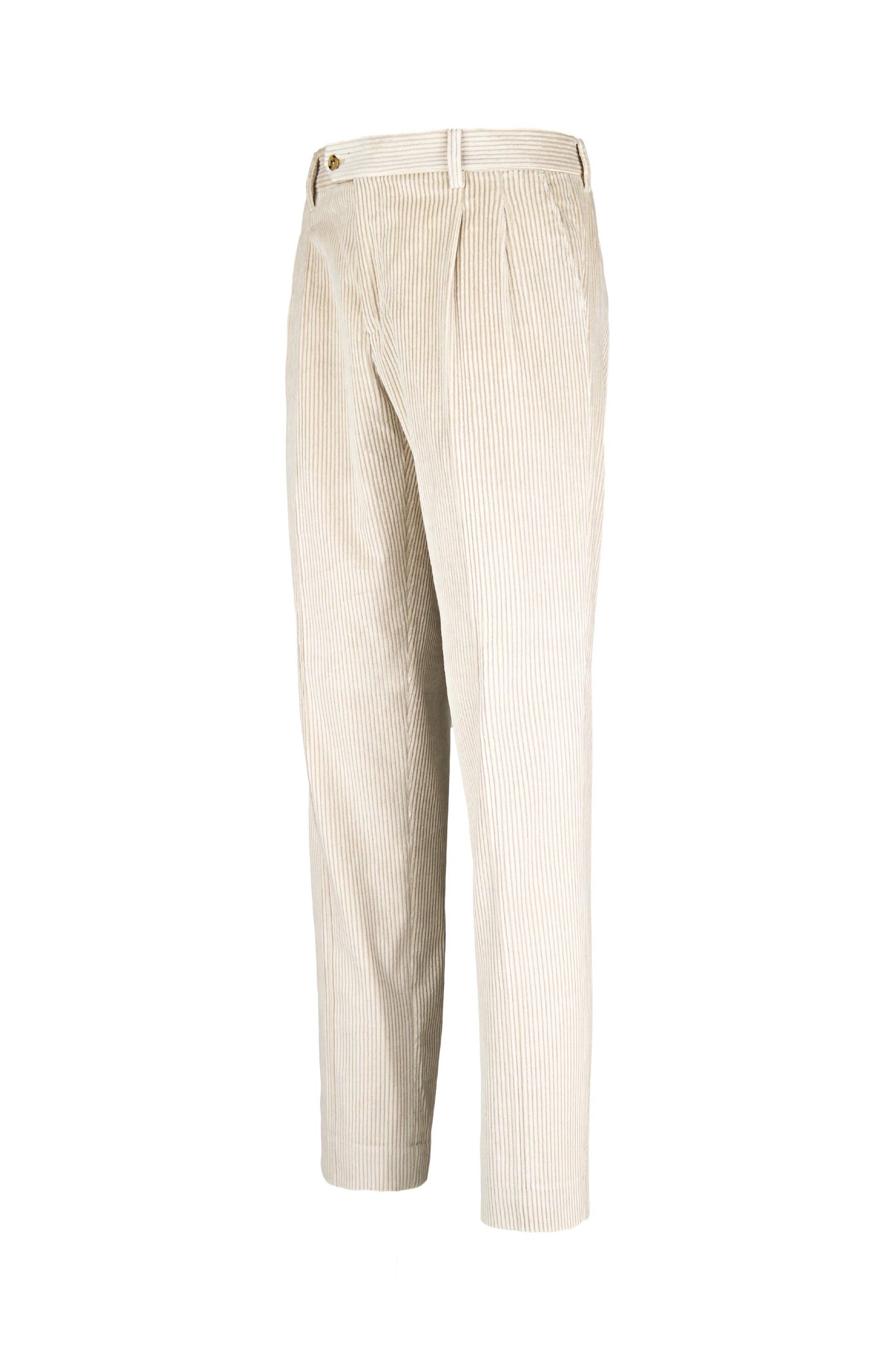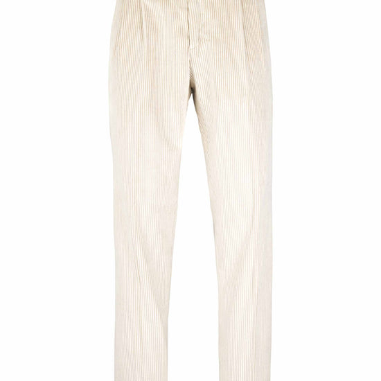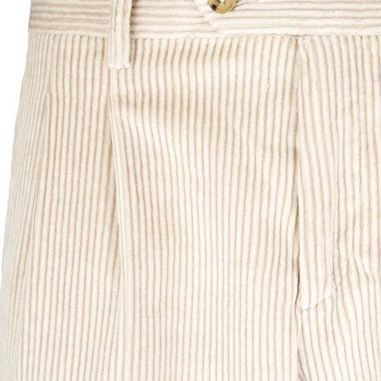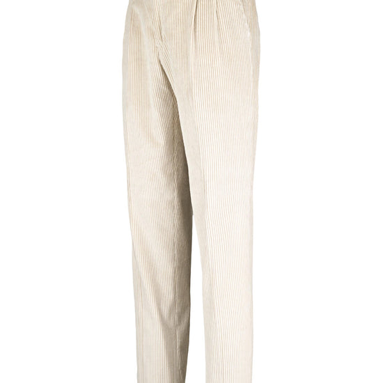Leisure fit trousers crafted from luxurious fine-ribbed corduroy, made with a refined blend of cotton & cashmere wool lightly strecth for an exceptionally soft feel and effortless comfort. The front pleat adds volume to the upper leg, giving structure while maintaining relaxed movement. The simple hem completes a laid-back yet elegant silhouette ideal for casual sophistication. Finished with a visible waistband button and vertically ribbed texture that elongates the figure with subtle tailoring appeal.