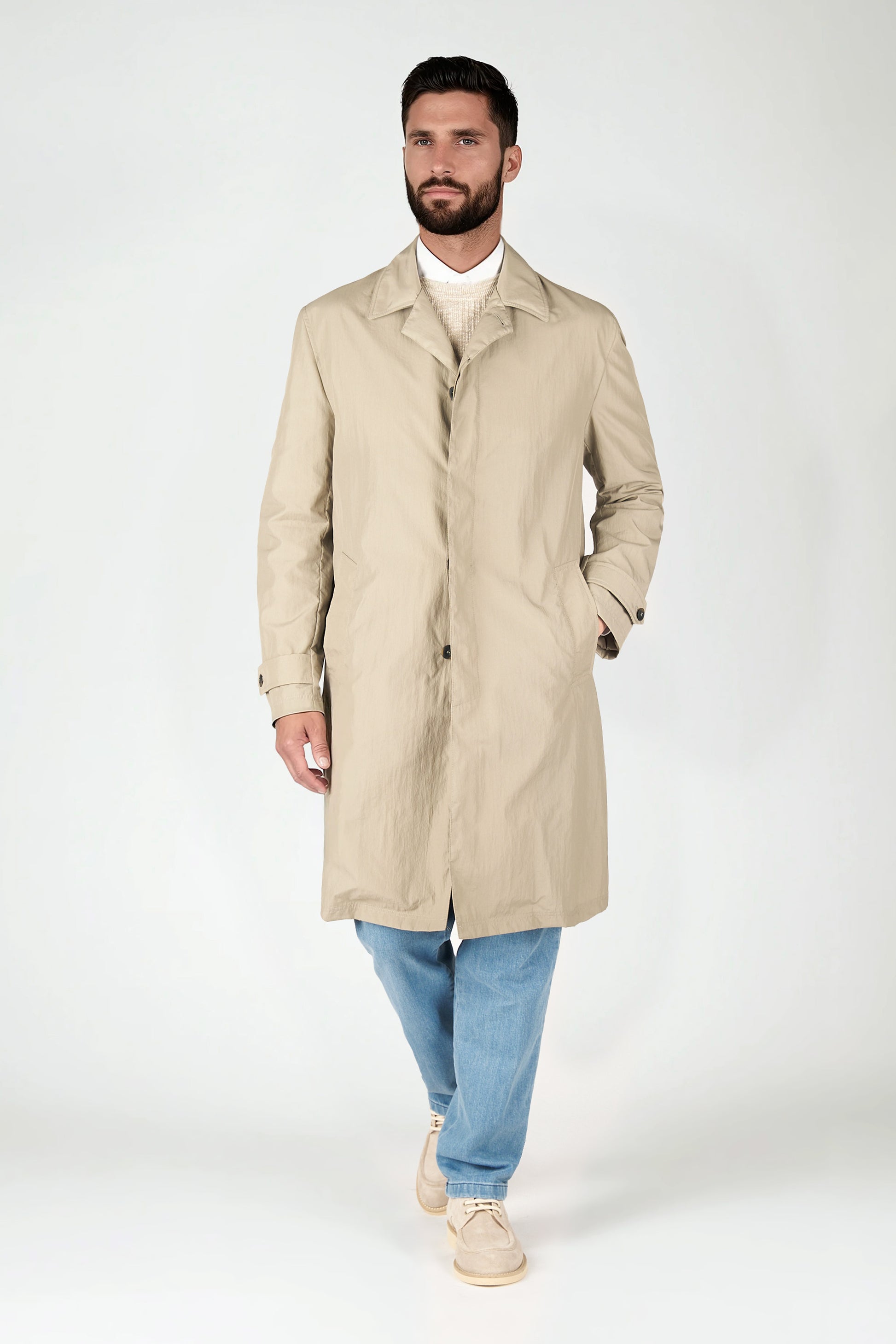 Classic single-breasted raincoat crafted from gabardine fabric. Features traditional lapel collar, buttoned front fastening, and angled side pockets. A timeless garment, perfect for staying stylish on spring days.