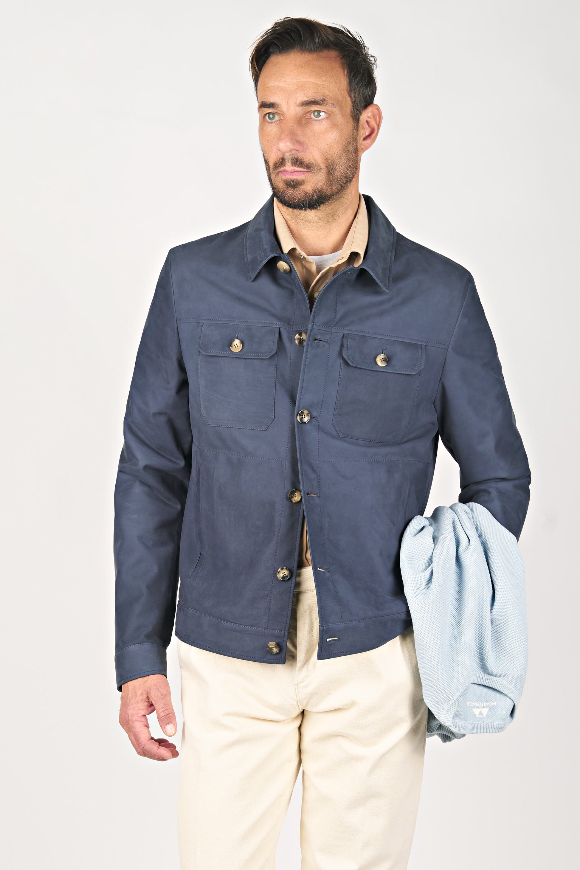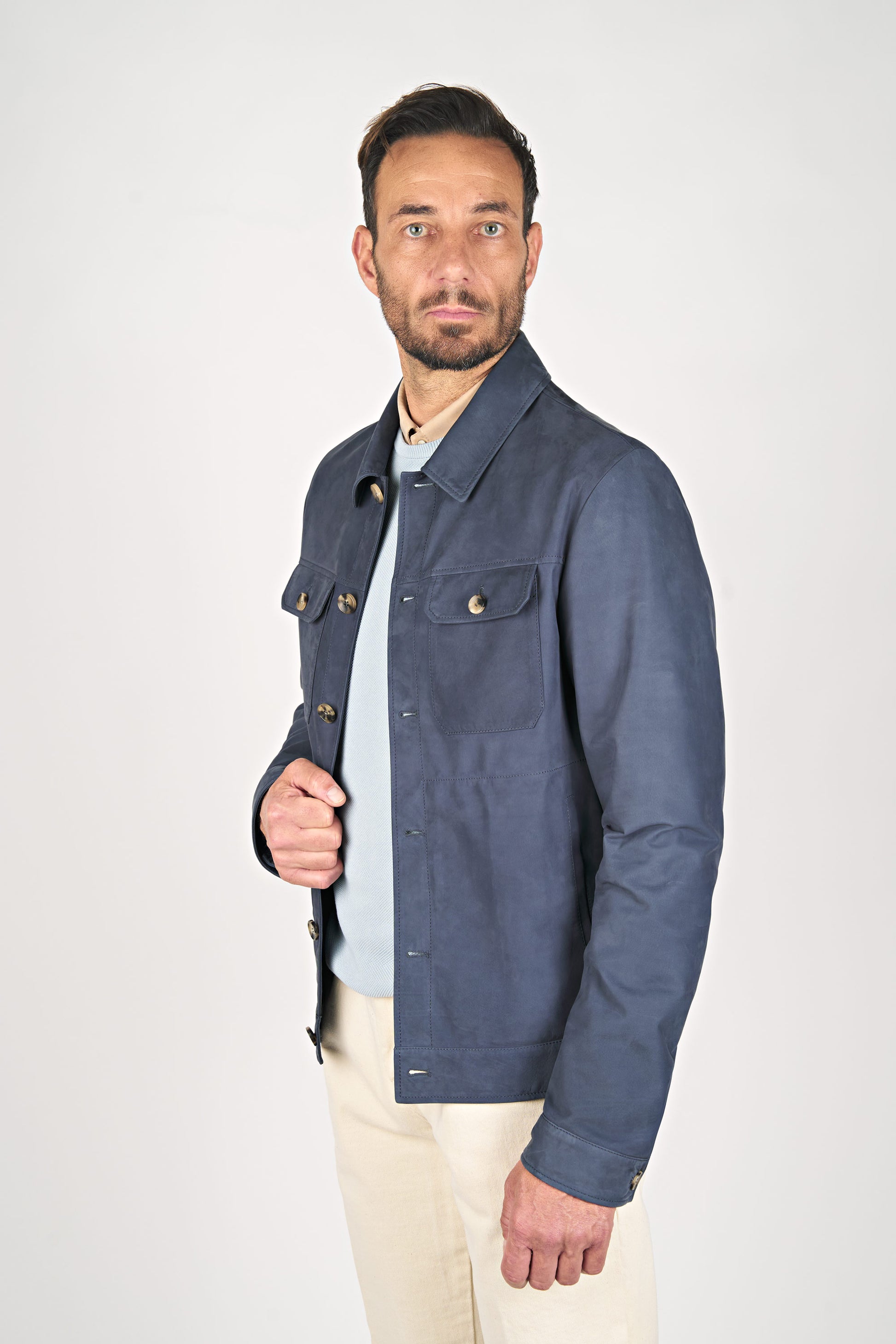 Our nubuck leather trucker jacket, a timeless piece crafted from high-quality leather. This jacket features a classic trucker style with a sleek and luxurious finish. It boasts a button-up front closure, chest pockets with button fastening, and side pockets for added convenience. With its versatile design and premium construction, this jacket effortlessly elevates any outfit.