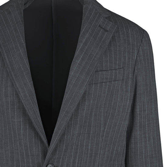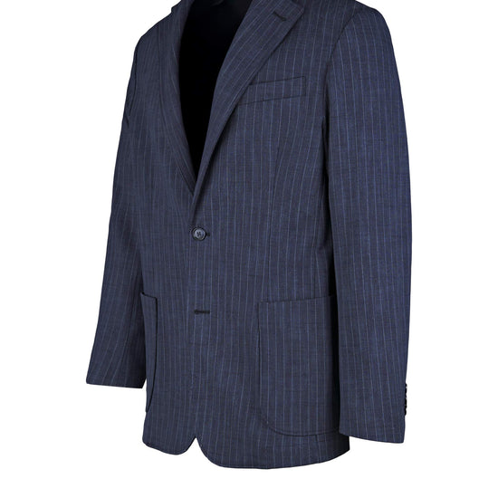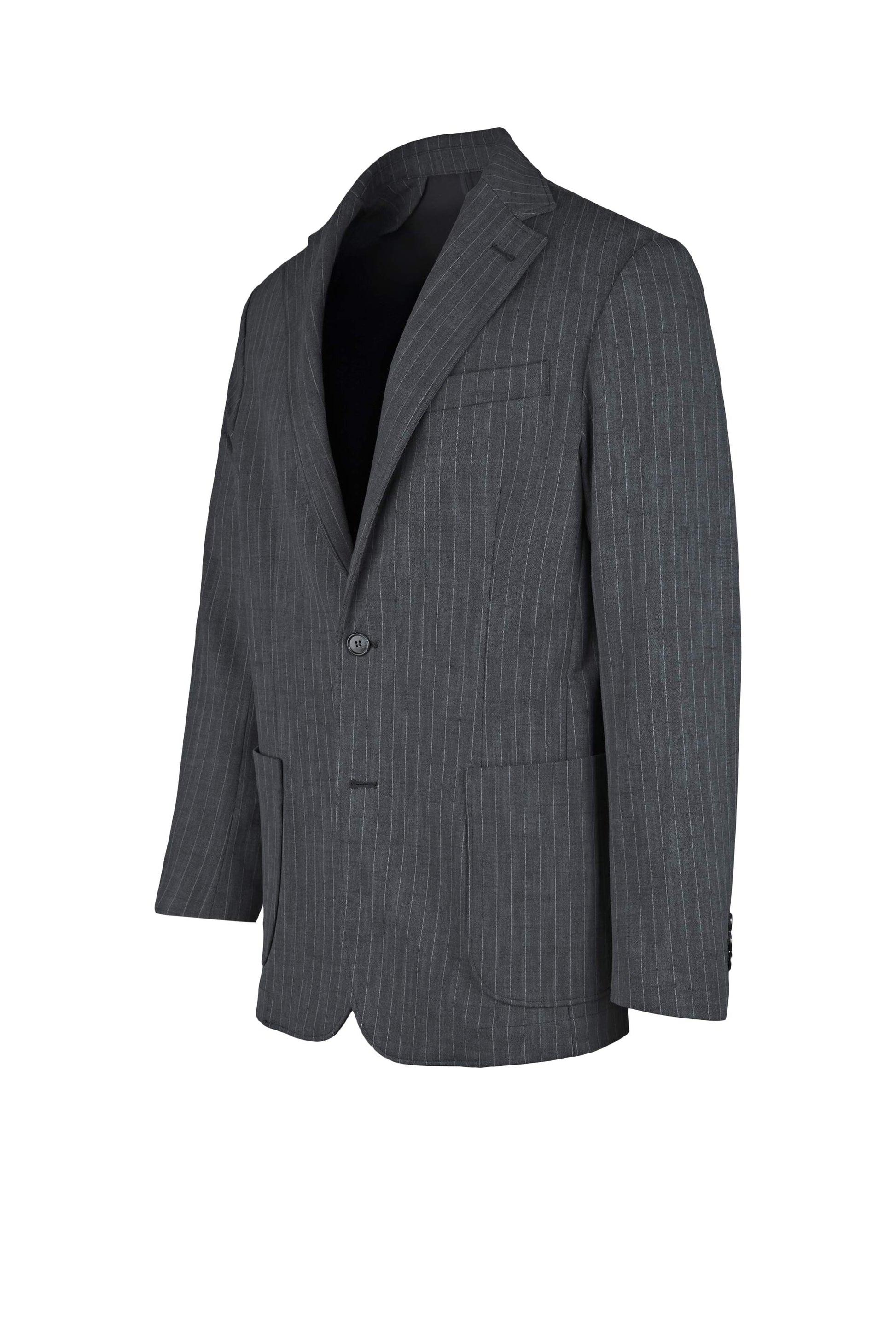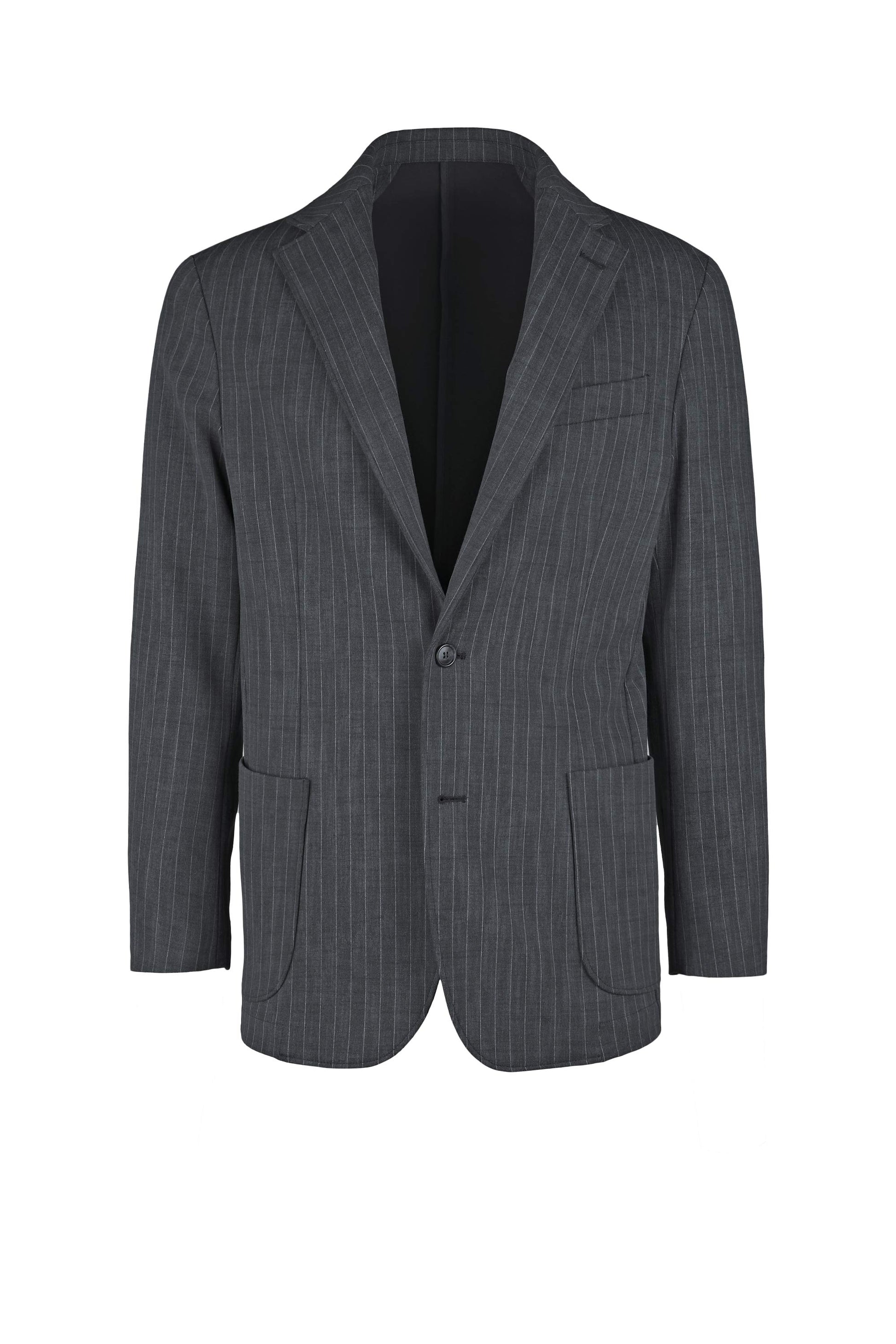 Single-breasted, 2-button closure; classic notch lapel with buttonhole; lightweight/partially unlined construction for breathability; natural shoulder with minimal padding; rounded patch hip pockets; welt chest pocket; rounded hem and neat top-stitching; compact pinstripe jersey with stretch and crease resistance; tone-on-tone buttons with cross-stitching.