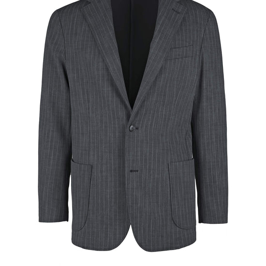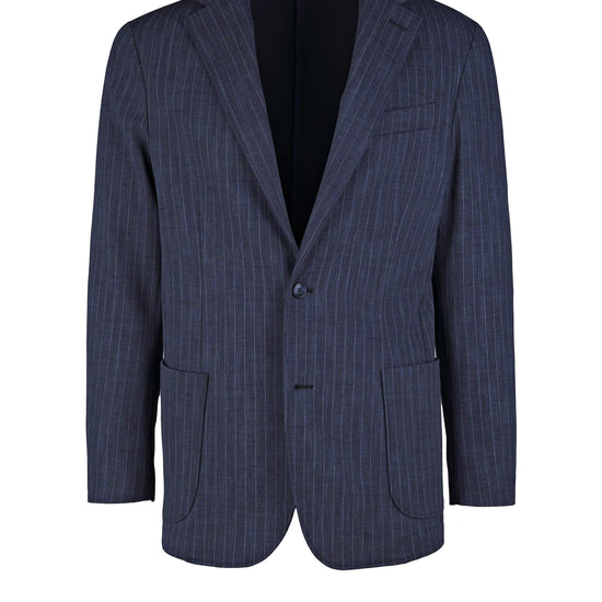 Tailored look, everyday ease. This ZMART pinstripe jersey blazer blends suiting polish with knit comfort. The jacket is lightly constructed and unstructured, featuring a two-buttons front and classic notch lapel for a clean, modern line. Rounded patch pockets and a welt chest pocket add contemporary tailoring character, while the dense, stretchy jersey holds its shape and resists creasing—perfect for business-casual days and travel.