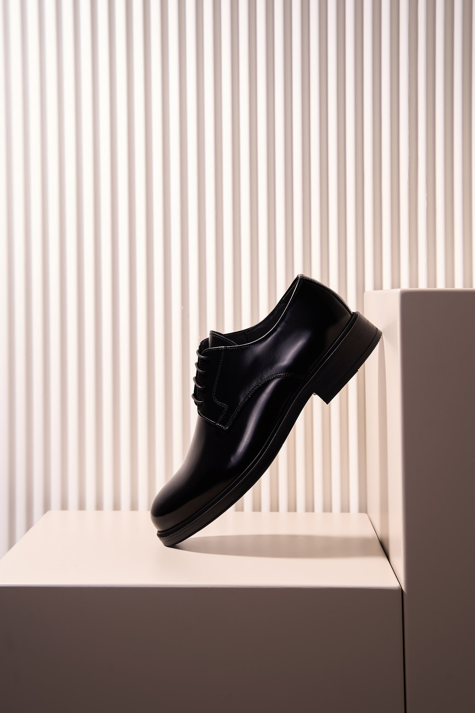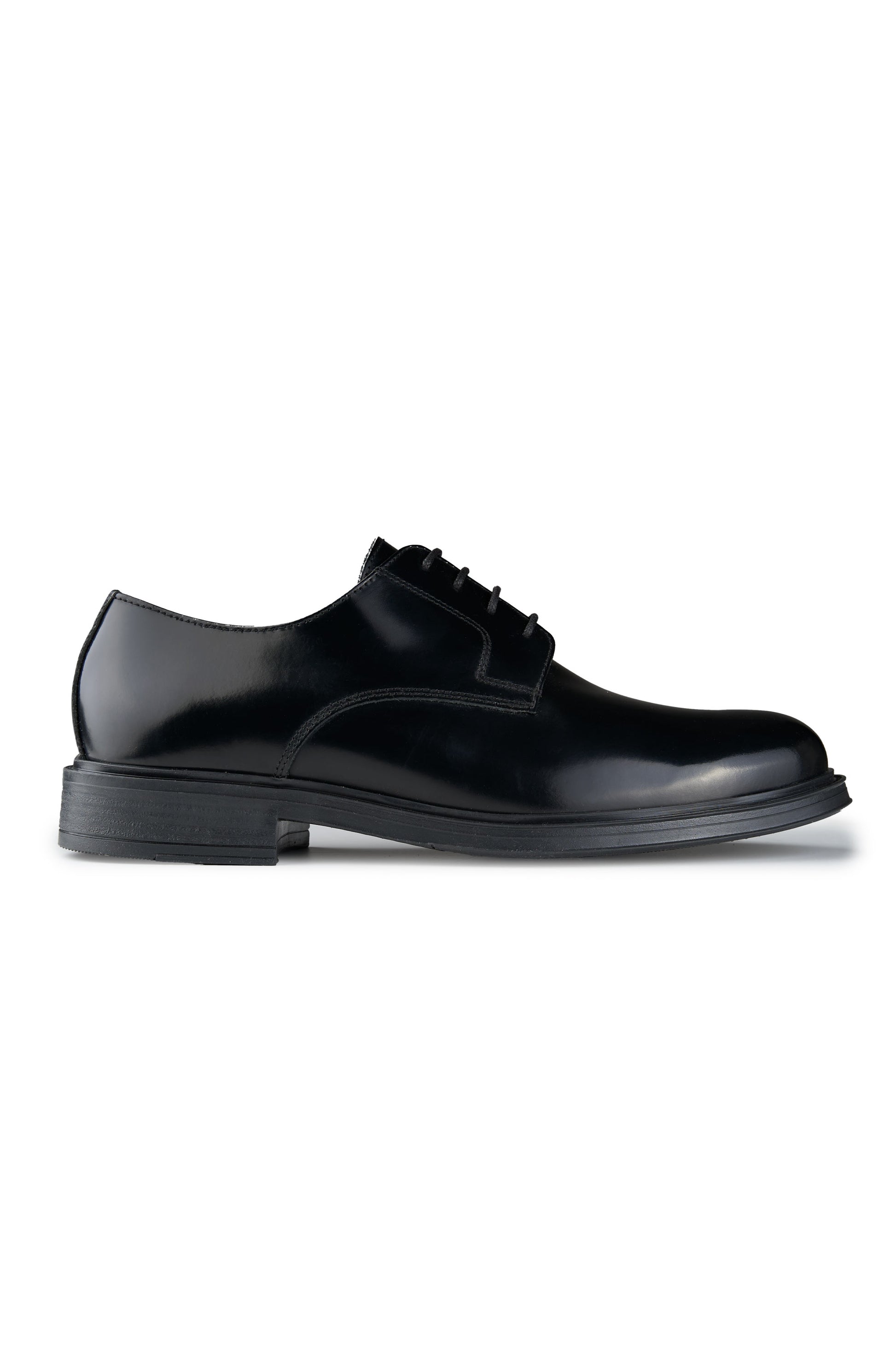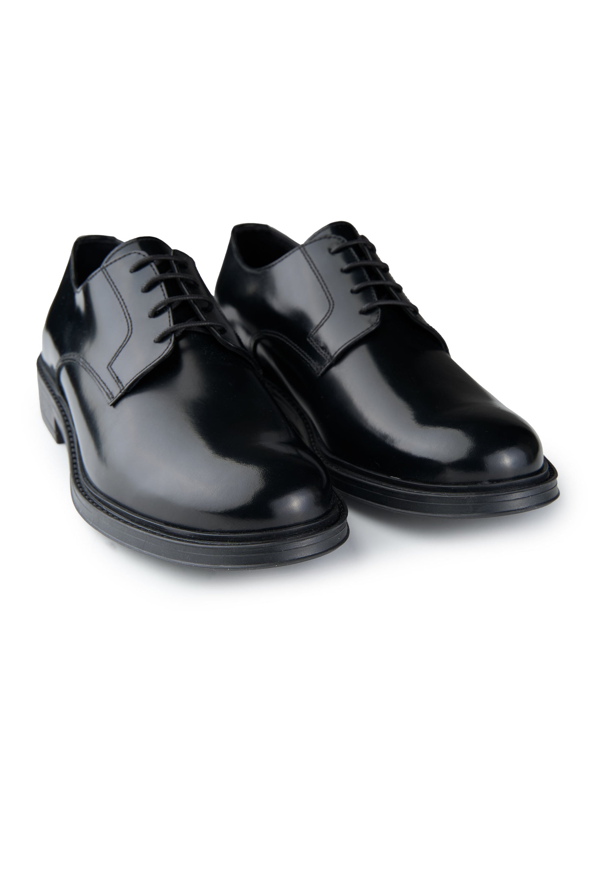 Formal derby shoes crafted from premium polished black leather, featuring a timeless and refined silhouette. Meticulously handmade with exceptional attention to detail, these shoes boast a classic lace-up closure, durable stitched rubber soles, and a sturdy, long-lasting construction.