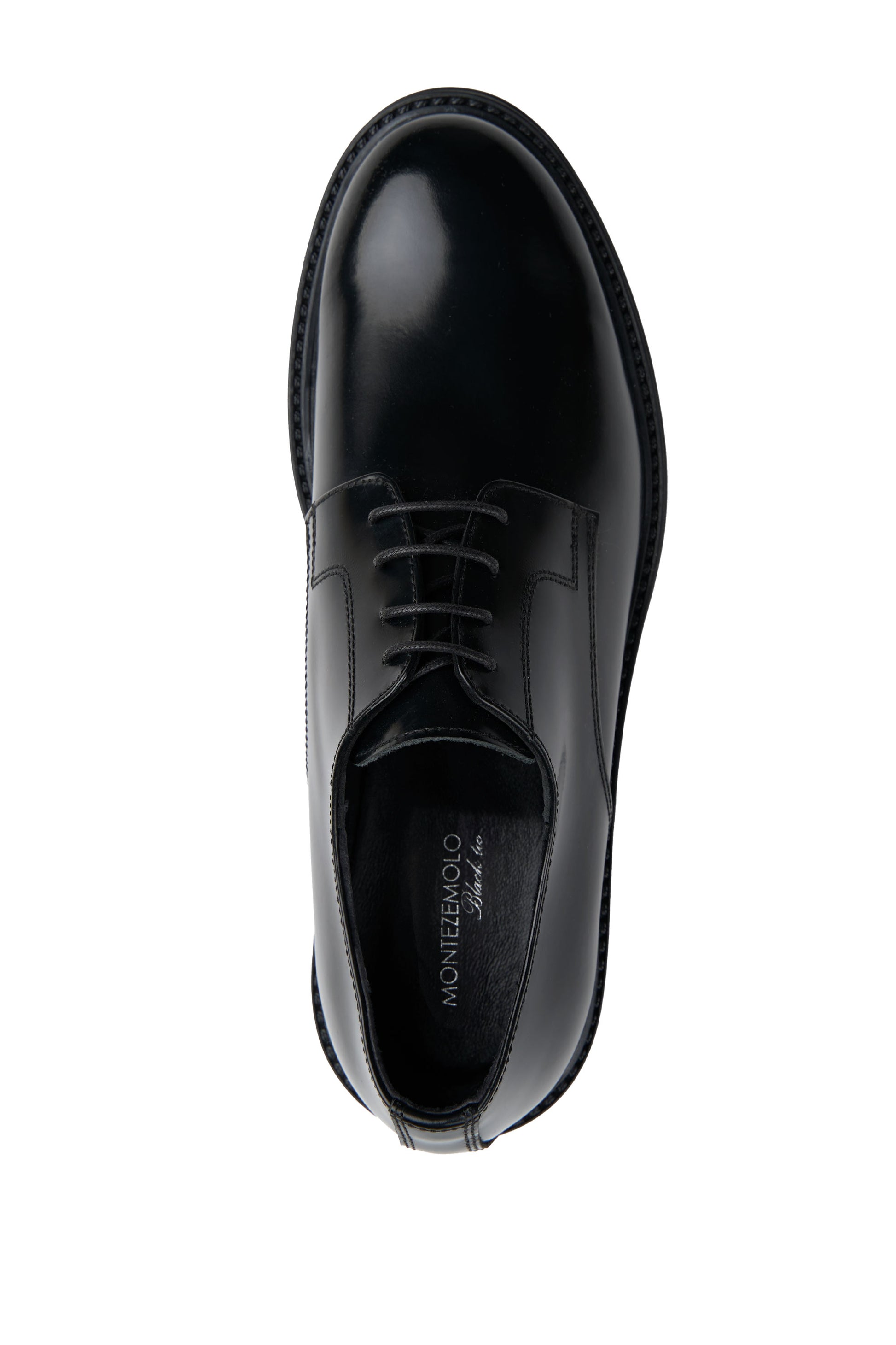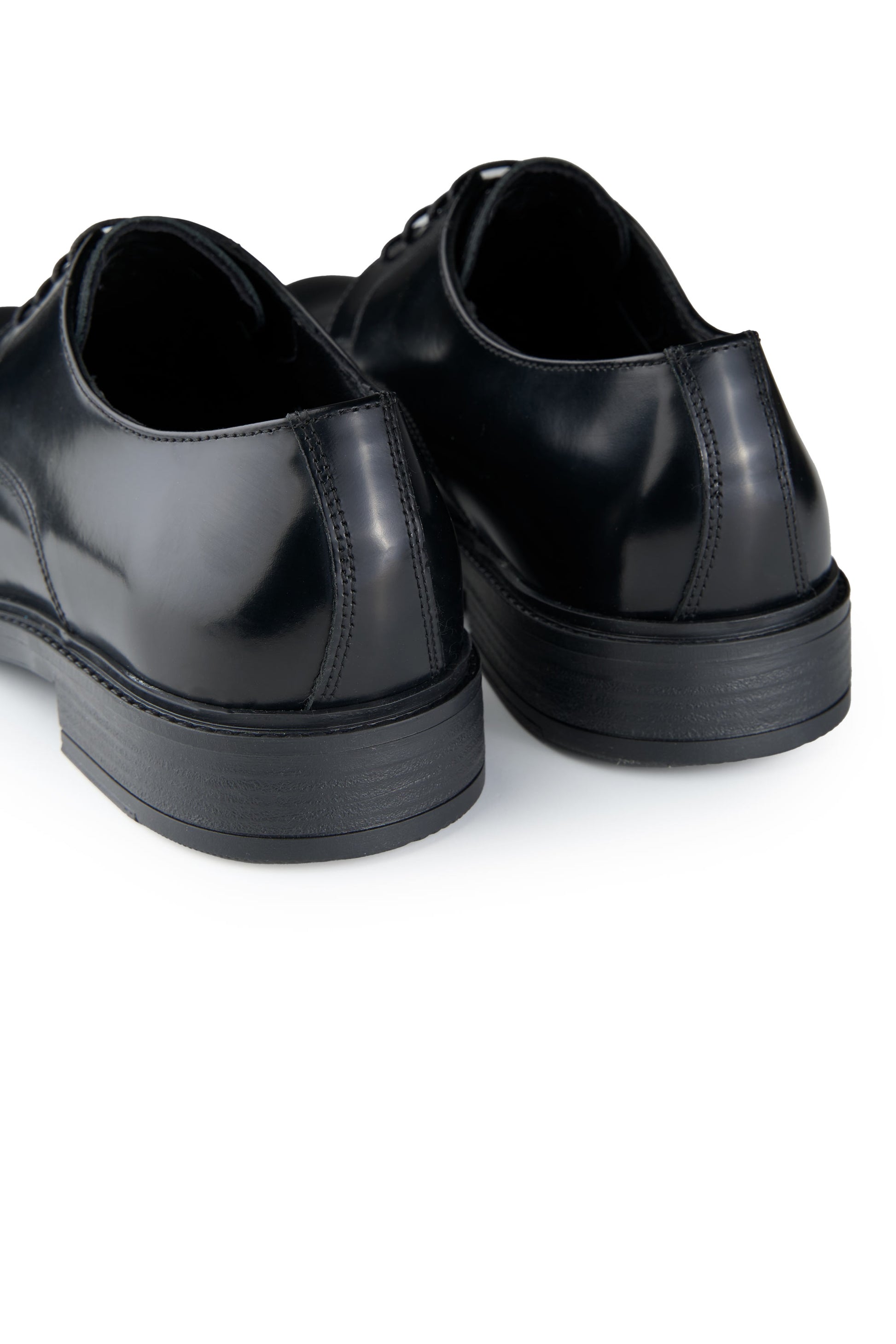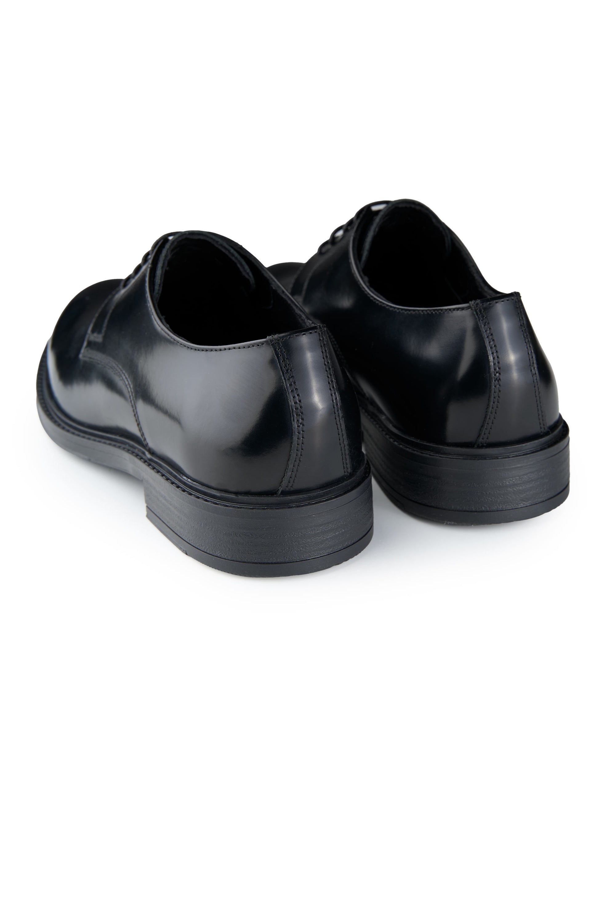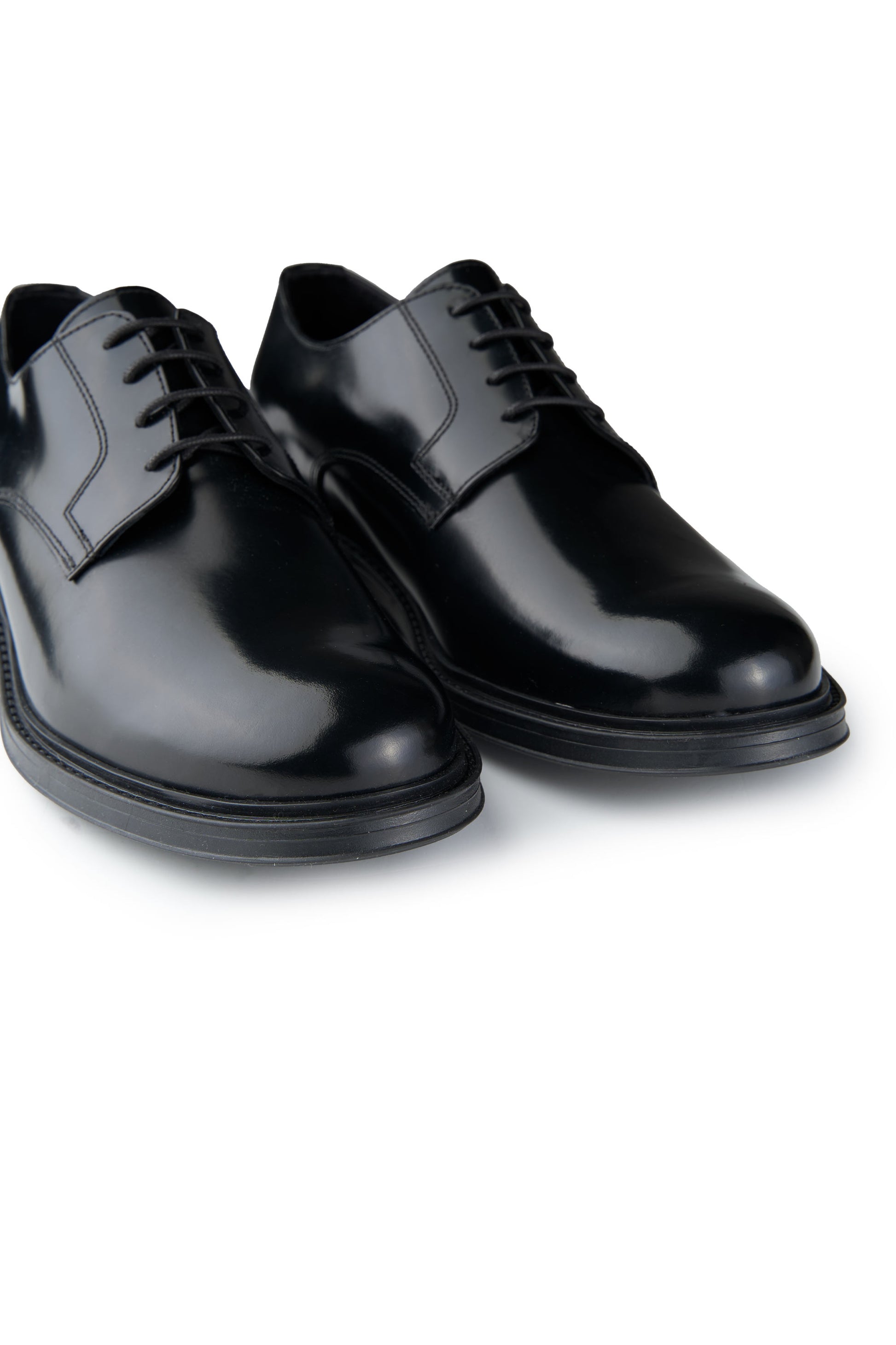 Formal derby shoes crafted from premium polished black leather, featuring a timeless and refined silhouette. Meticulously handmade with exceptional attention to detail, these shoes boast a classic lace-up closure, durable stitched rubber soles, and a sturdy, long-lasting construction.