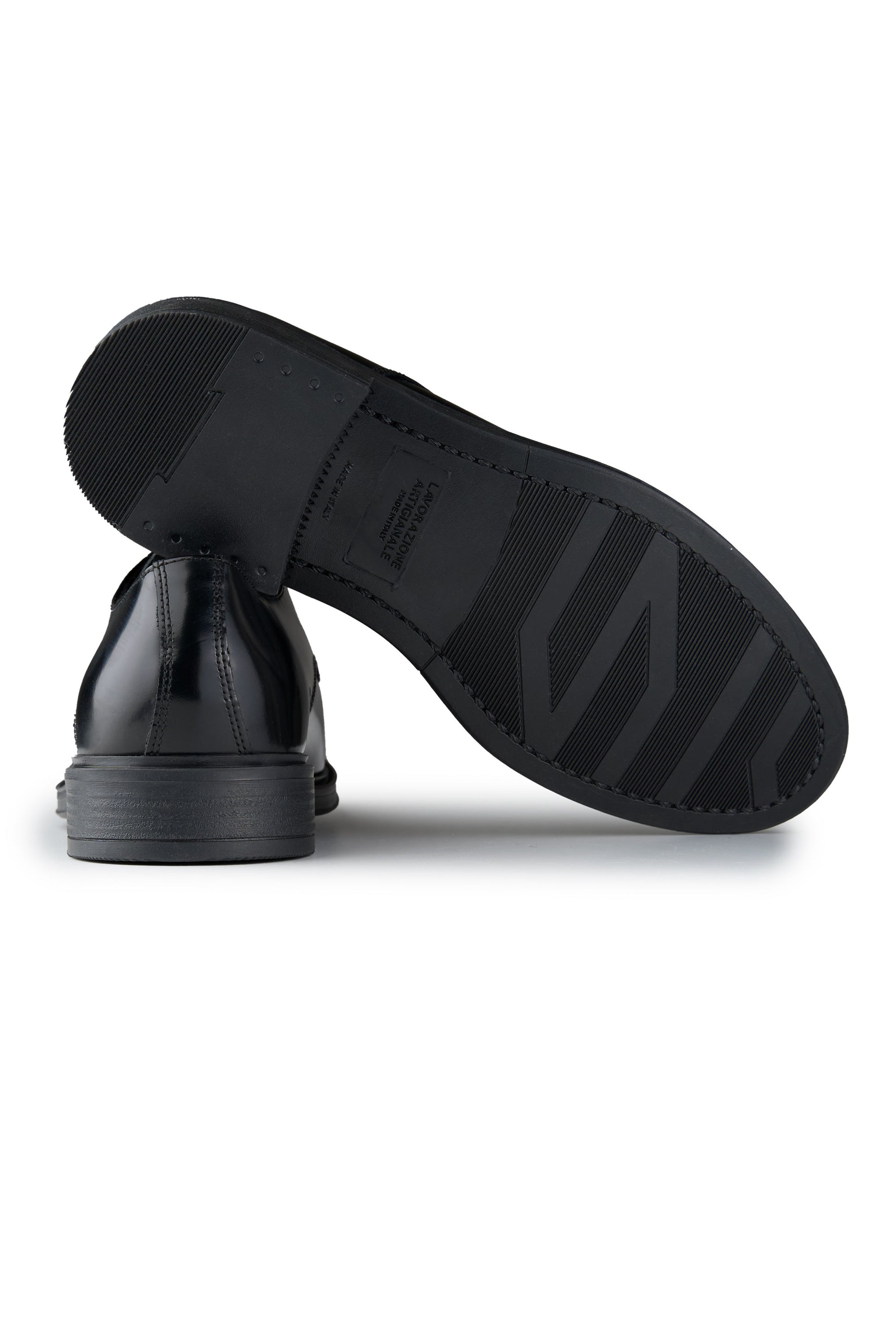 Black polished leather, Lace-up closure, Stitched non-slip rubber sole, Handmade craftsmanship, Elegant and formal style, High durability and resistance