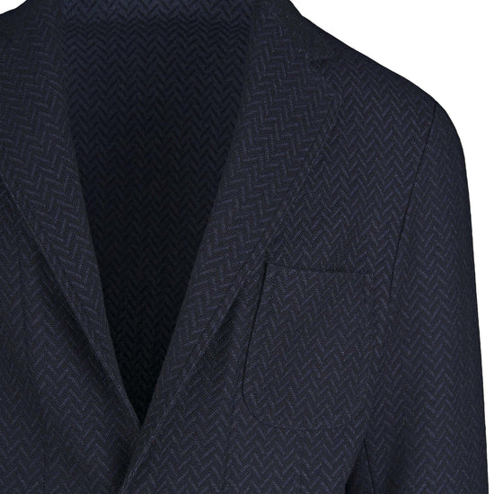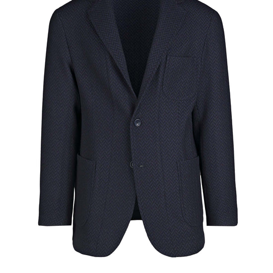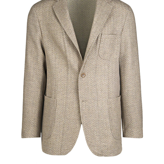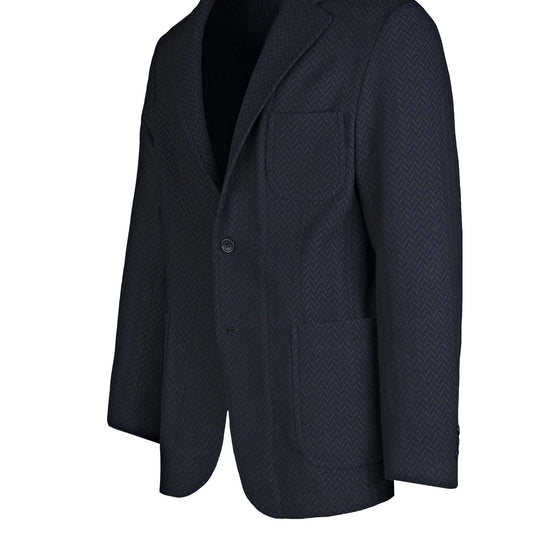 Single-breasted two-button jacket with a soft, unstructured build for effortless refinement. The fabric showcases a printed herringbone pattern—rather than a woven one—delivering a refined graphic look while keeping the hand light. The blend of 94% virgin wool, 4% cashmere and 2% elastane provides warmth and a naturally stretchy comfort. Balanced, easy volumes define the design: short classic notch lapels, a rounded patch chest pocket and generous rounded patch pockets reinforce the smart-casual attitude. The tonal, pared-back interior comes without heavy padding, ensuring a fluid, all-day comfortable wear. Available in two colours (light beige and deep navy) to span relaxed tailoring and everyday pairings with denim or knitwear. Horn-effect buttons, clean top-stitching and a rounded front hem complete this versatile piece.