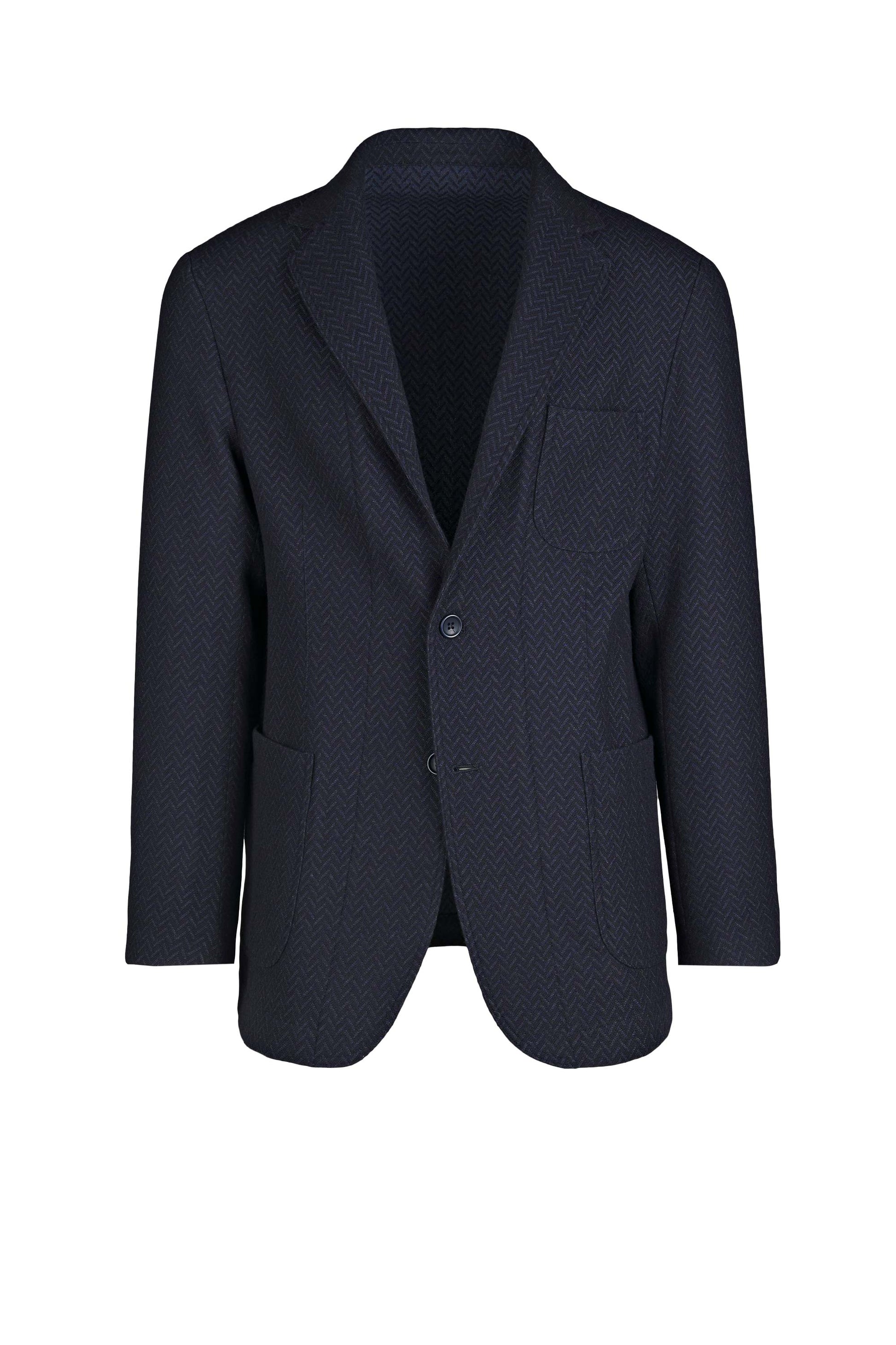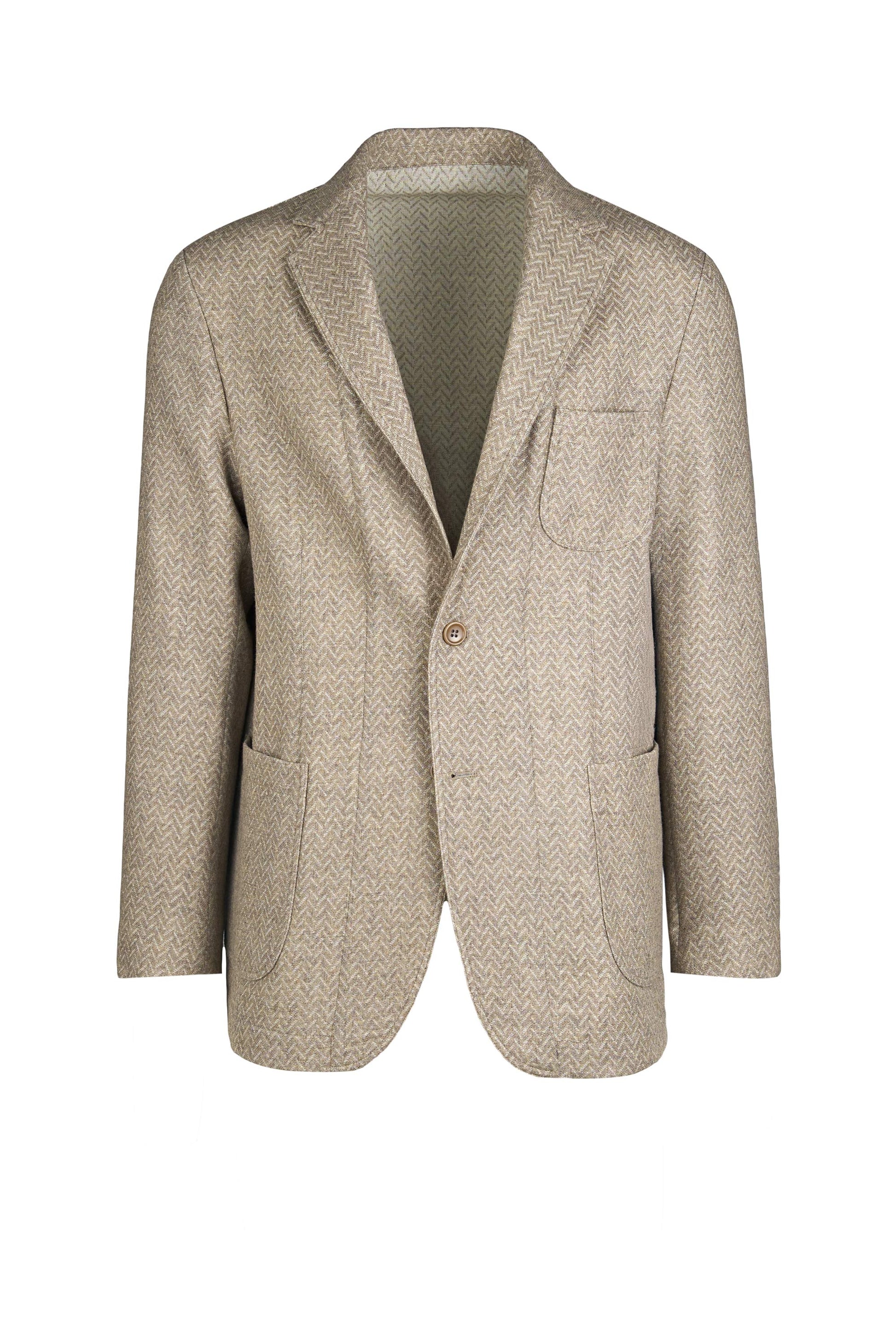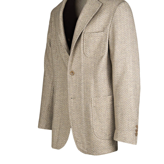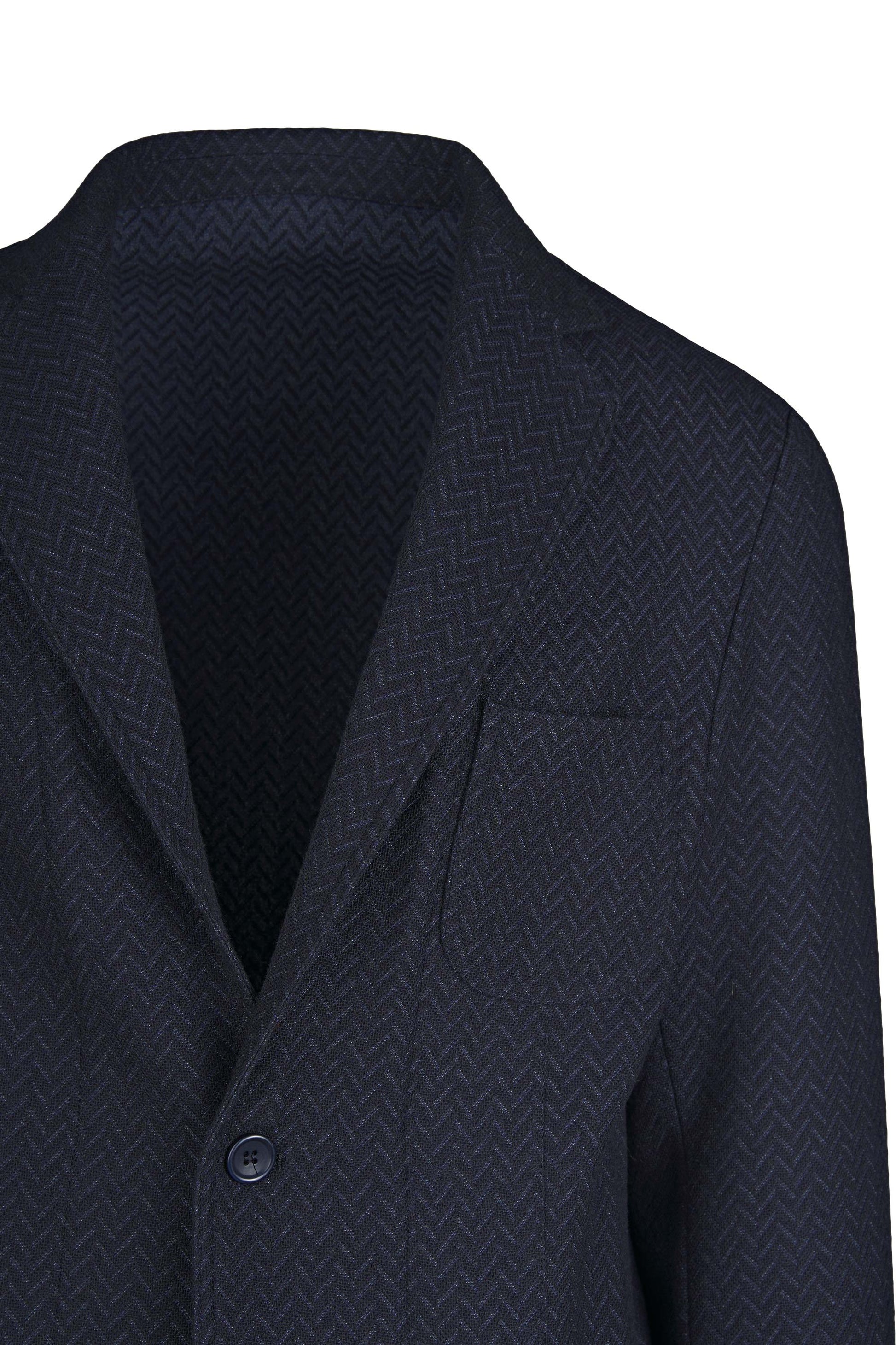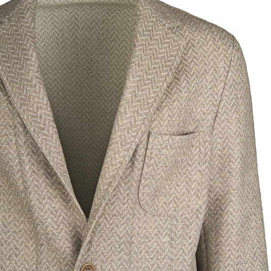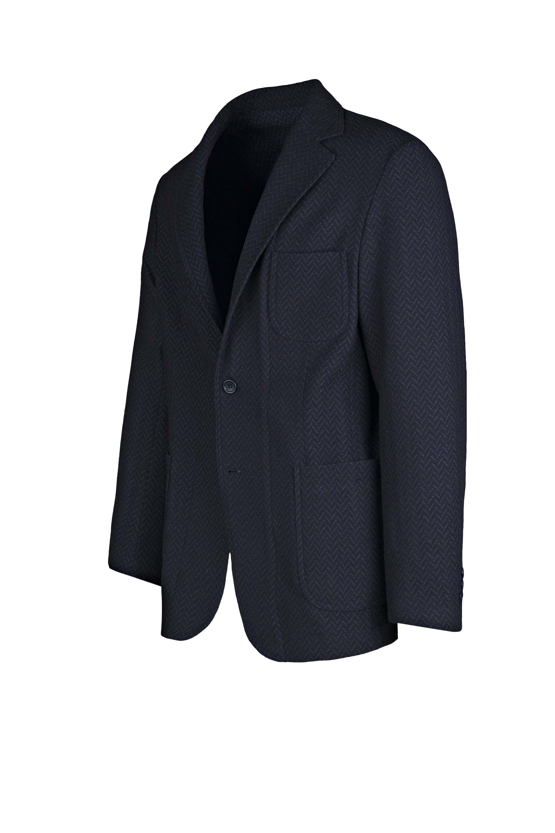 Monopetto due bottoni. Fantasia spina di pesce stampata. Tasca a toppa sul petto e due tasche a toppa ai fianchi. Rever classico a lanciare con impuntura a vista. Costruzione morbida e destrutturata. Fondo arrotondato, doppio spacco posteriore. Bottoni effetto corno.