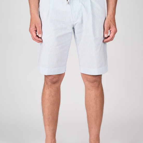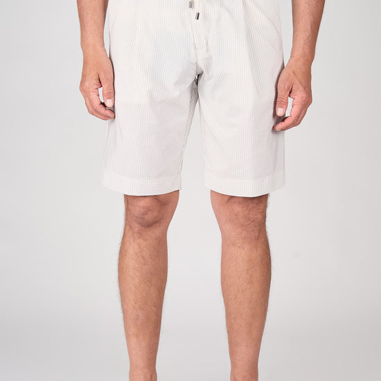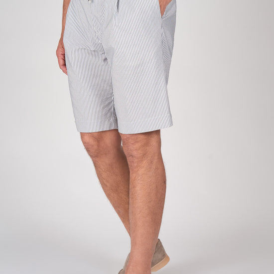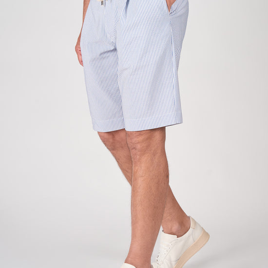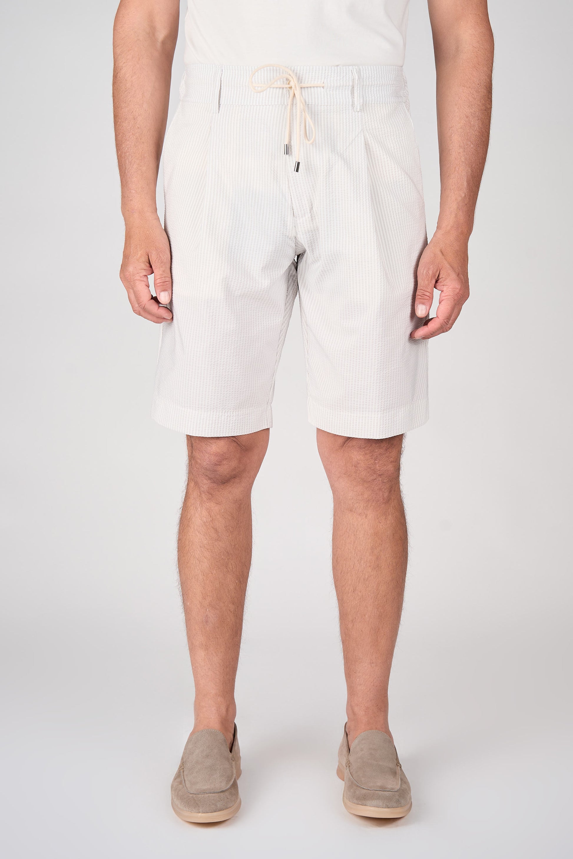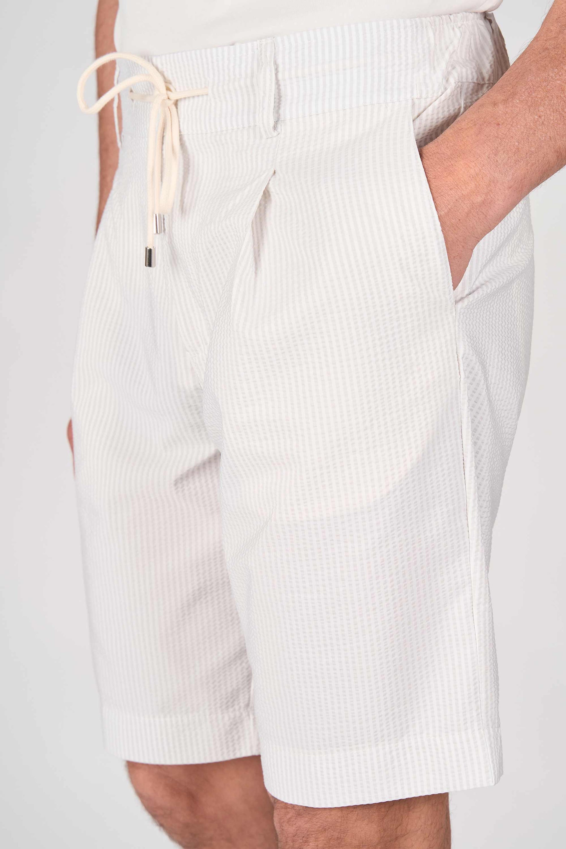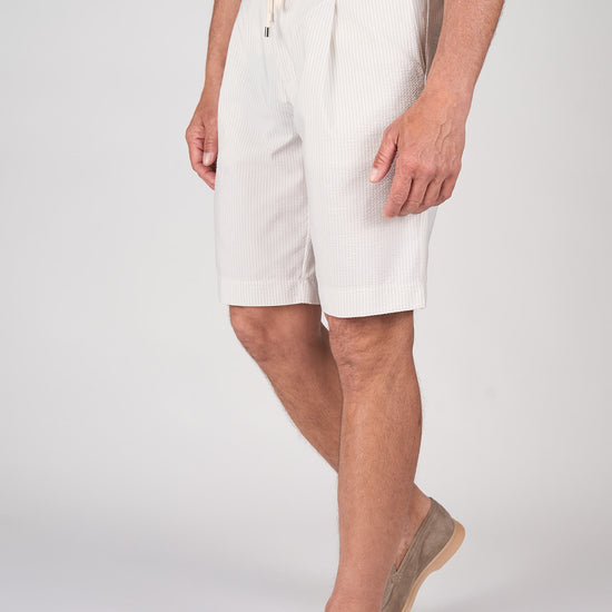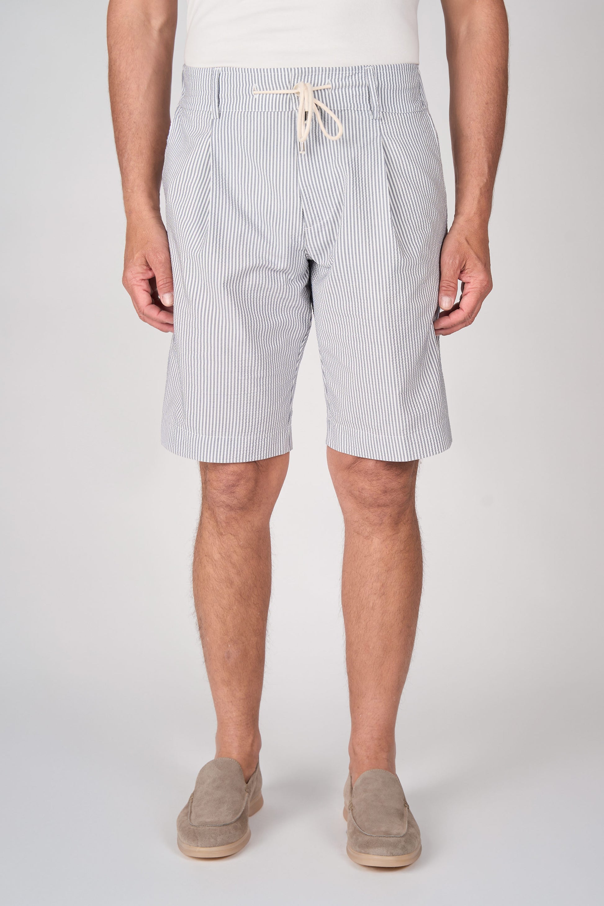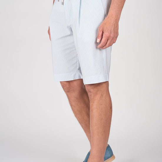Modern-cut Bermuda shorts crafted from stretch cotton seersucker, a breathable, lightweight fabric with a puckered texture that keeps the fabric off the skin—ideal for hot weather. The adjustable drawstring waist with metal tips and elasticated back waistband provide optimal comfort and a clean look. Featuring front pleats, belt loops, slanted side pockets and rear welt pockets, these shorts offer a smart yet relaxed fit. The silhouette is streamlined, perfect for versatile summer styling.