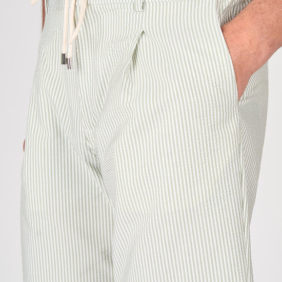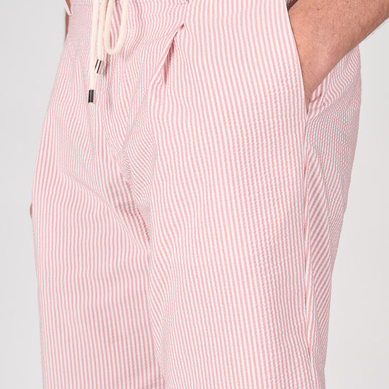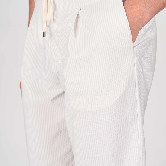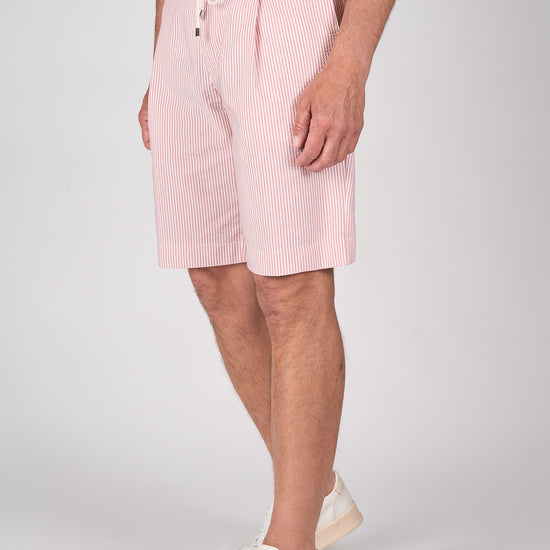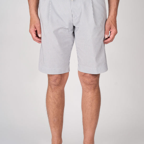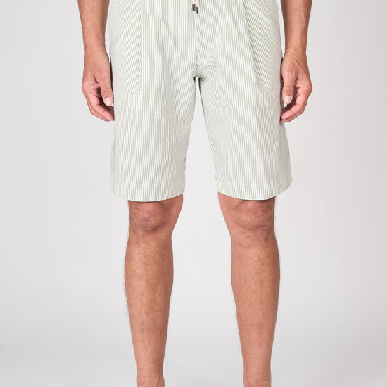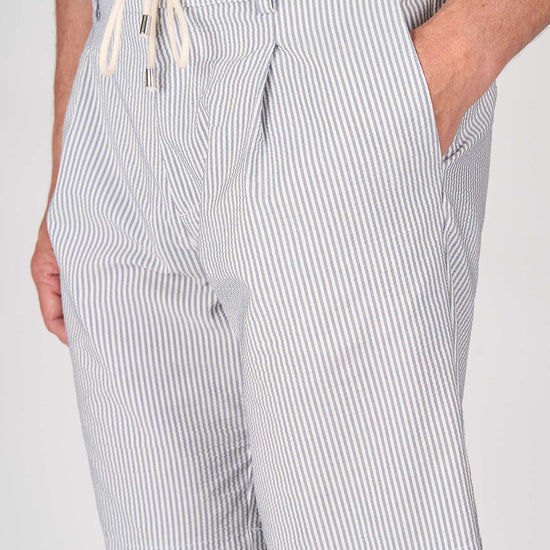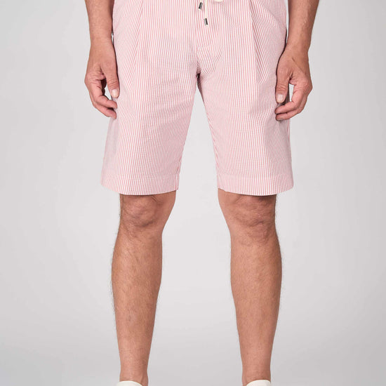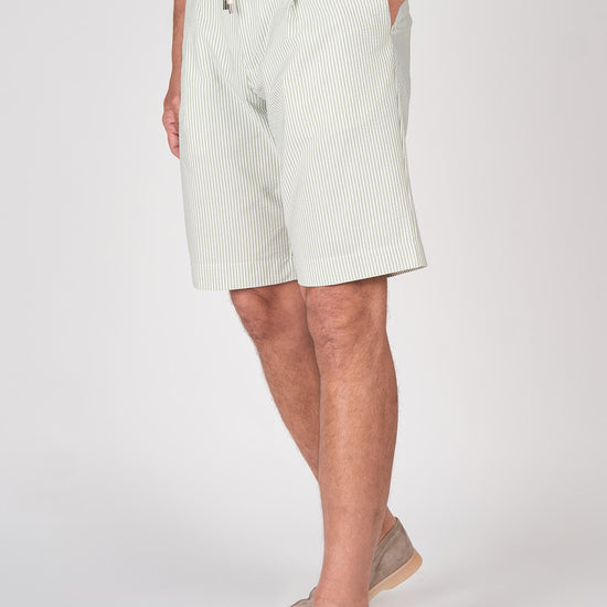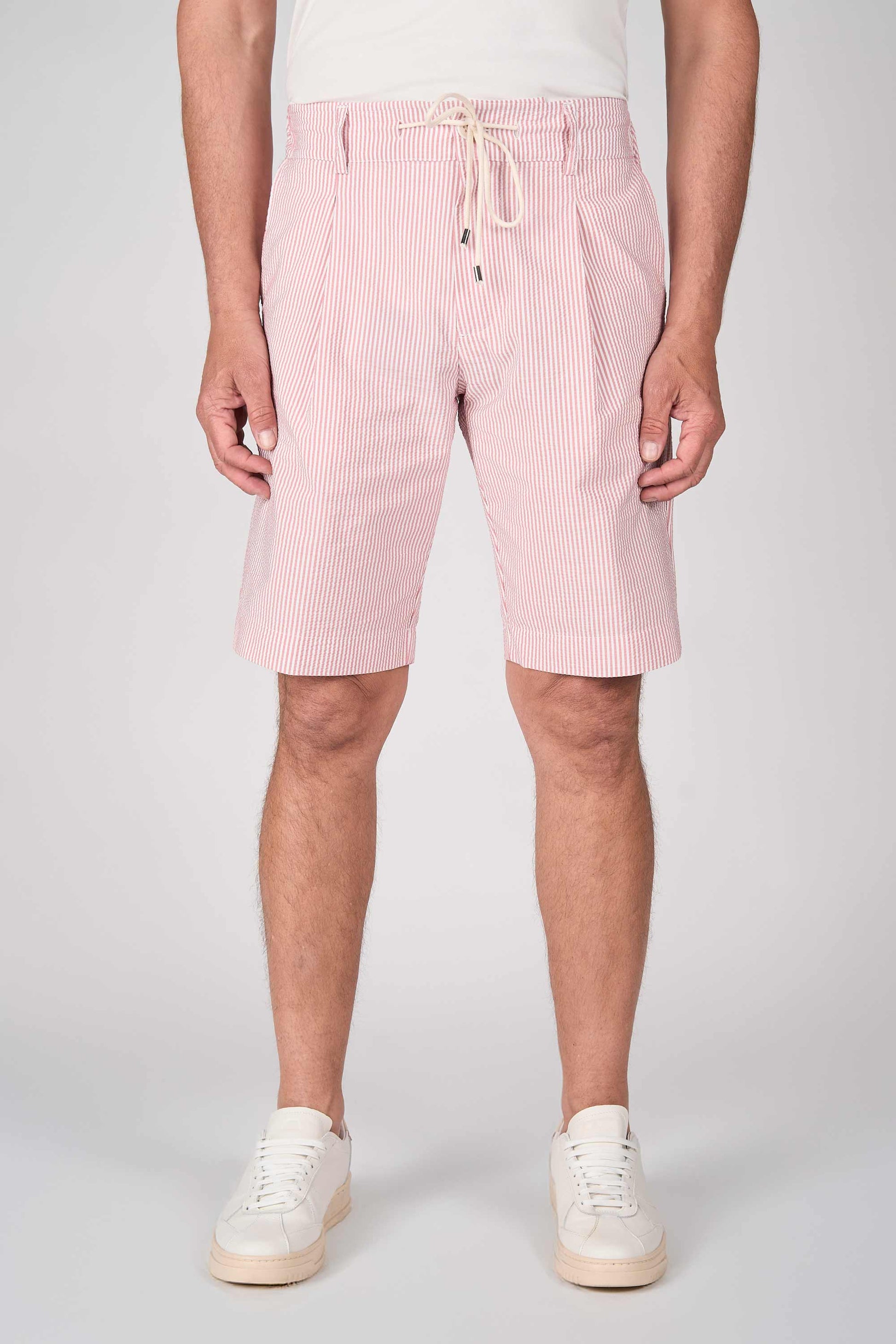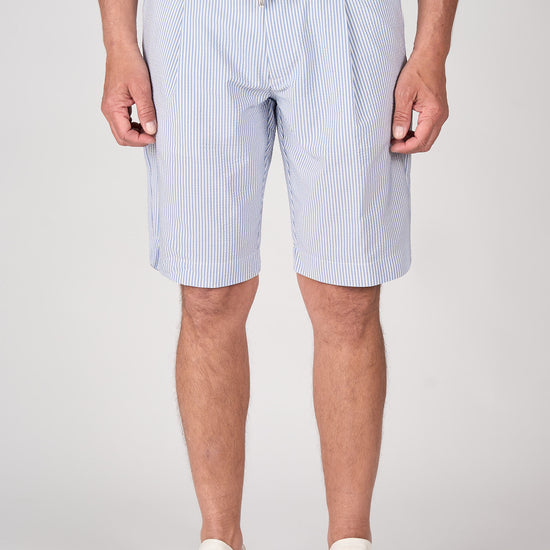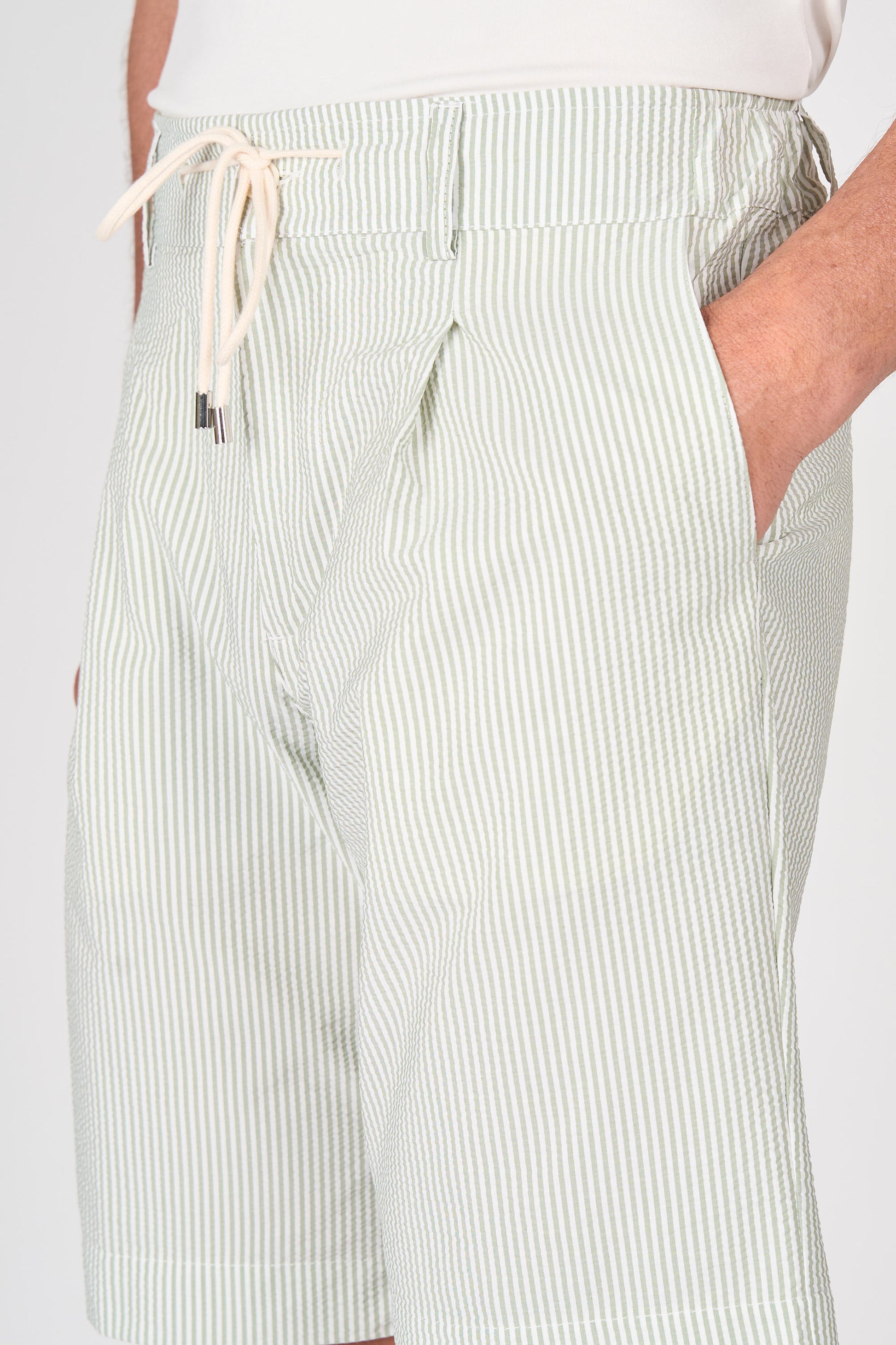 Modern-cut Bermuda shorts crafted from stretch cotton seersucker, a breathable, lightweight fabric with a puckered texture that keeps the fabric off the skin—ideal for hot weather. The adjustable drawstring waist with metal tips and elasticated back waistband provide optimal comfort and a clean look. Featuring front pleats, belt loops, slanted side pockets and rear welt pockets, these shorts offer a smart yet relaxed fit. The silhouette is streamlined, perfect for versatile summer styling.