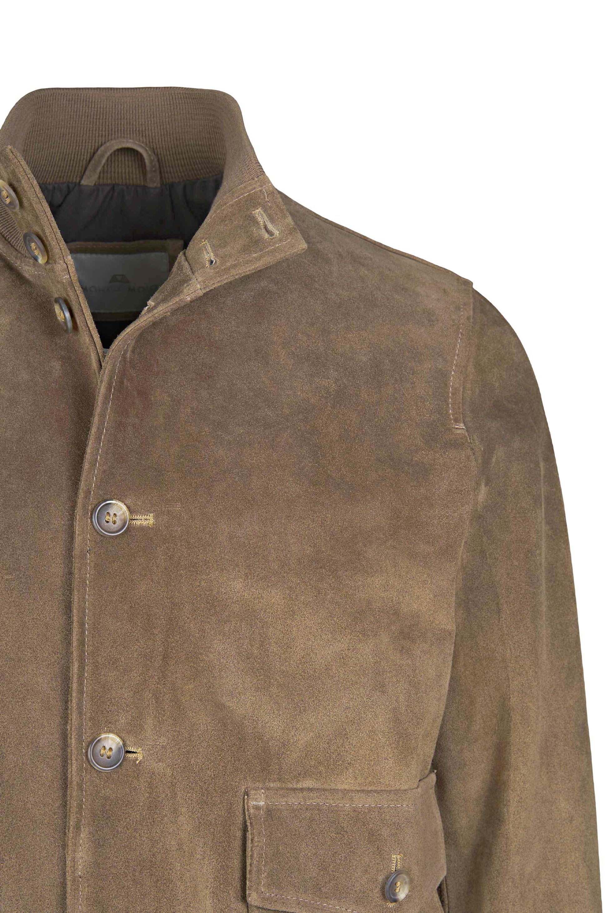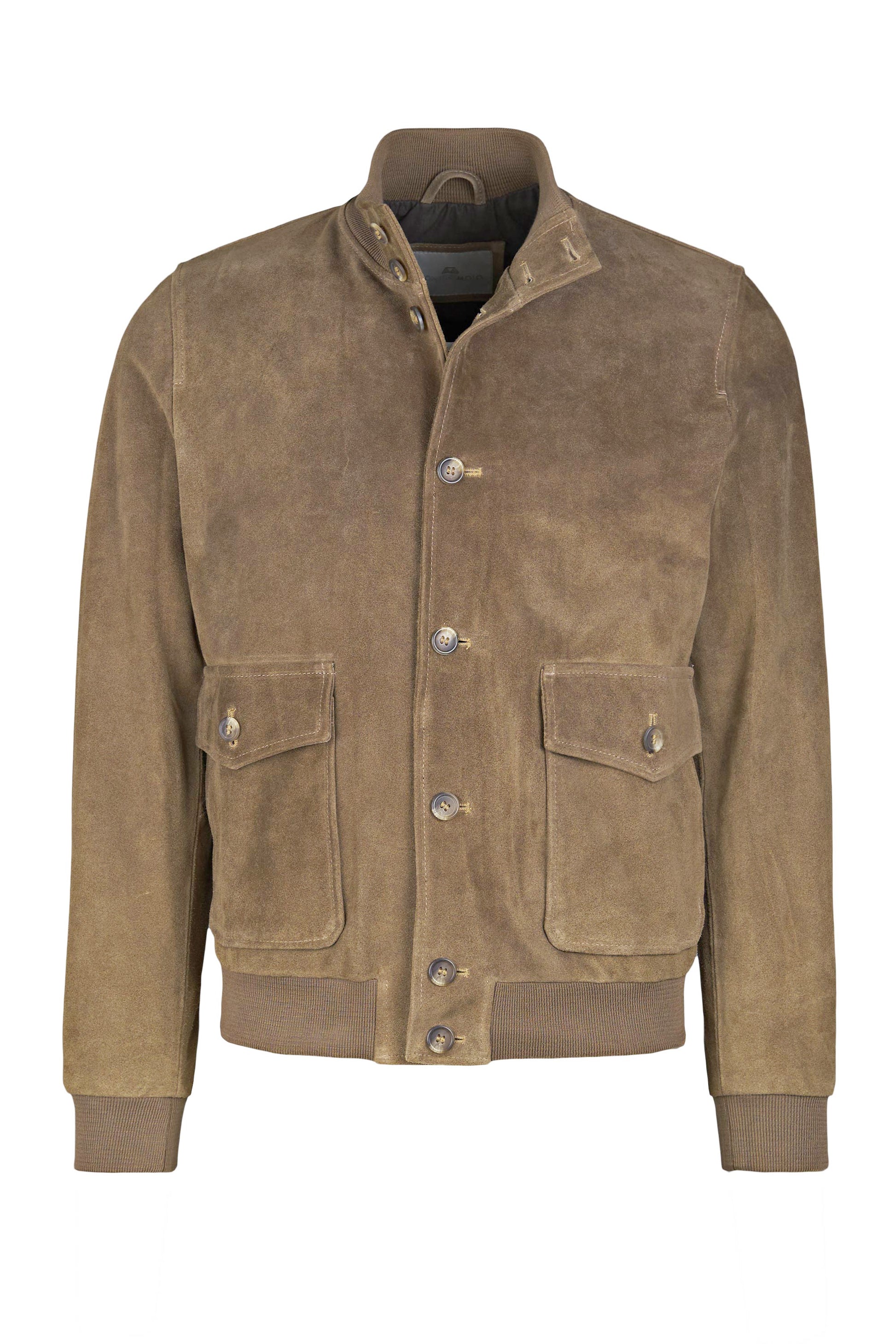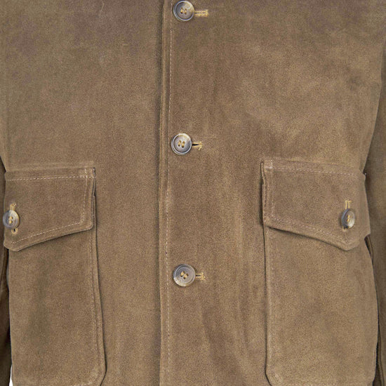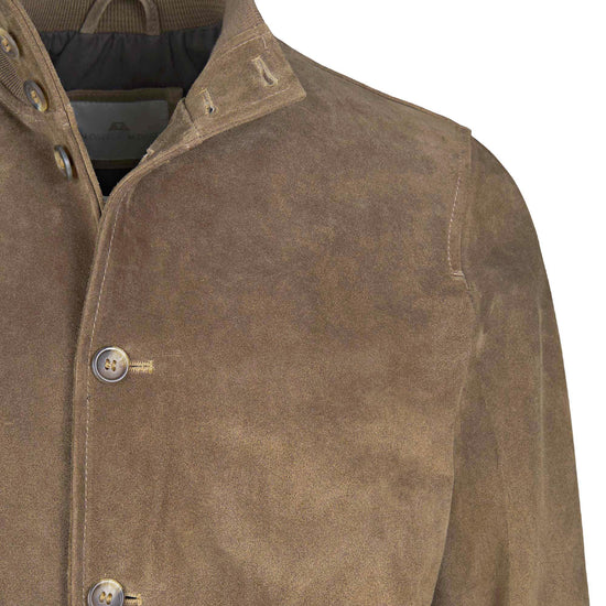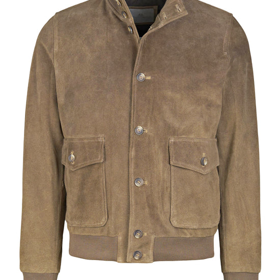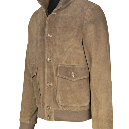 Suede leather bomber jacket with a velvety hand and a timeless, clean silhouette. The front closes with five buttons featuring thick top-stitching and warm-tone keyhole details, while a smooth knit stand collar wraps the neck; a small leather throat tab with buttonholes lets you secure it when needed. Two generous flap pockets structure the front and keep essentials close. Ribbed hem and cuffs cinch the waist for comfort and shape retention. A light inner lining makes it easy to slip on and off. The mid-brown hue enhances the depth of the suede and pairs effortlessly with denim, chinos or flannel trousers.
