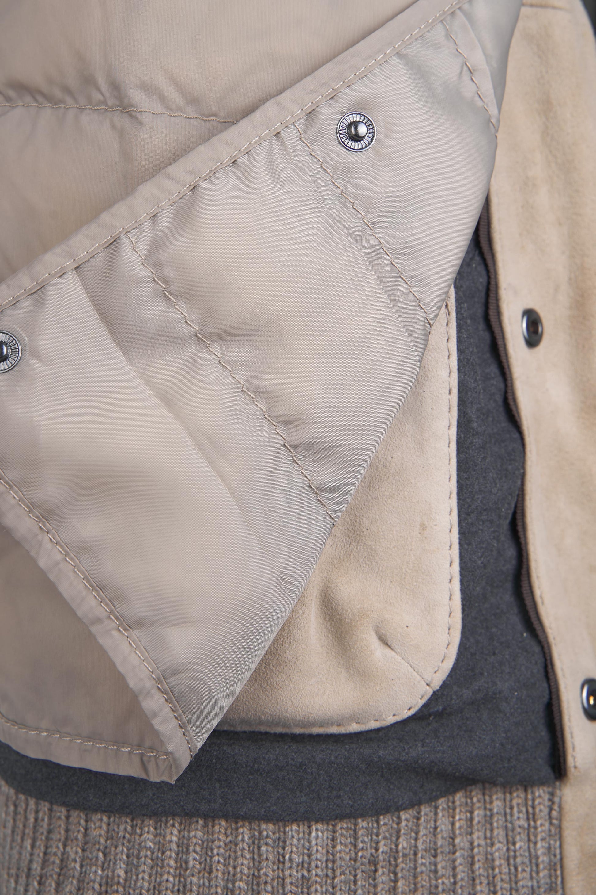 Suede body with virgin-wool knit sleeves. Two-way front zipper. Detachable lightweight quilted inner vest with snaps. Stand collar in suede with ribbed inner. Zipped side pockets. Ribbed hem and cuffs