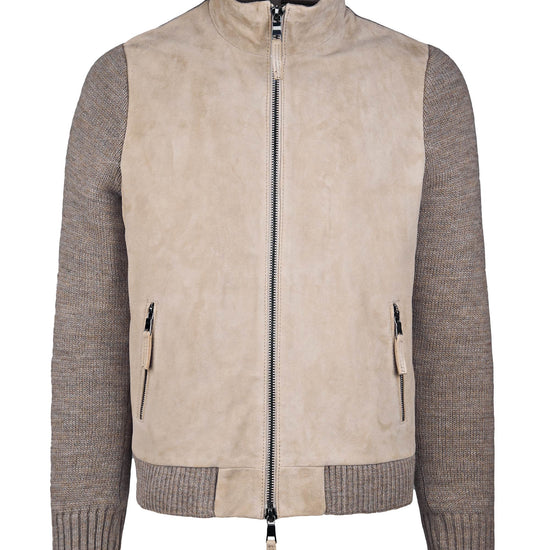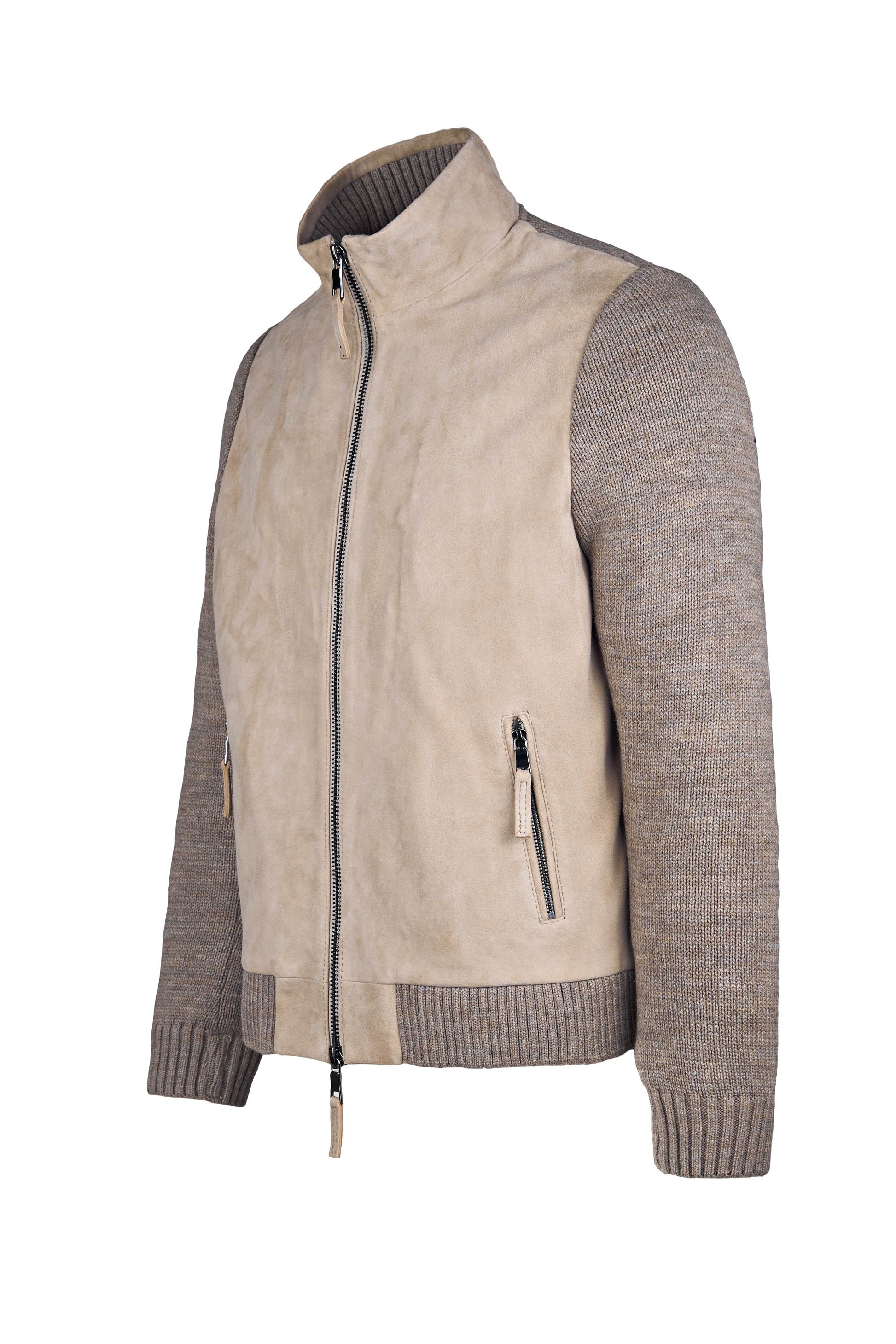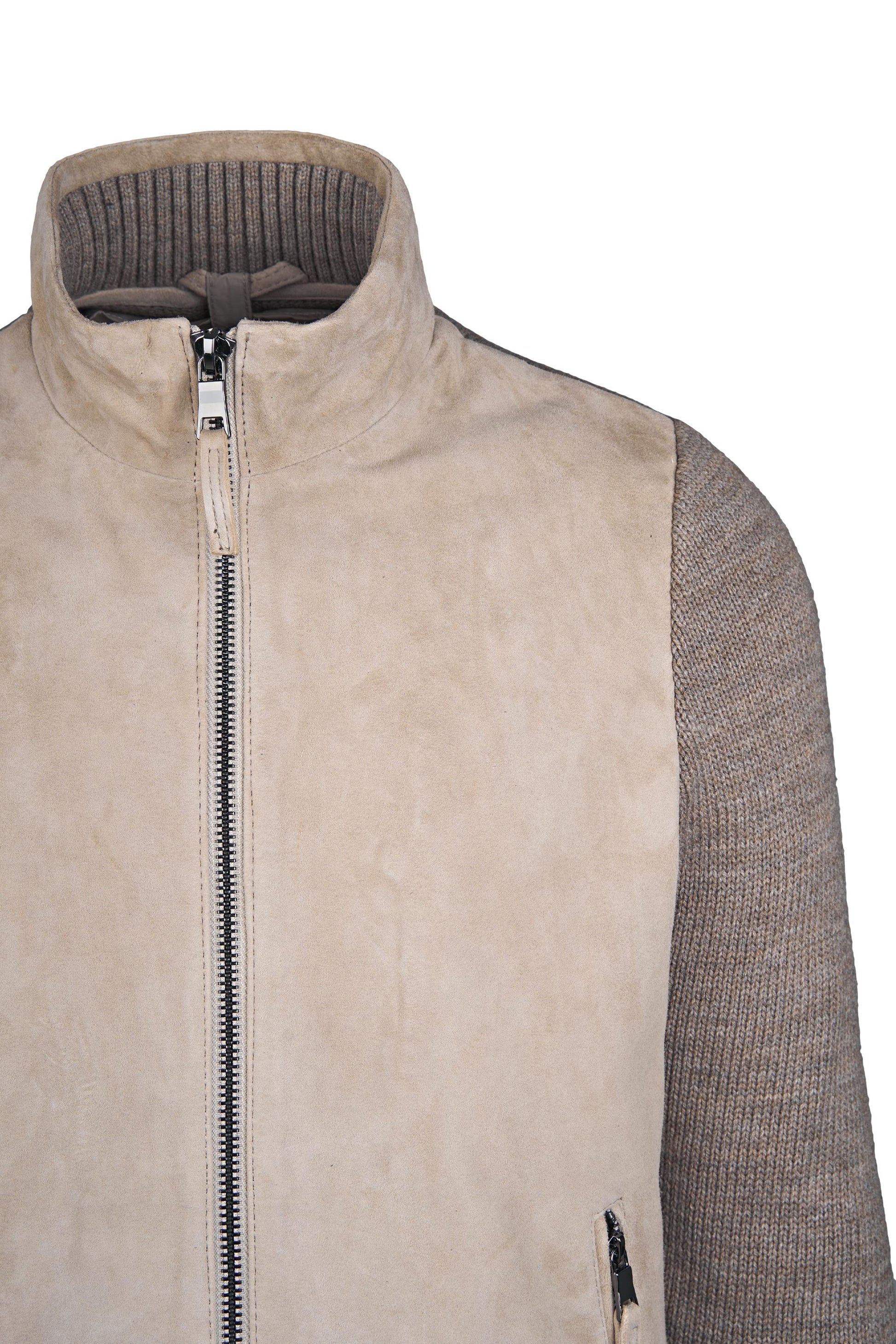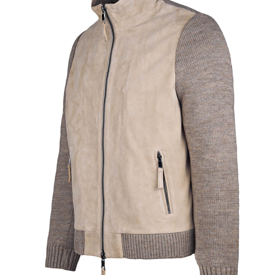 Urban hybrid jacket featuring a sand–tone suede body combined with mélange virgin–wool knit sleeves. A stand collar and ribbed trims provide a close, comfortable fit, while the two-way front zipper offers easy wear and ventilation. Inside it hides a lightweight, detachable quilted vest—secured with snap buttons—for added warmth when needed. Zipped side pockets with leather pullers finish a versatile piece for city wear and off-duty layering.