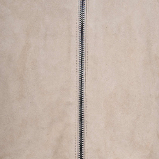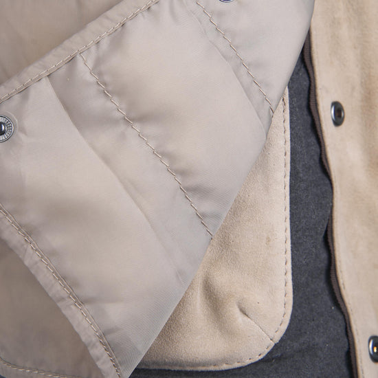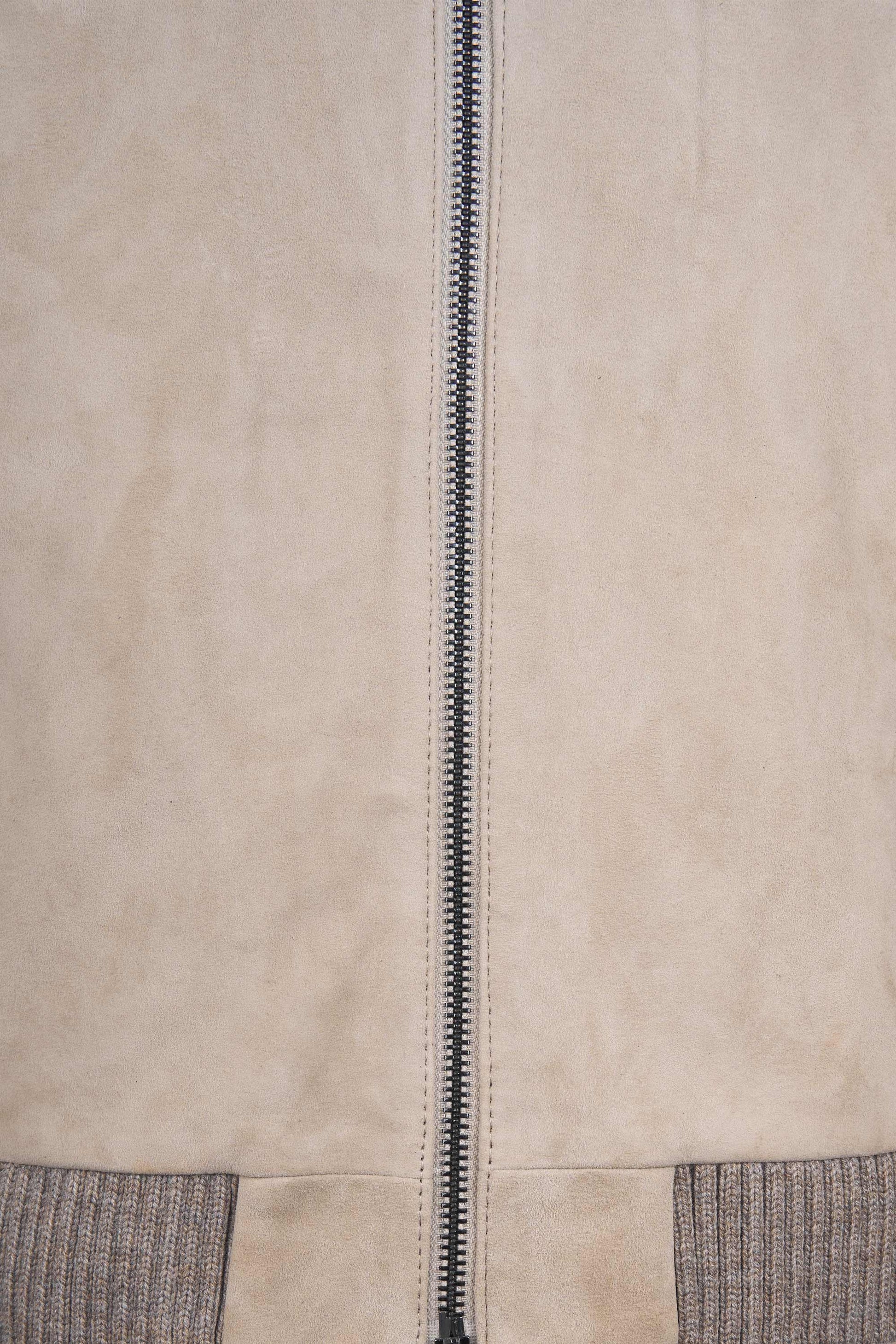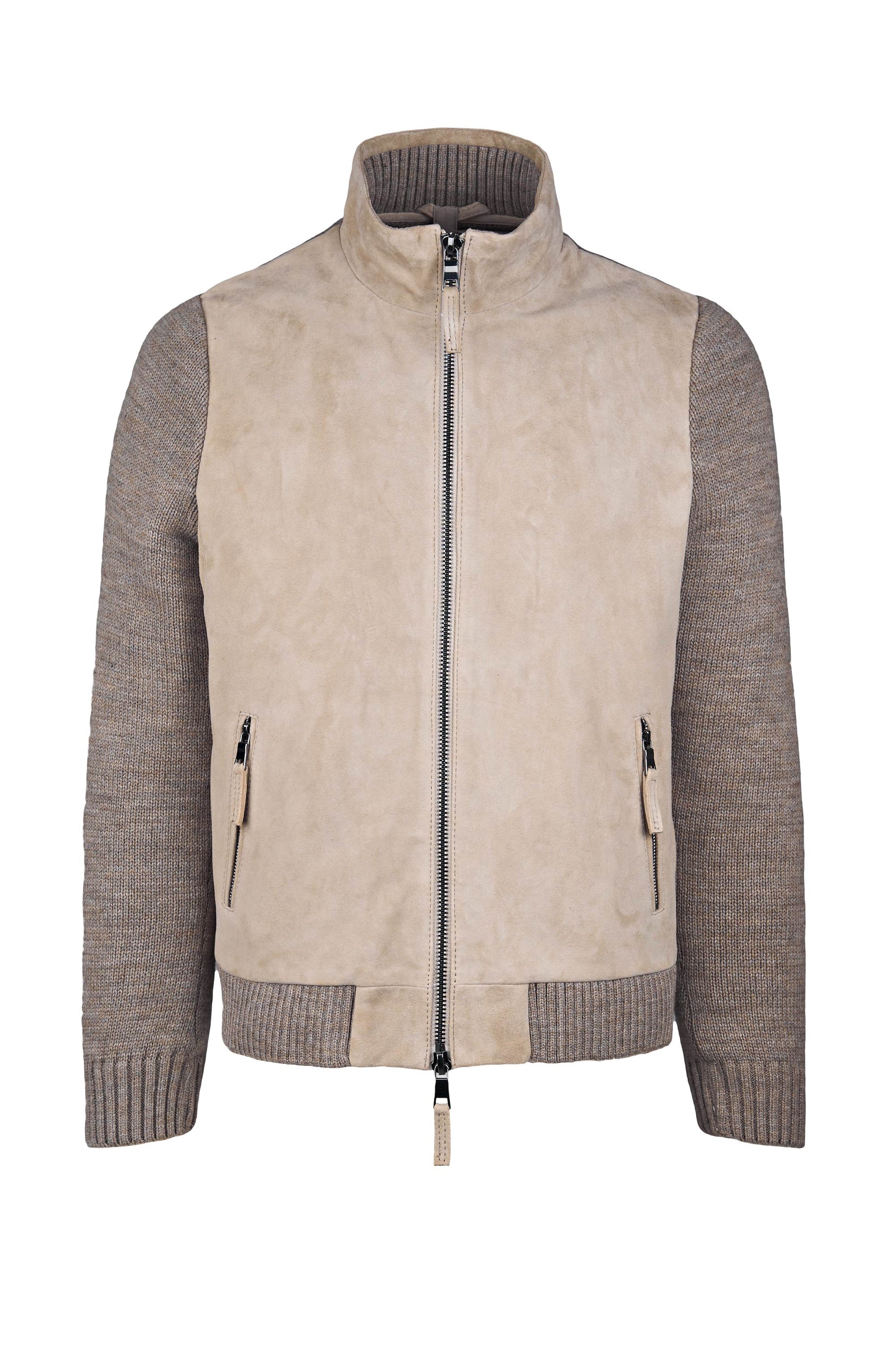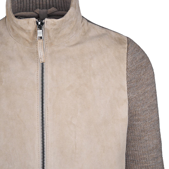 Urban hybrid jacket featuring a sand–tone suede body combined with mélange virgin–wool knit sleeves. A stand collar and ribbed trims provide a close, comfortable fit, while the two-way front zipper offers easy wear and ventilation. Inside it hides a lightweight, detachable quilted vest—secured with snap buttons—for added warmth when needed. Zipped side pockets with leather pullers finish a versatile piece for city wear and off-duty layering.
