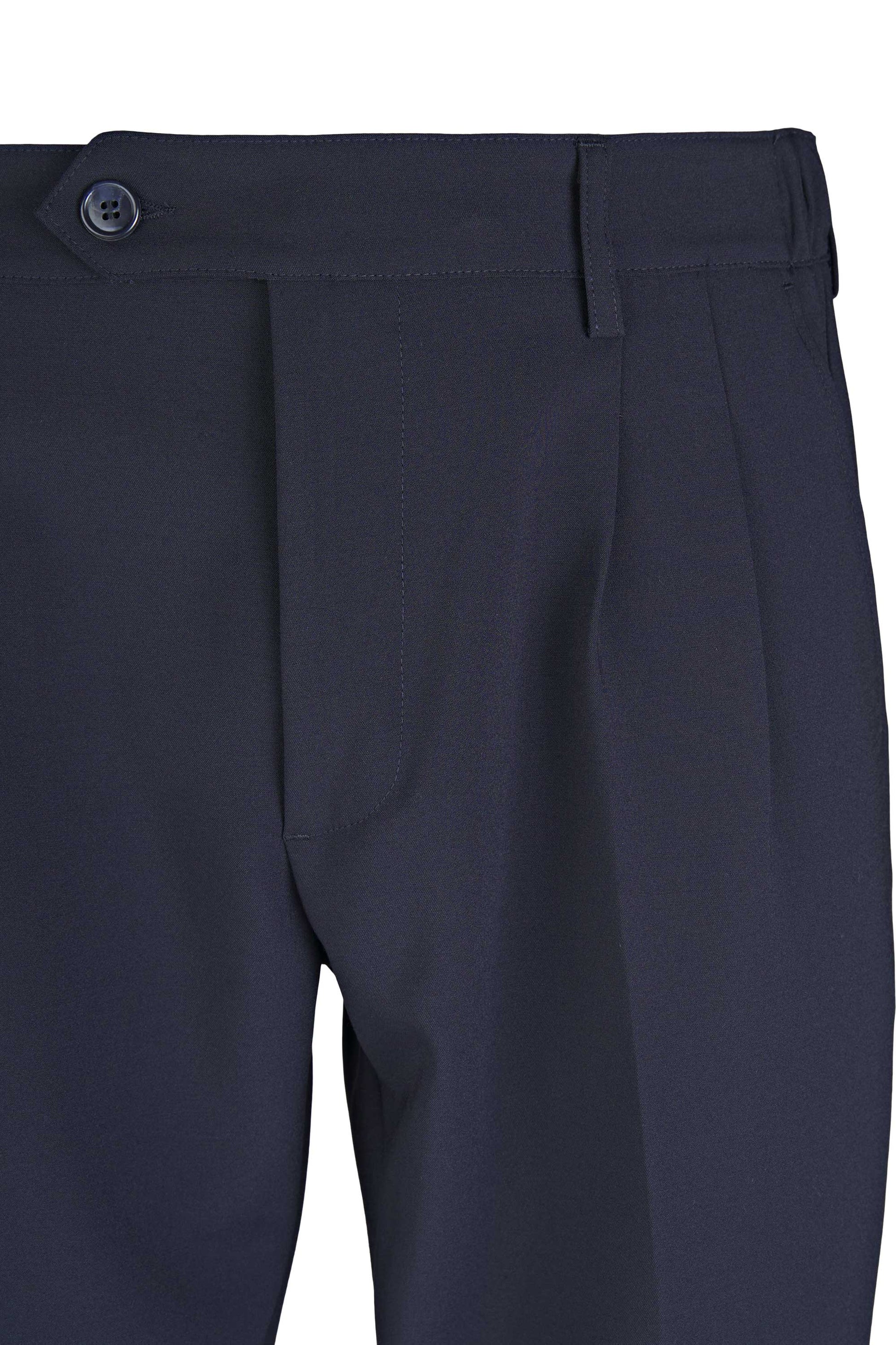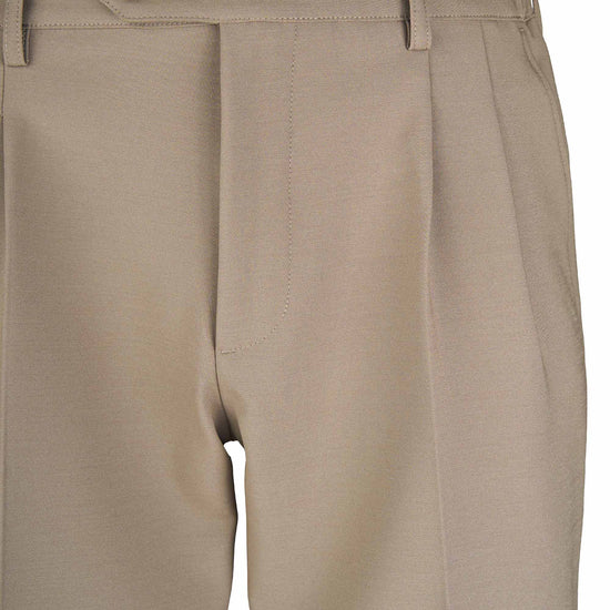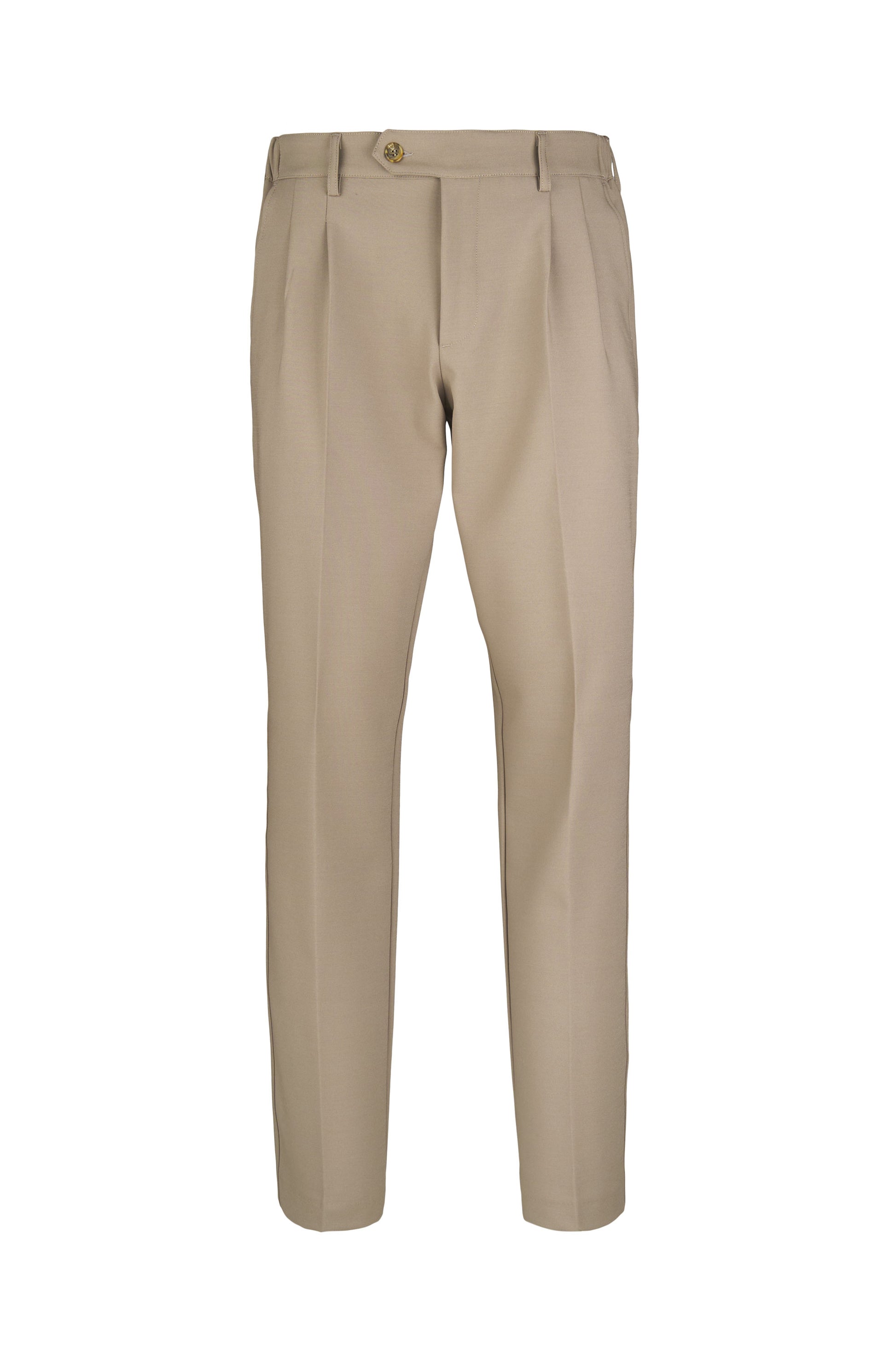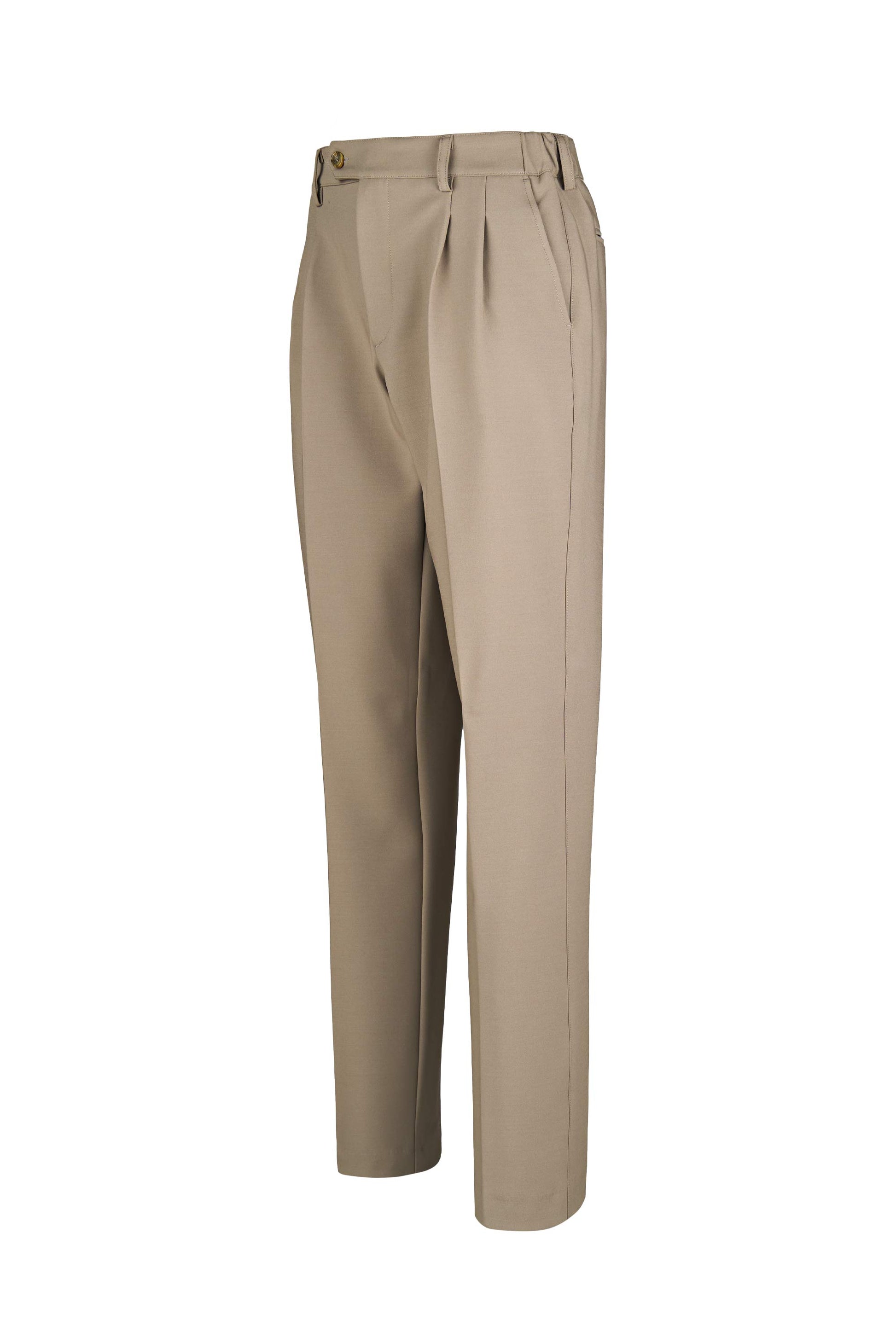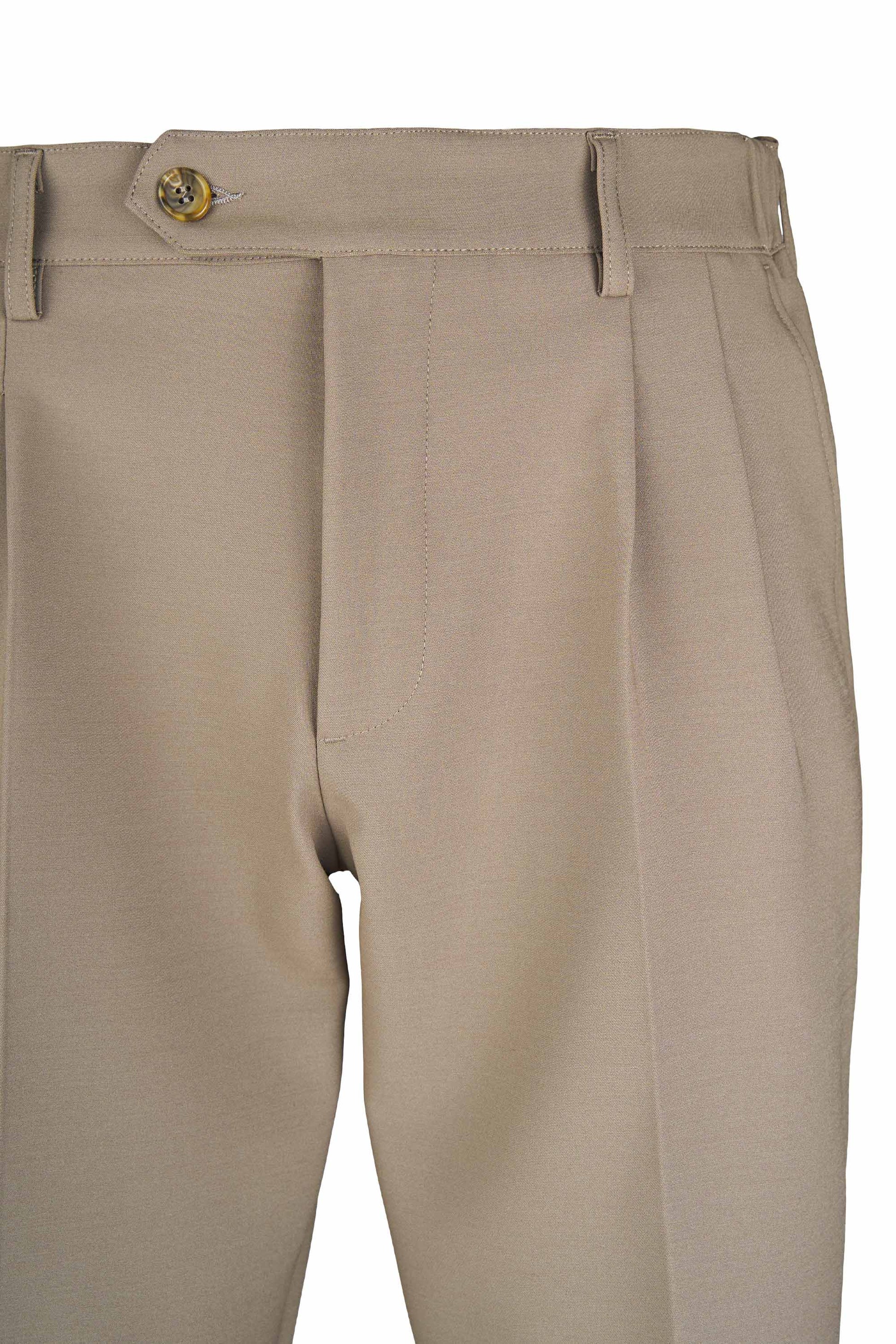 Mid-rise; belt loops; zip fly with extended tab & button + internal button. Double front pleats; slanted side pockets; back welt pockets with button. Straight, slightly tapered leg with pressed crease; clean, uncuffed hem. Carefully finished seams for a crisp, long-lasting silhouette.