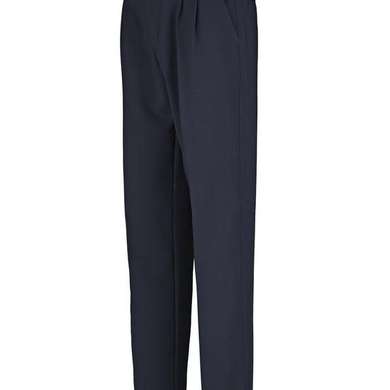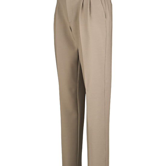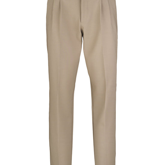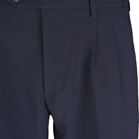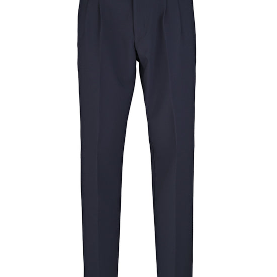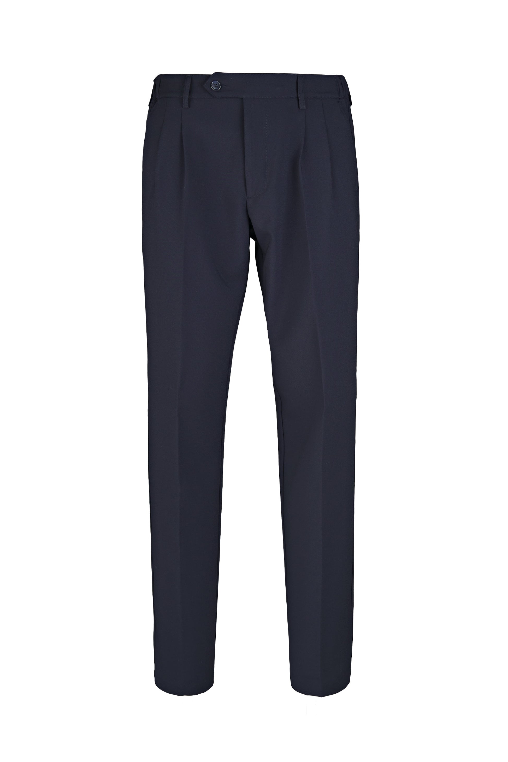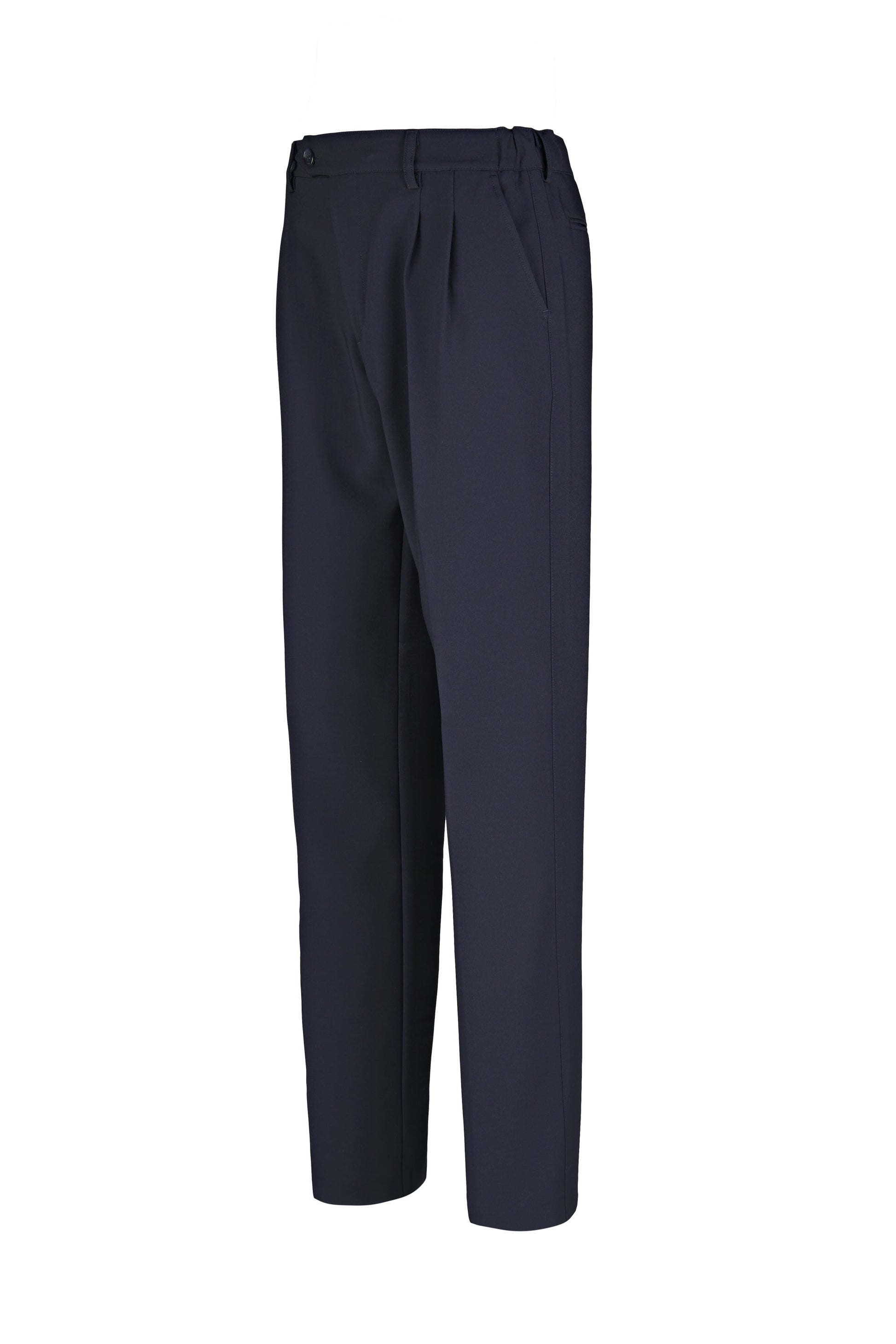 Mid-rise; belt loops; zip fly with extended tab & button + internal button. Double front pleats; slanted side pockets; back welt pockets with button. Straight, slightly tapered leg with pressed crease; clean, uncuffed hem. Carefully finished seams for a crisp, long-lasting silhouette.