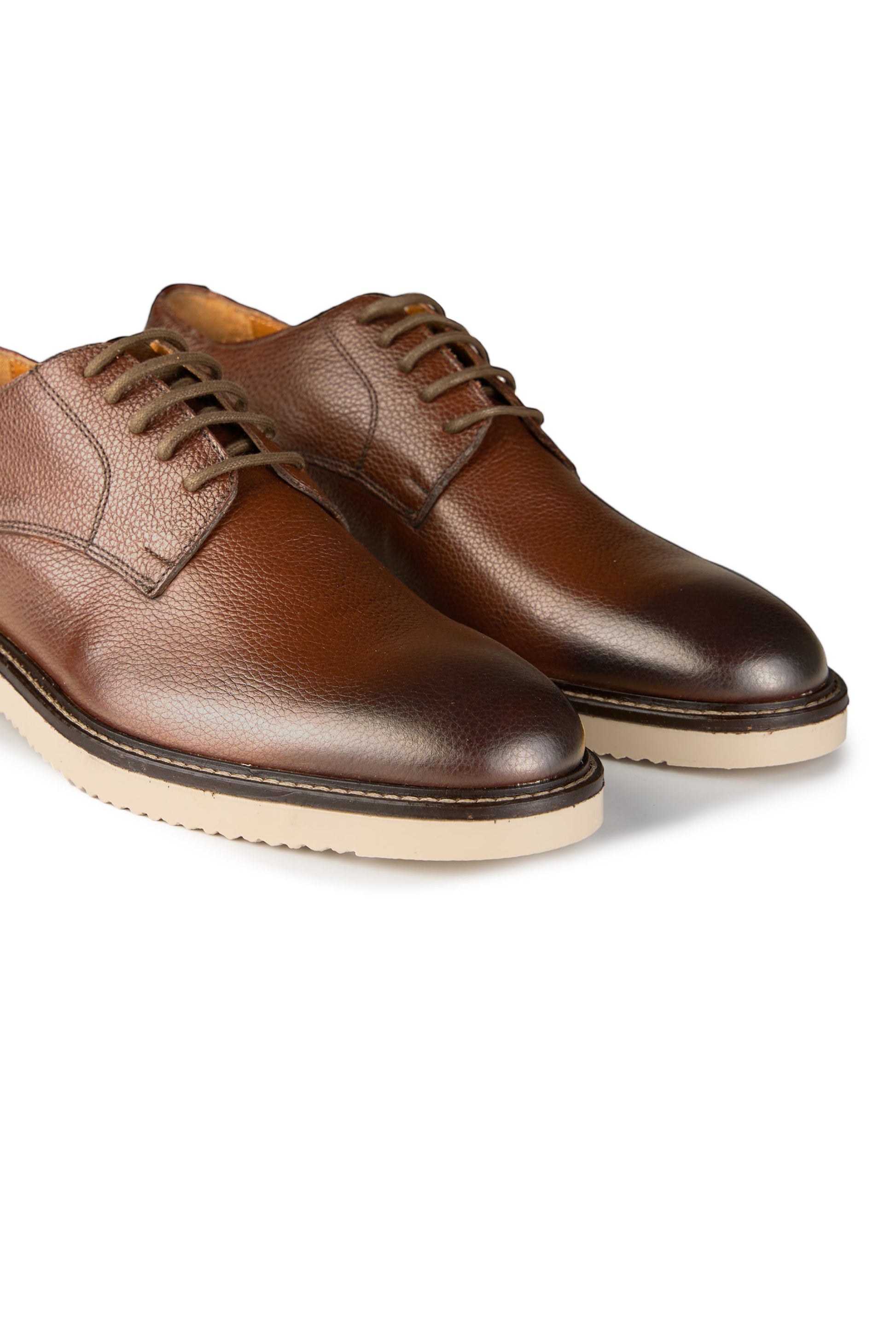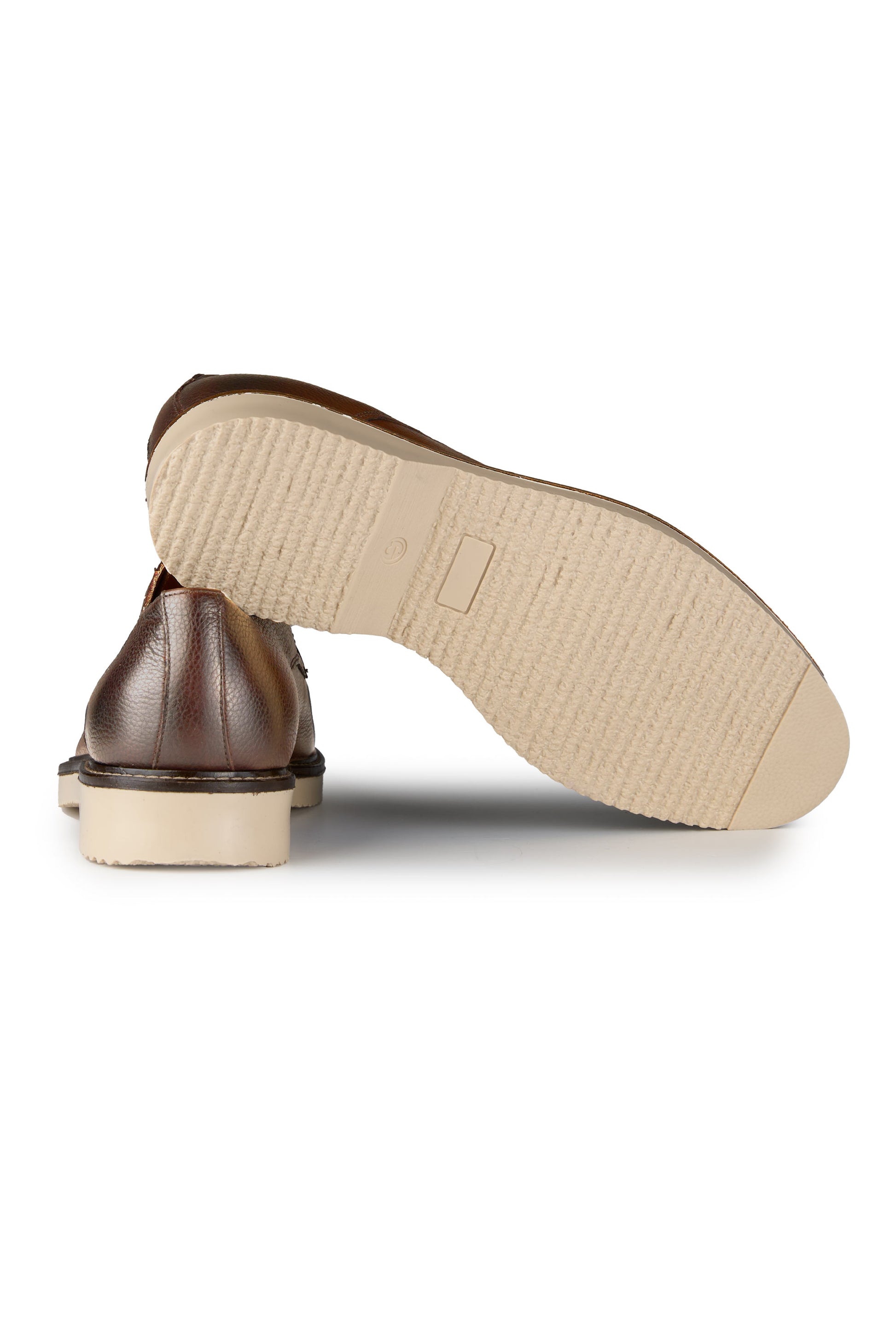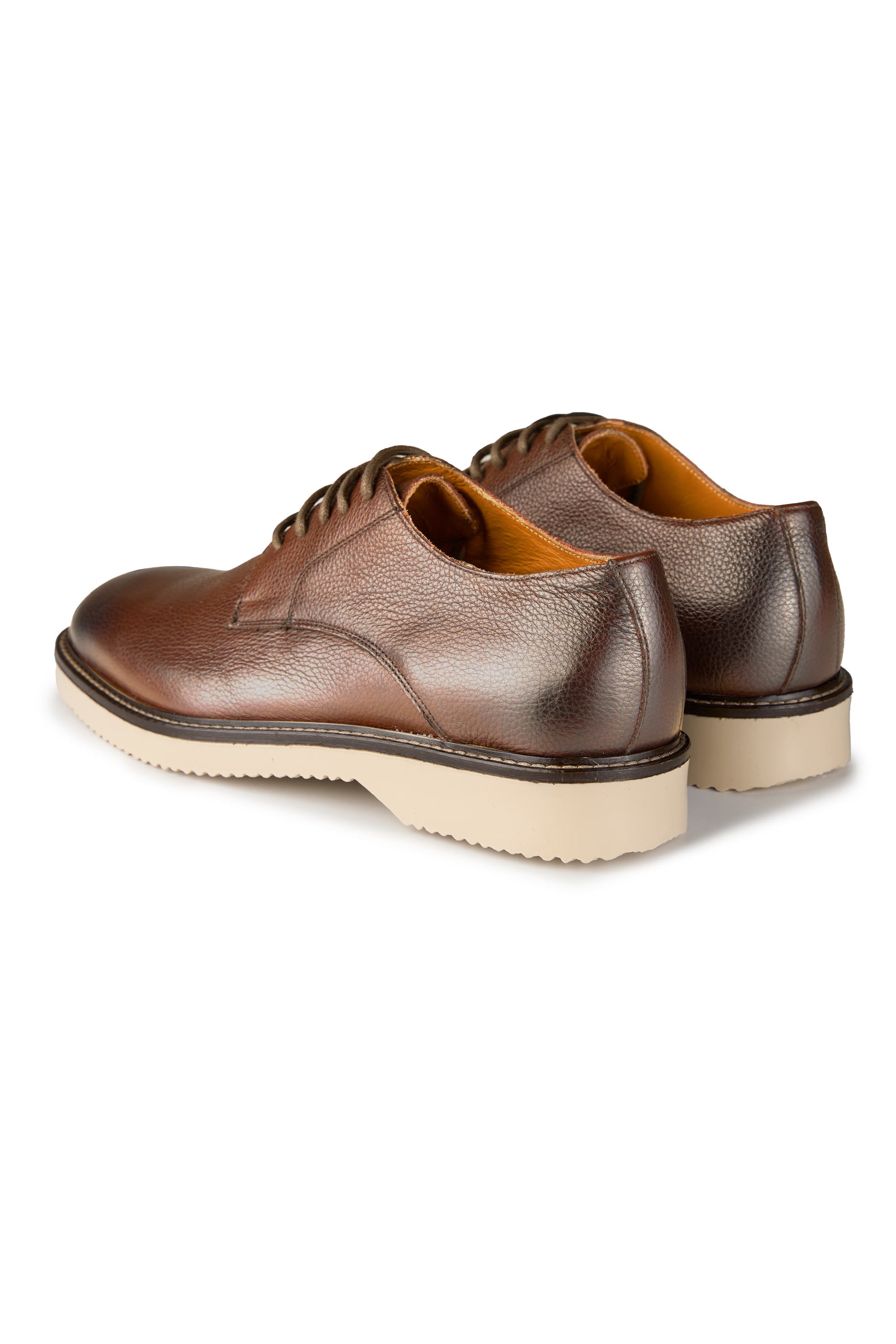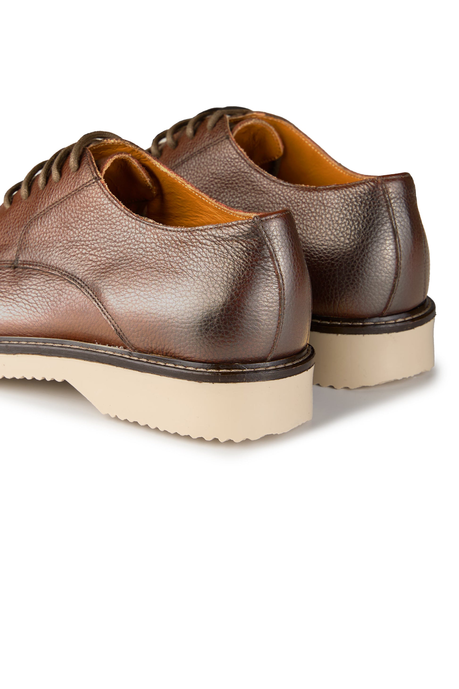 Hammered leather upper, smooth round toe, extralight EVA rubber sole, Goodyear construction, genuine leather insole.
