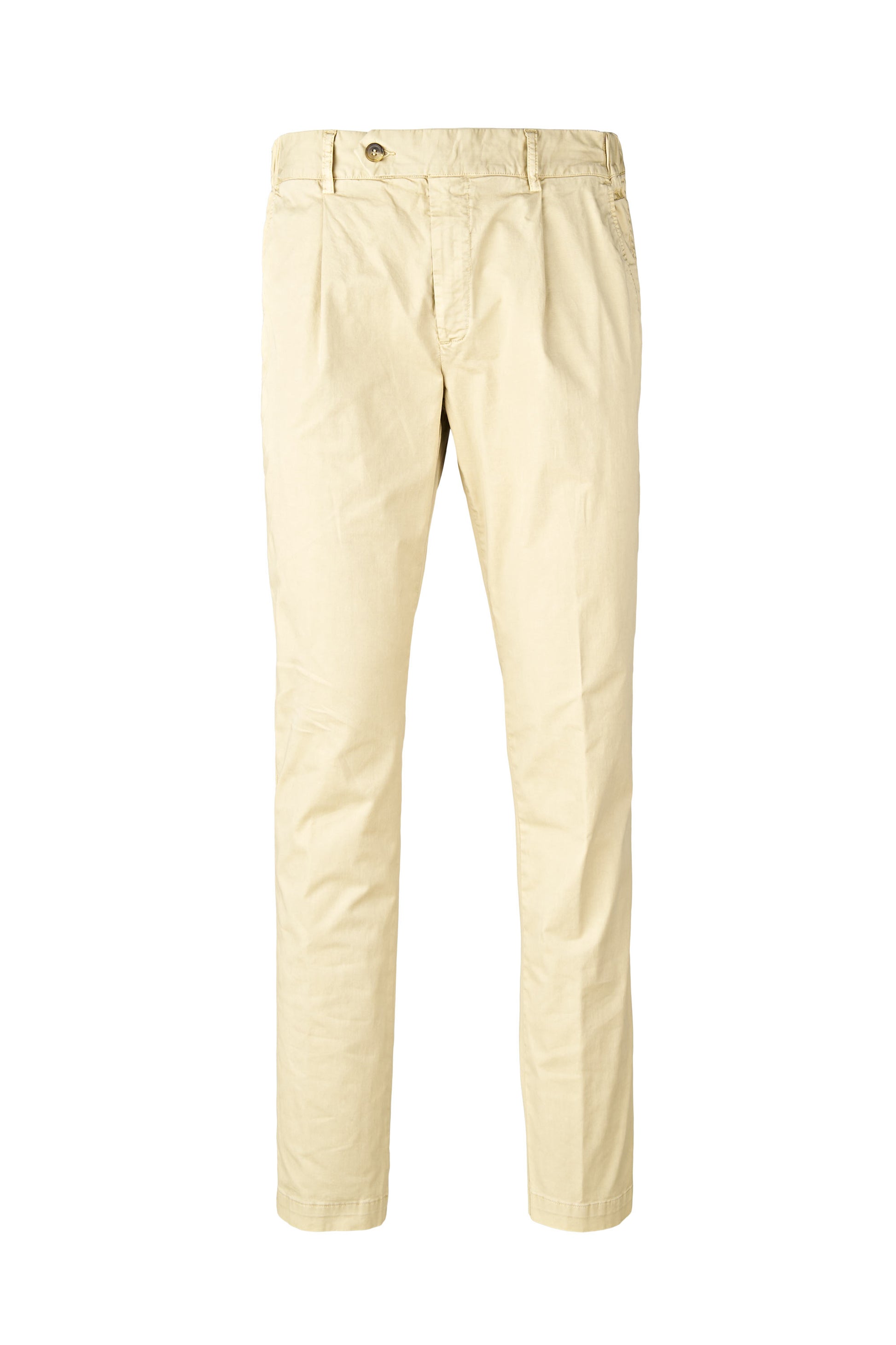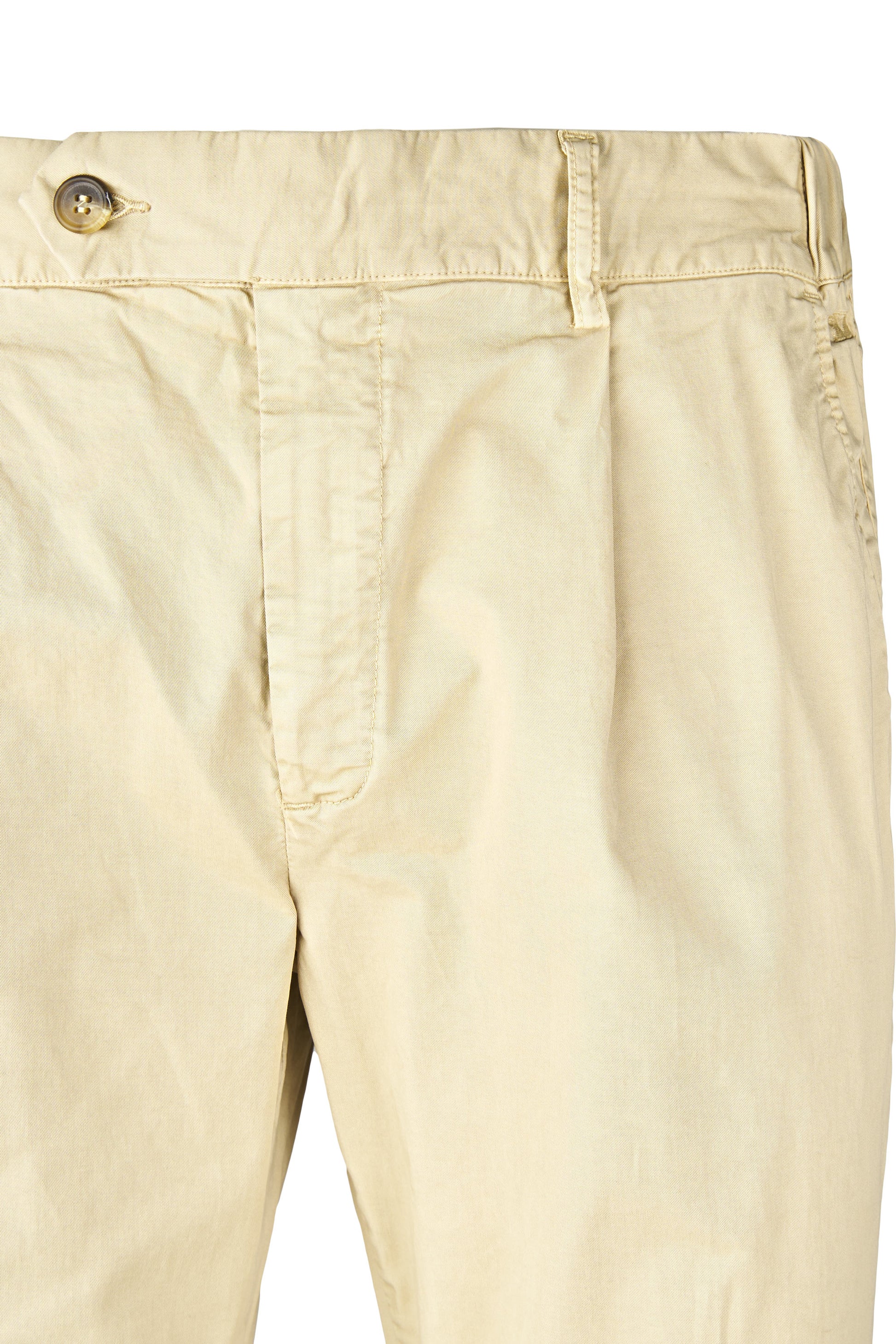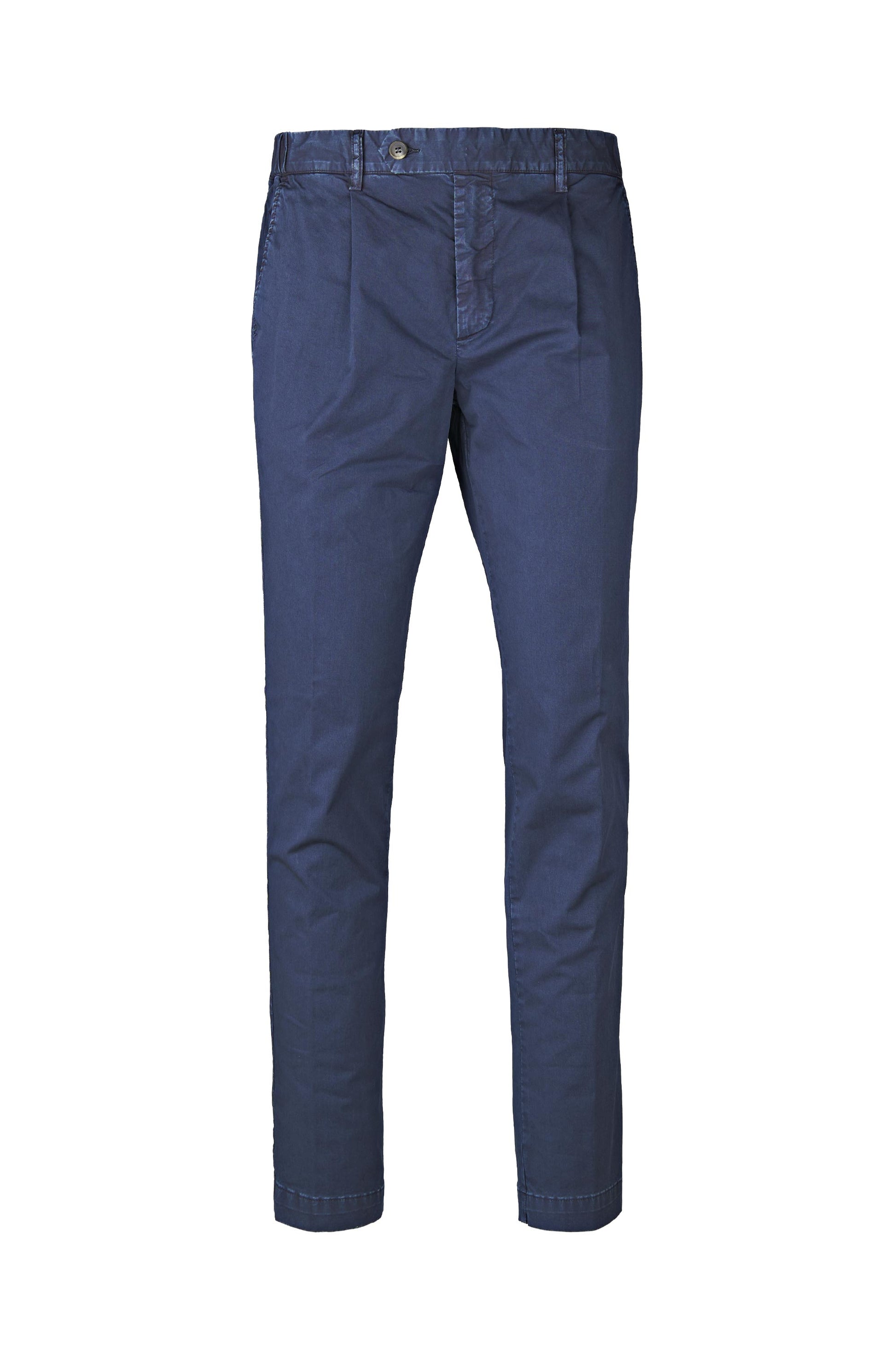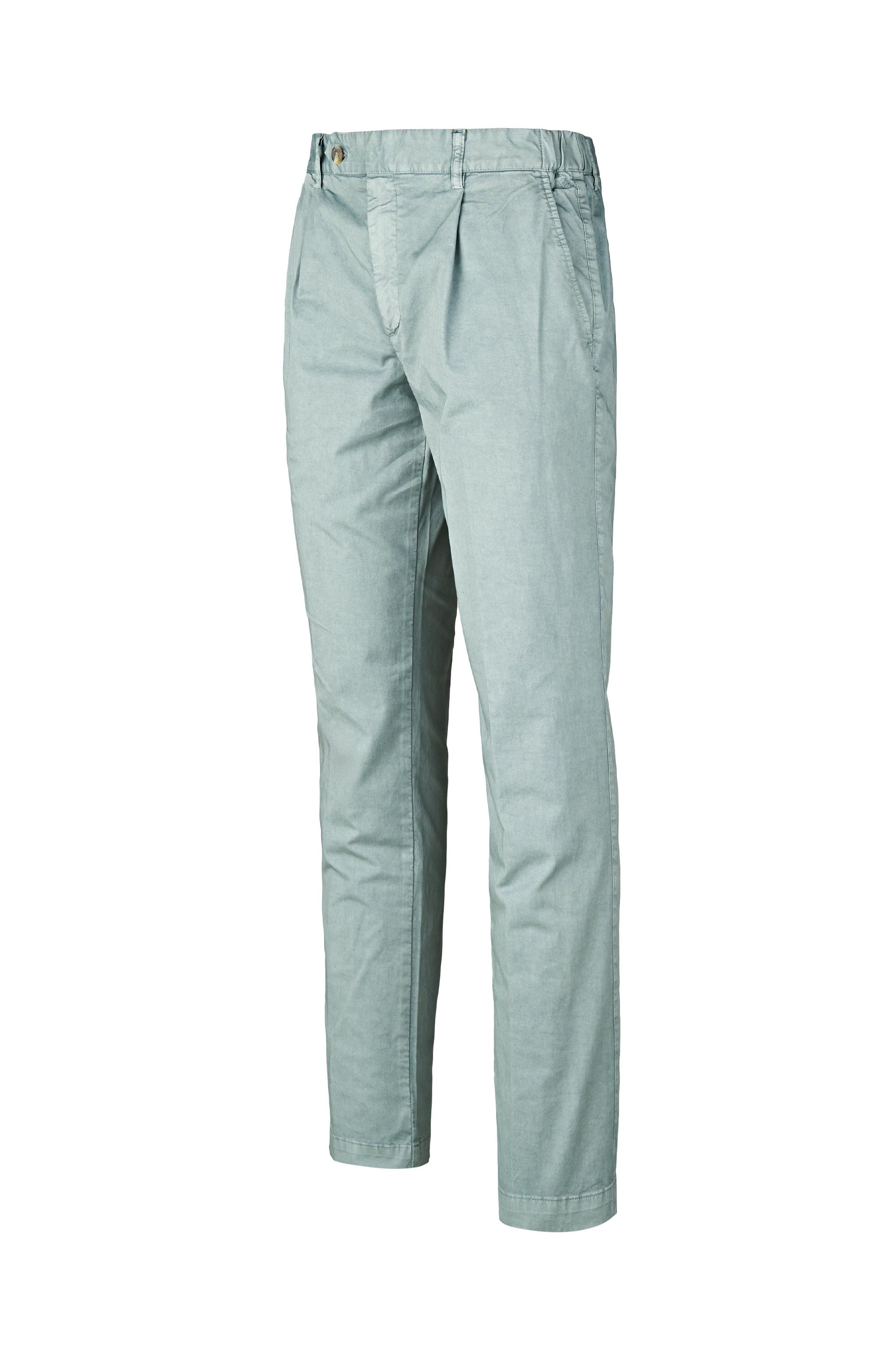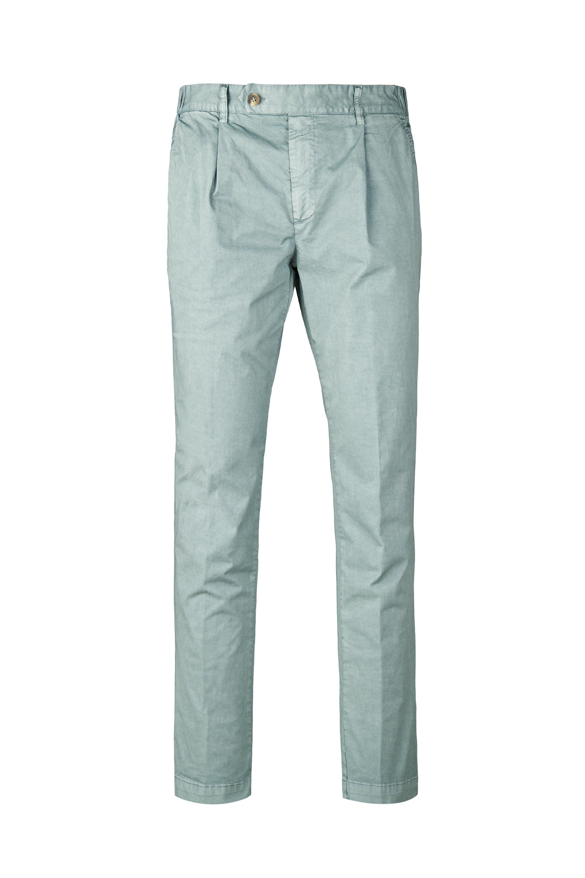 Lightweight stretch cotton twill trousers featuring a washed effect. Designed with front pleats, angled side pockets, and comfortable fit. Perfect for a refined casual look.