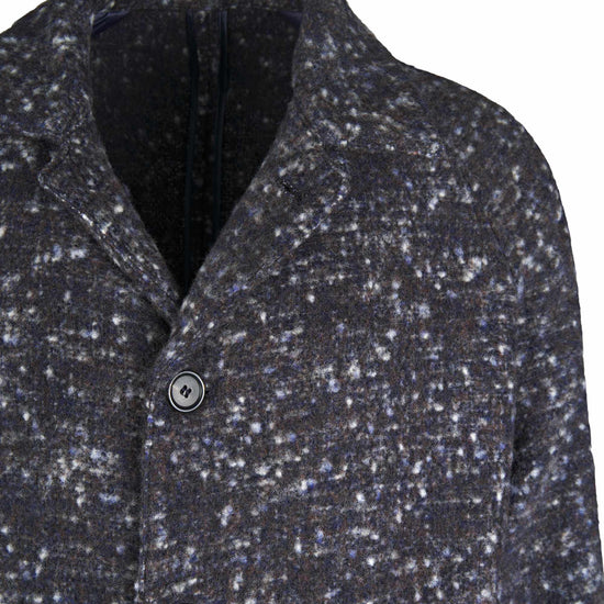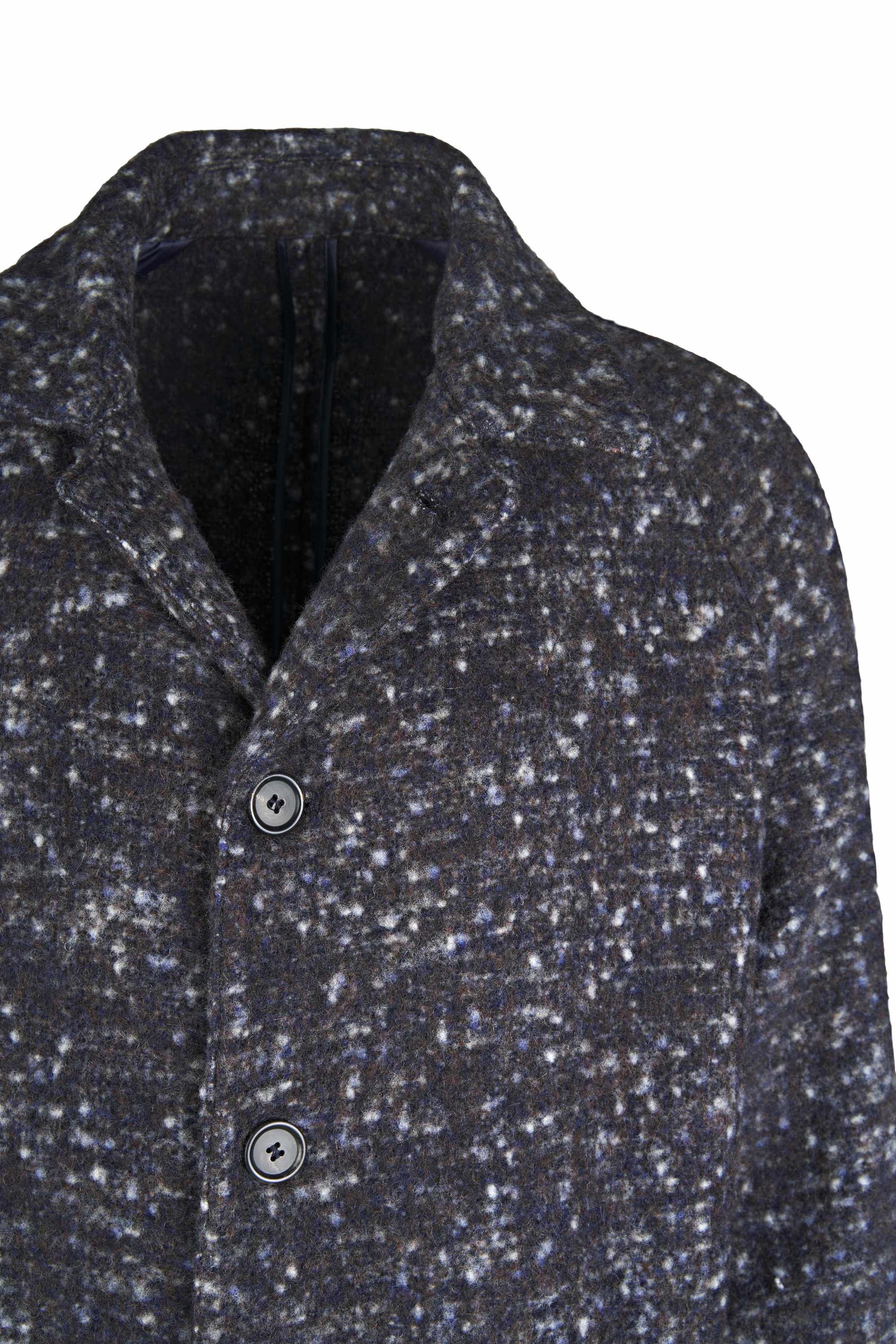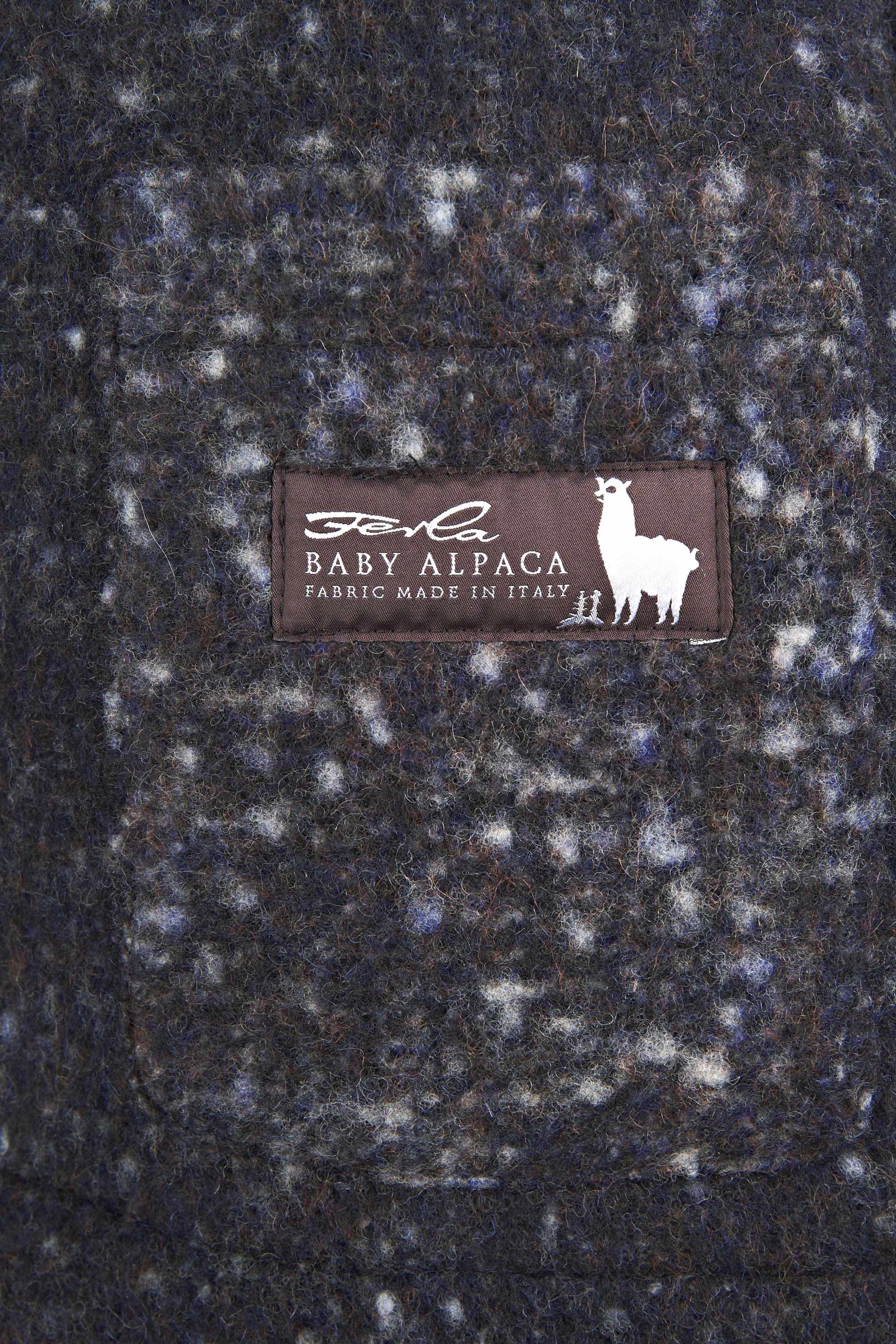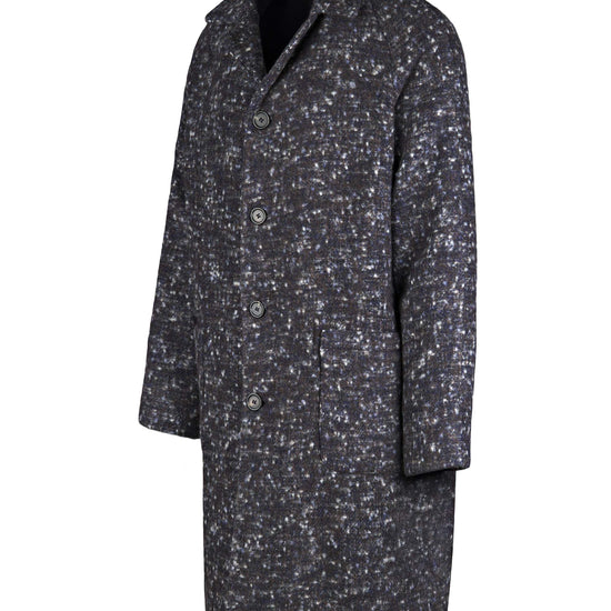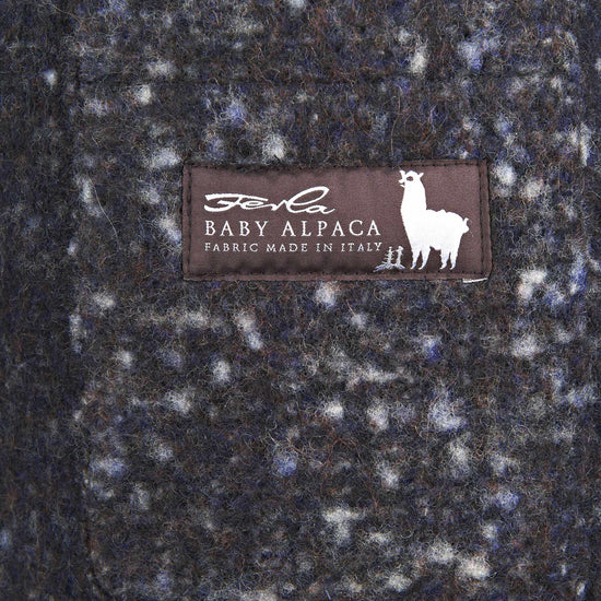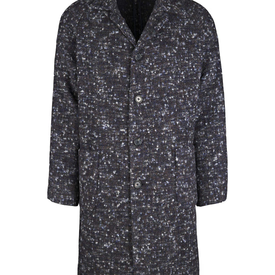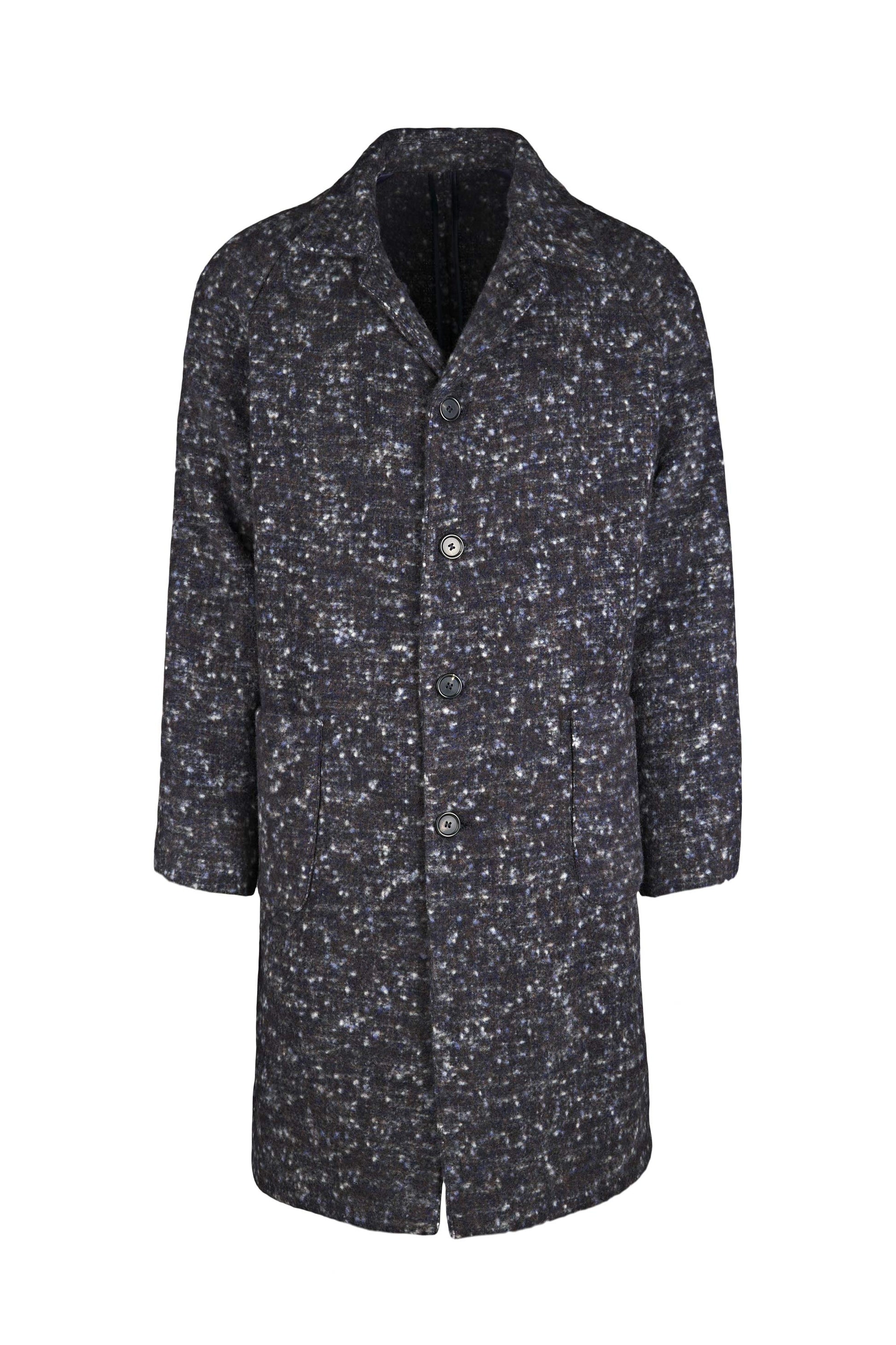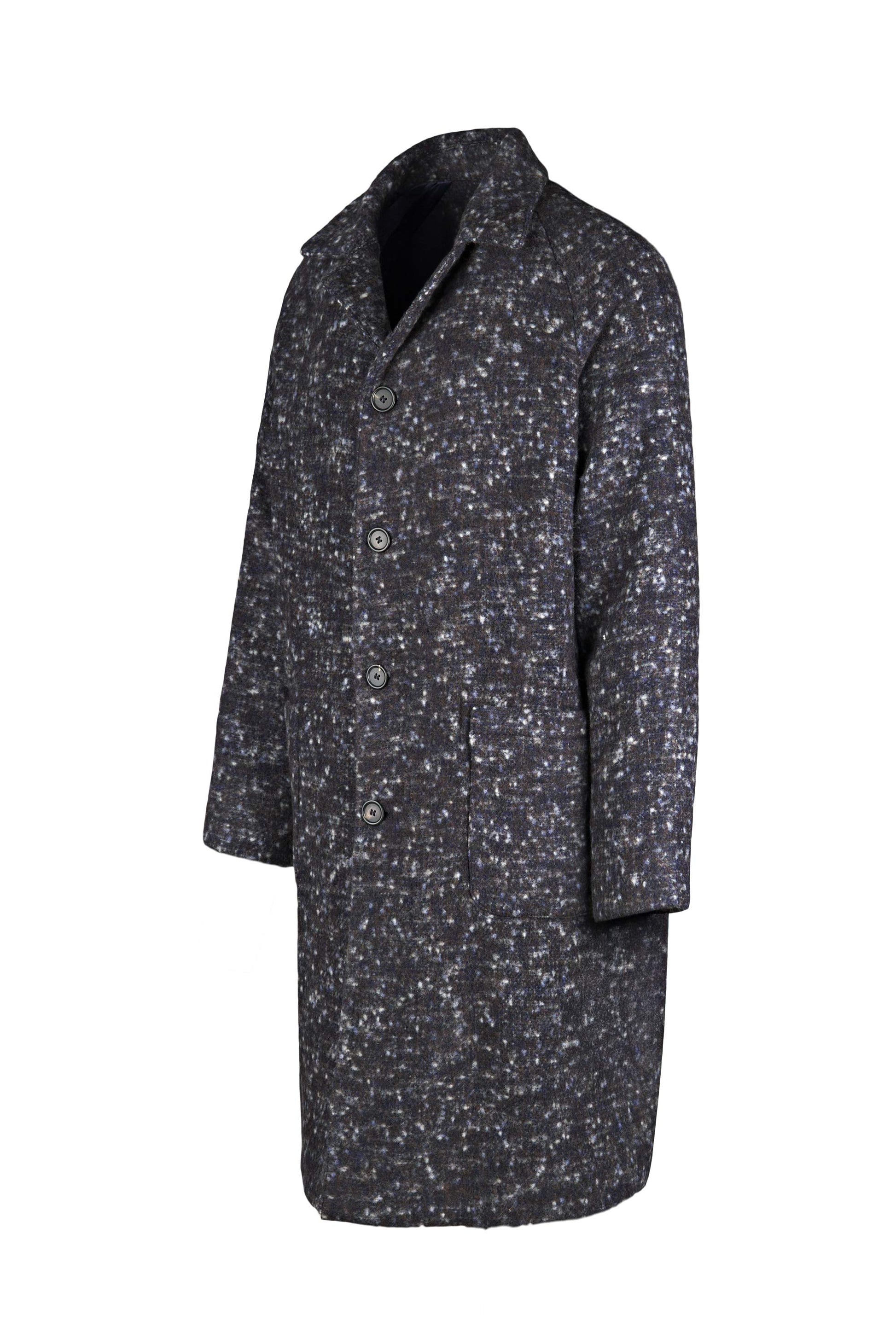 Unlined coat crafted from luxurious Italian fabric blending baby alpaca and virgin wool. The raglan shoulder enhances the relaxed silhouette, giving it a refined yet effortlessly modern attitude. The standout feature is the Knickerbocker bouclé fabric: a richly textured weave with a flame-effect look created by irregular yarns. The visual result is dynamic and tactile, with speckled shades forming an exclusive pattern. Classic collar, four-button front, and large patch pockets complete this refined and impactful piece.