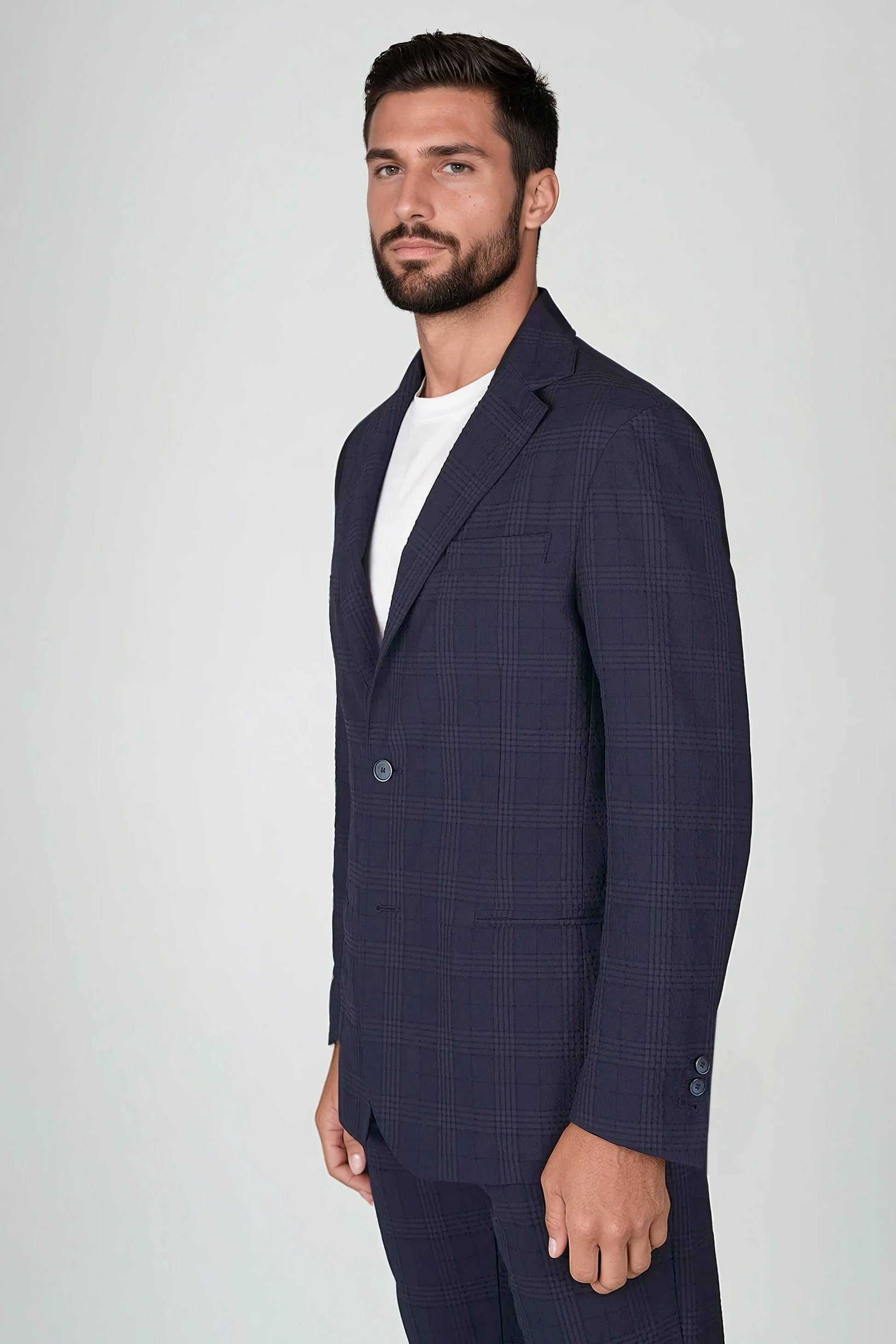 Unlined blazer, Seersucker fabric, Prince of Wales pattern, Single-breasted two-button closure, Classic lapels, Welt pockets, Stretch fabric, Tonal blue shade.