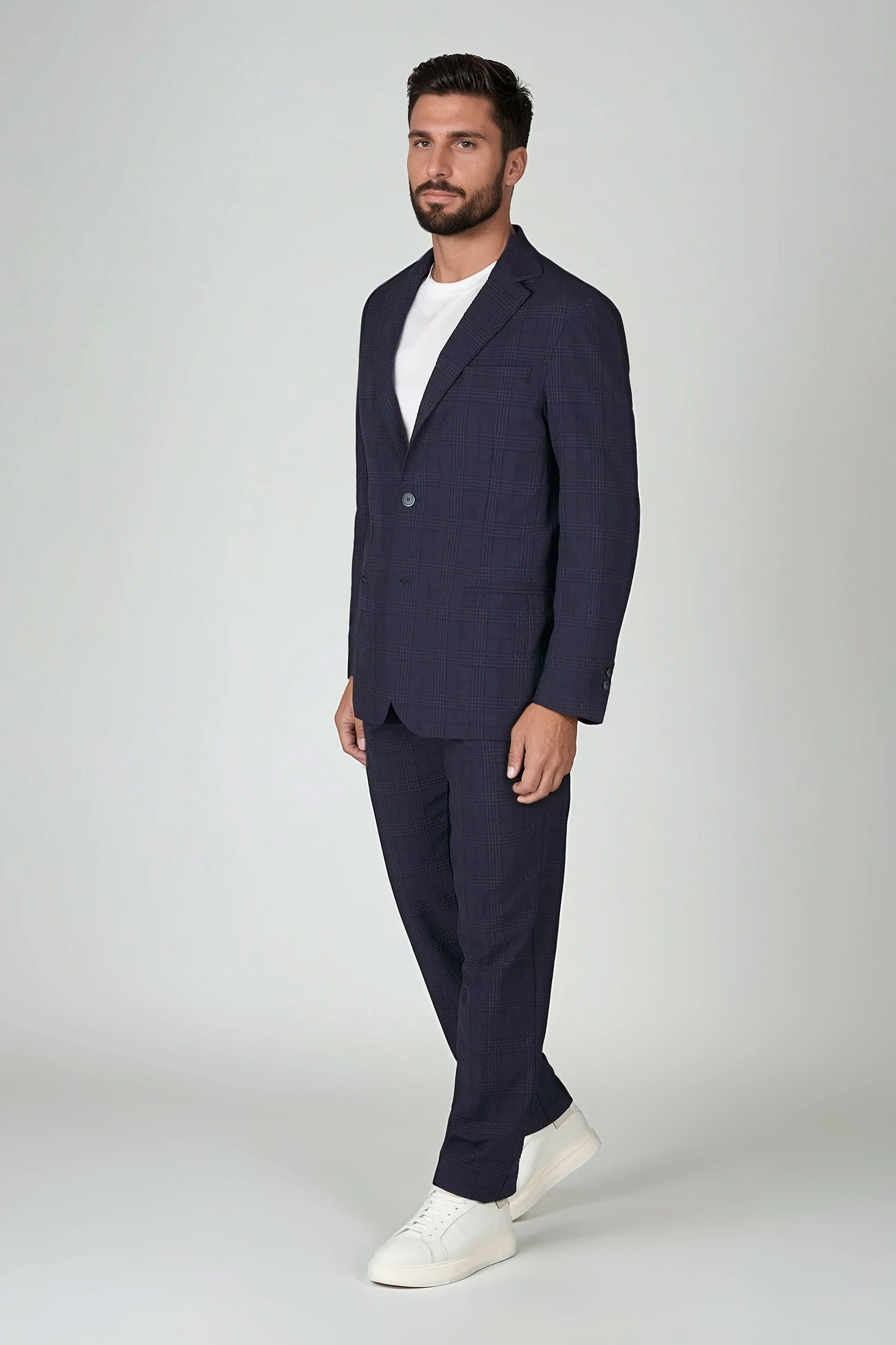 Unlined single-breasted blazer in blue seersucker fabric featuring a refined Prince of Wales pattern. Crafted from a lightweight blend of cotton and high perfomance fibers, ensuring comfort, elasticity, and breathability. A versatile piece perfect for casual-chic outfits, featuring classic lapels, welt pockets, and a two-button fastening.