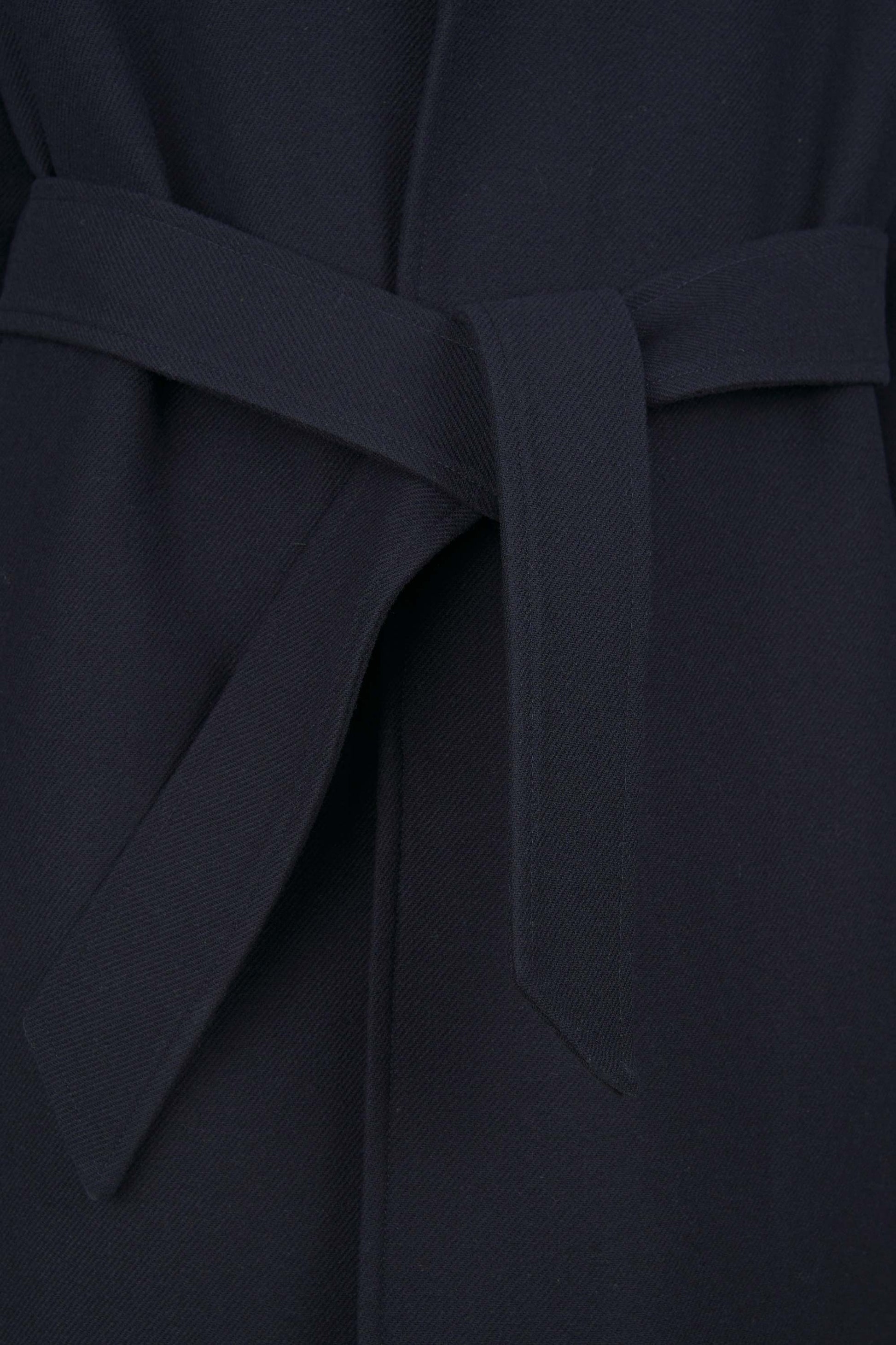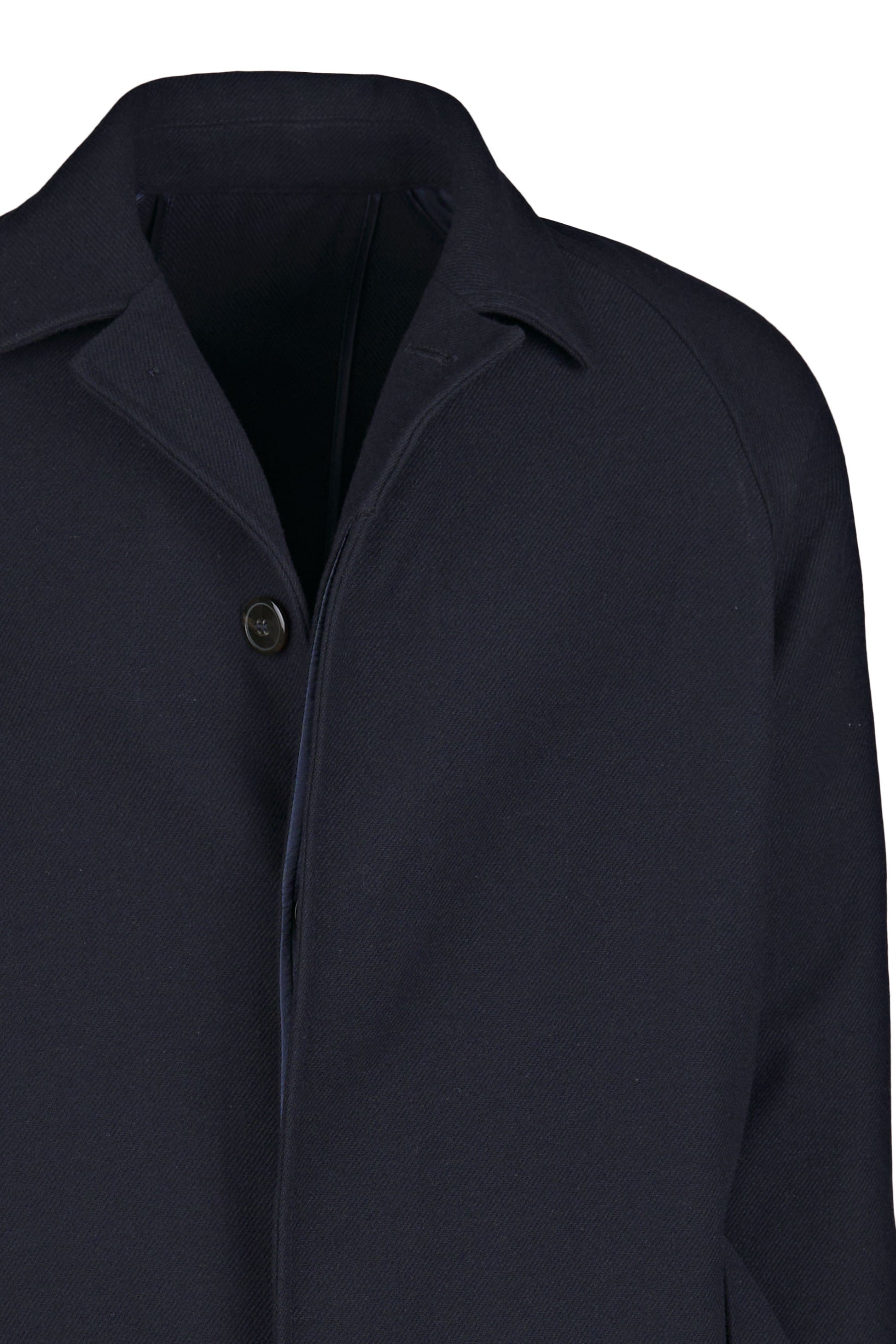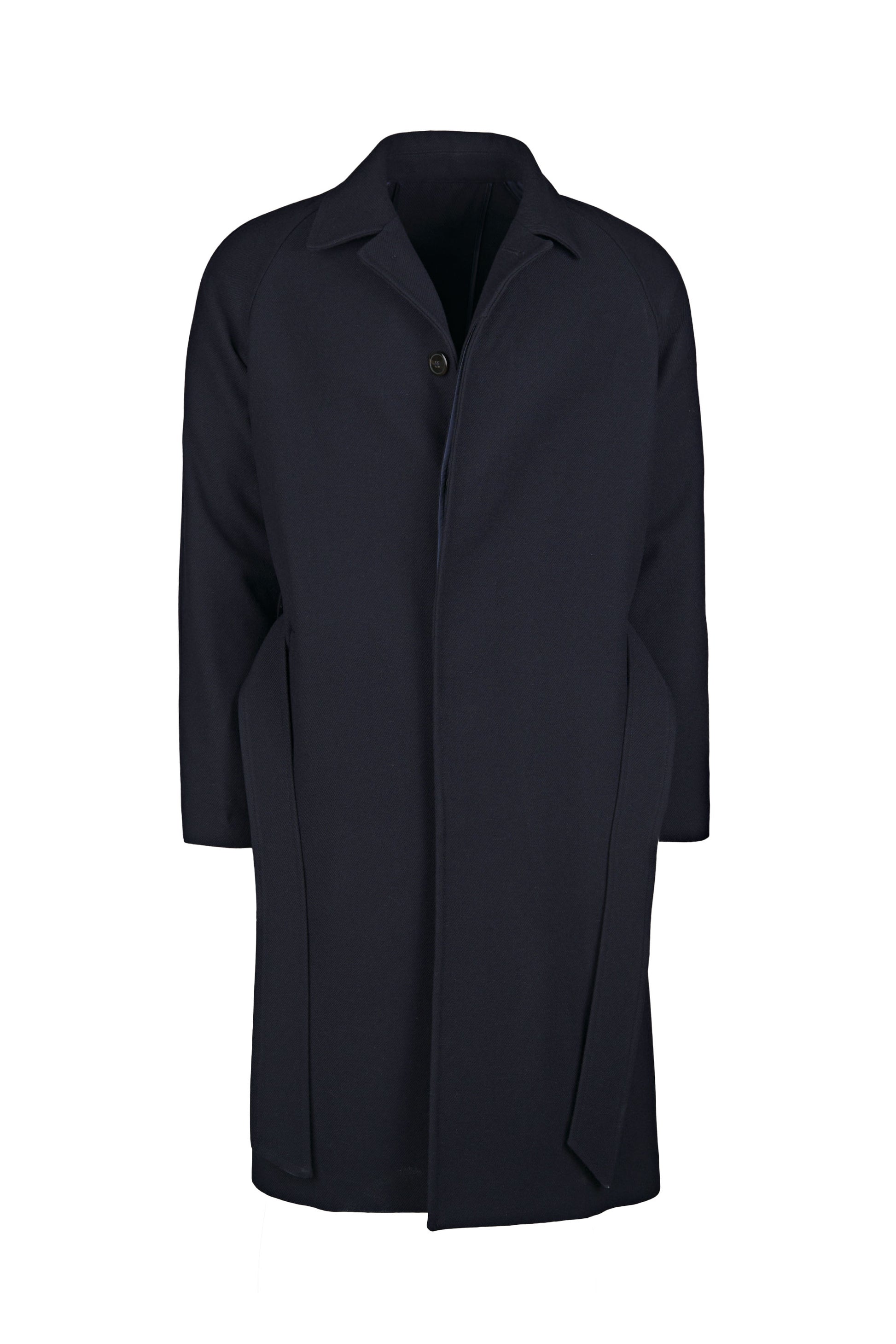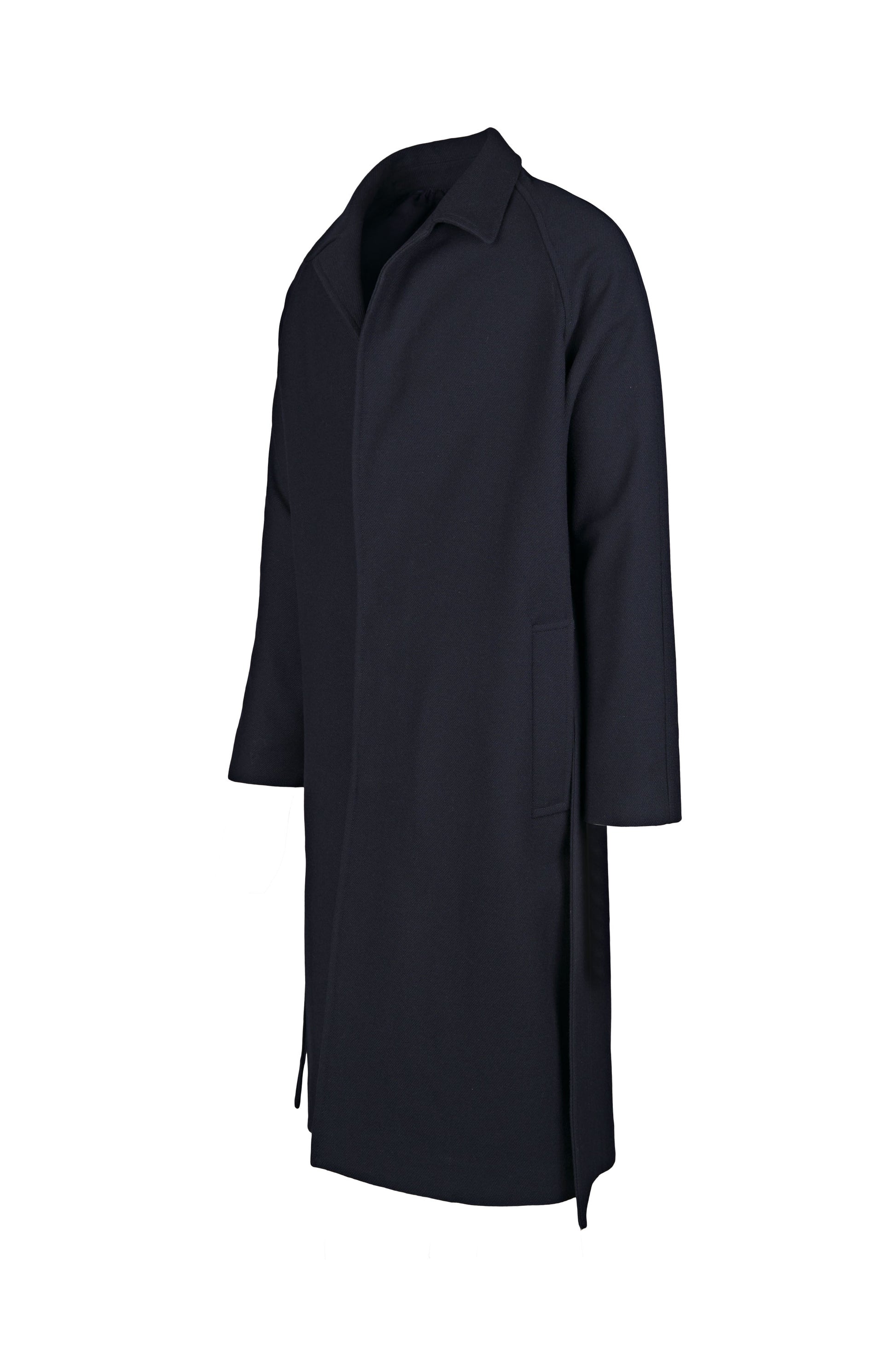 Perfect blend of modern elegance and functionality. Featuring raglan shoulders for a relaxed fit, it is crafted from premium wool, ensuring warmth without the bulk. The coat has a clean, minimalist look with a concealed four-button closure under a placket and a waist belt for adjustable styling. Side pockets add practicality, while the car coat-style collar adds a timeless touch to this versatile piece.