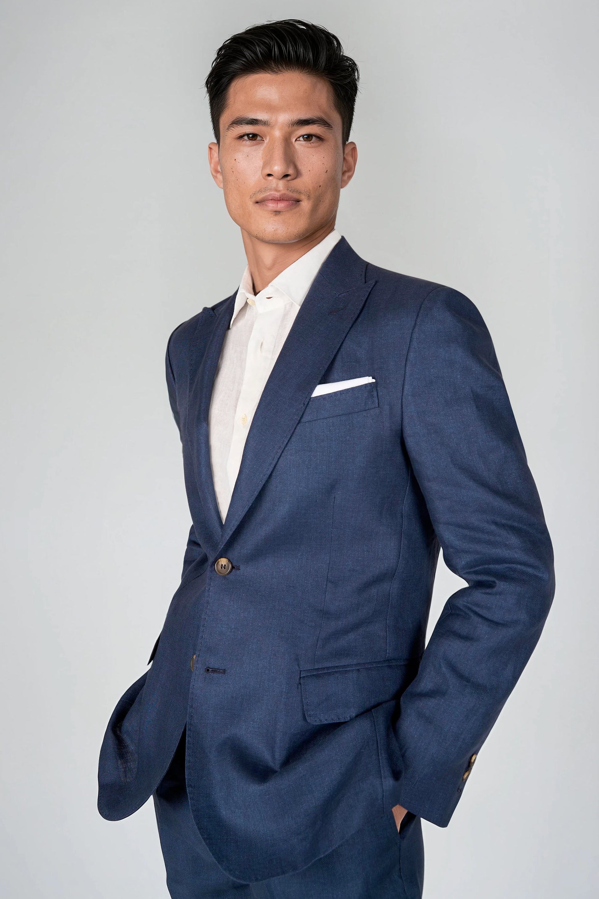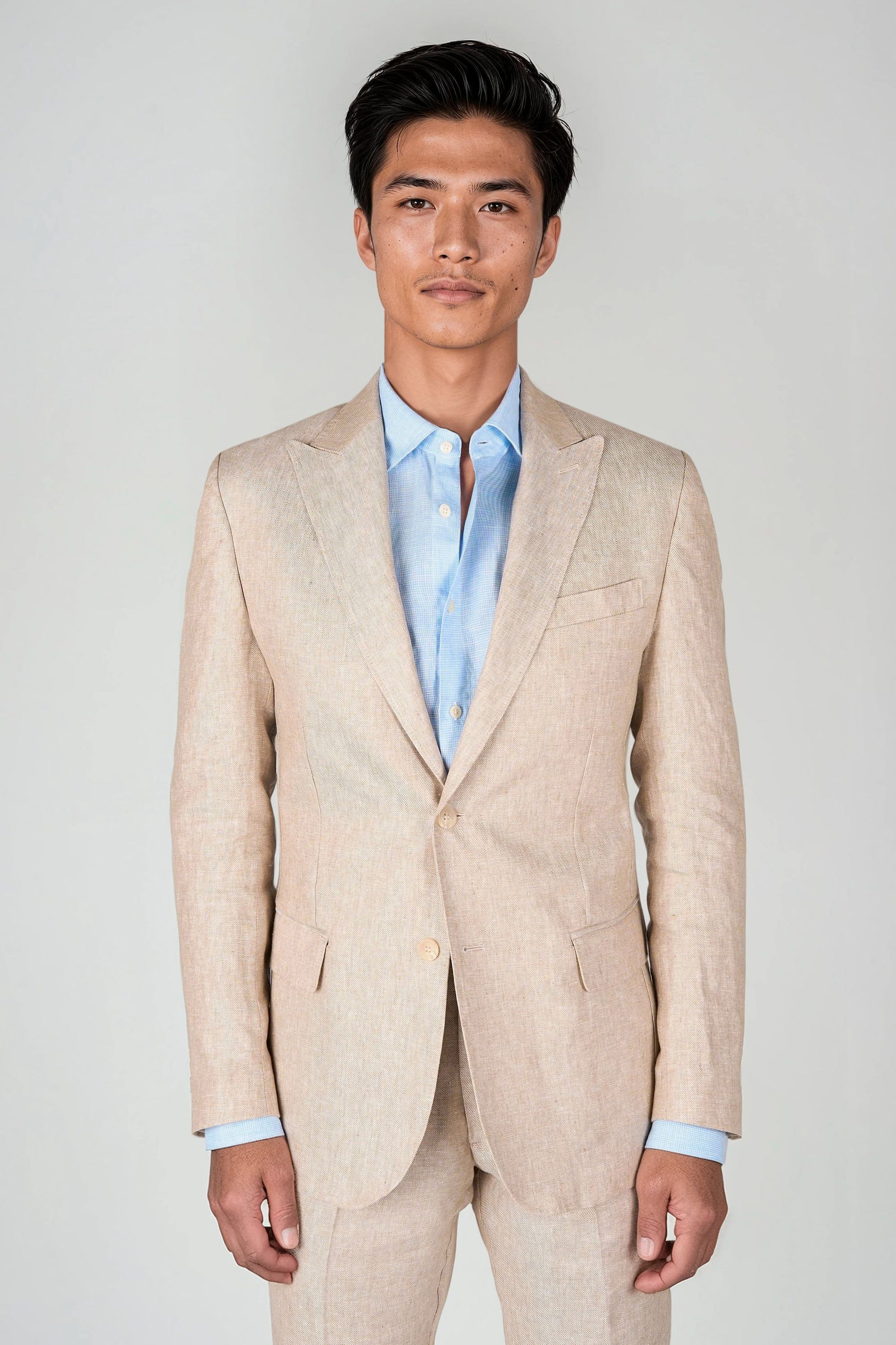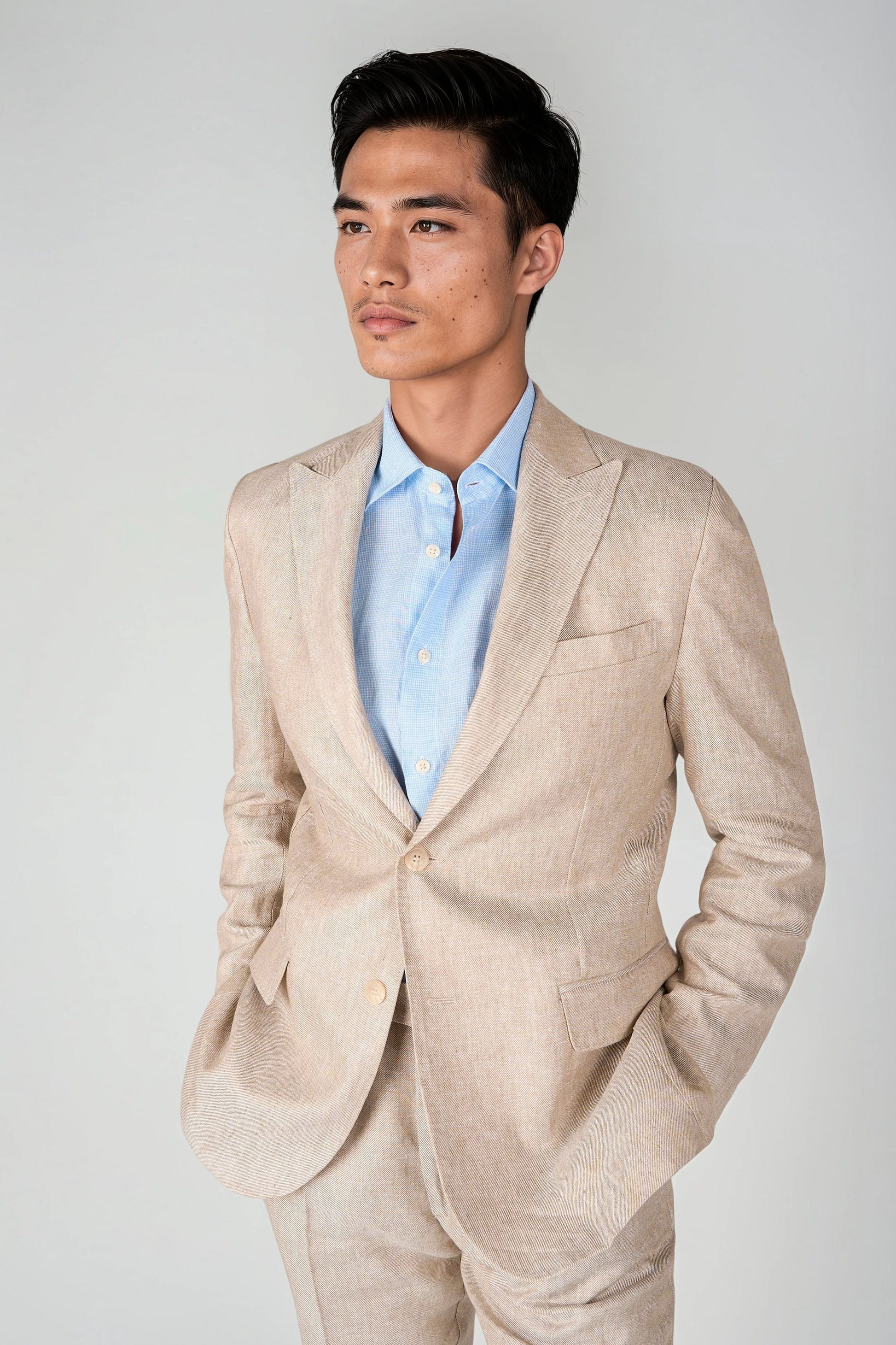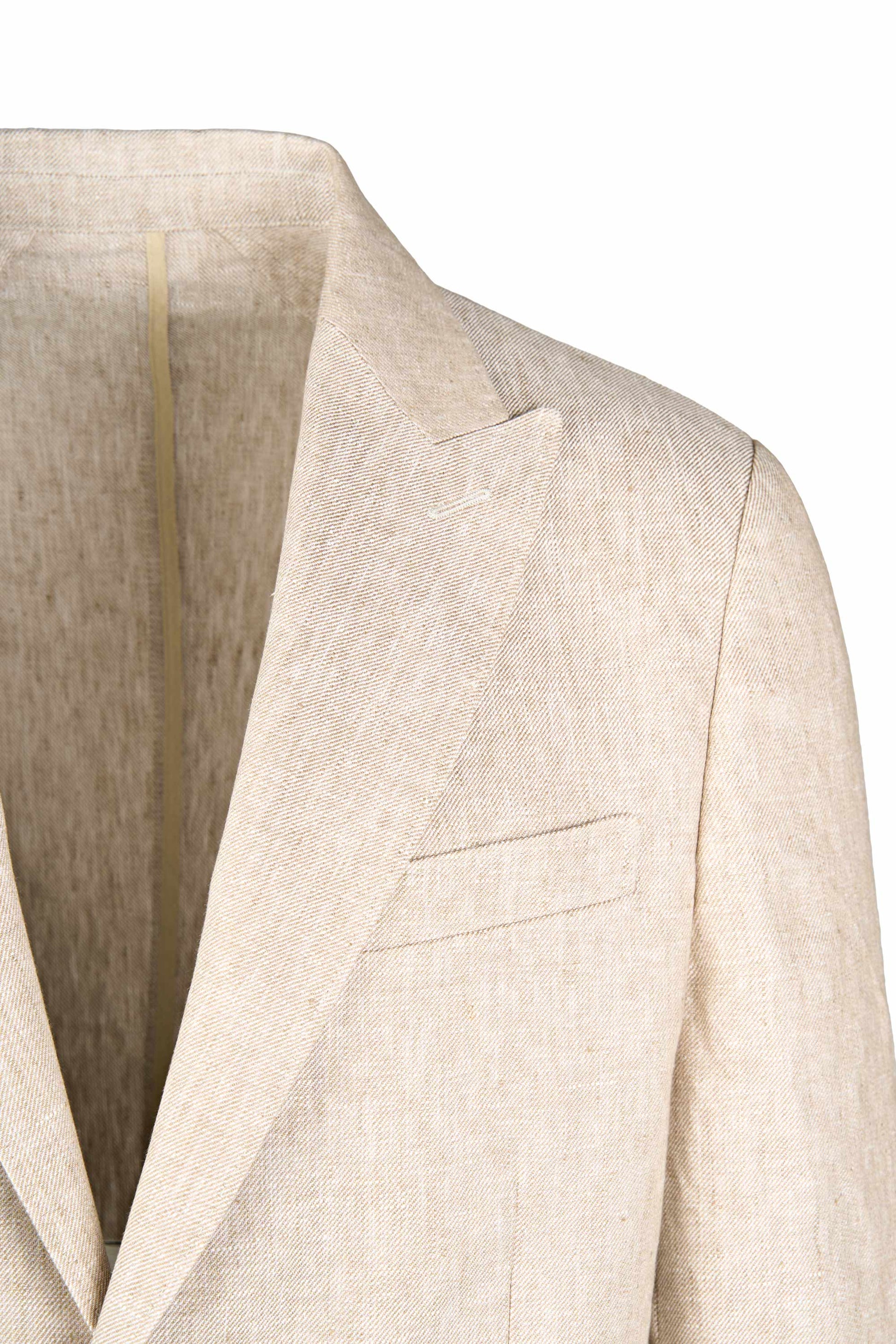Crisp, elegant, and ideal for warm weather: this pure linen jacket features a dry, natural hand and a clean unstructured construction without lining. Classic peaked lapels and flap pockets give it a tailored flair. A garment easy to pairing for both formal and relaxed outfits.