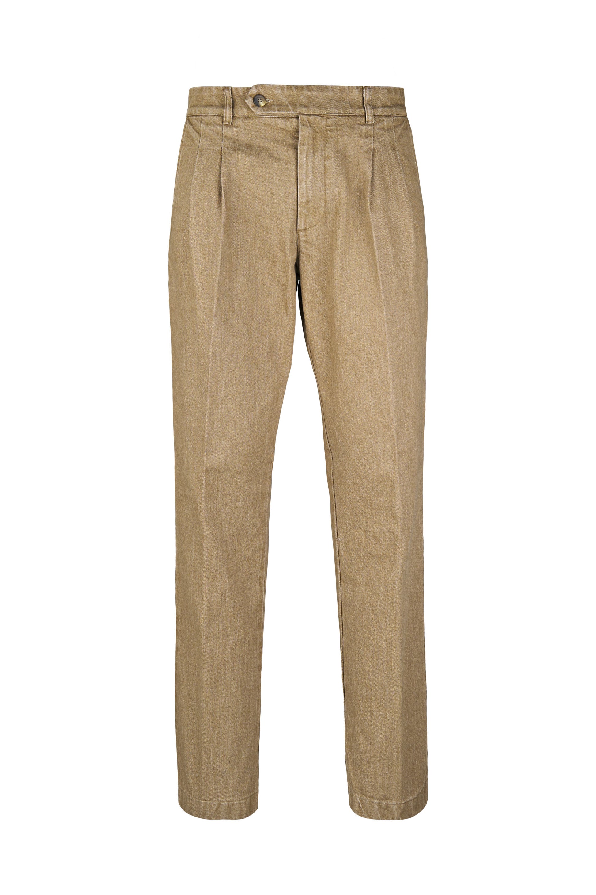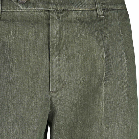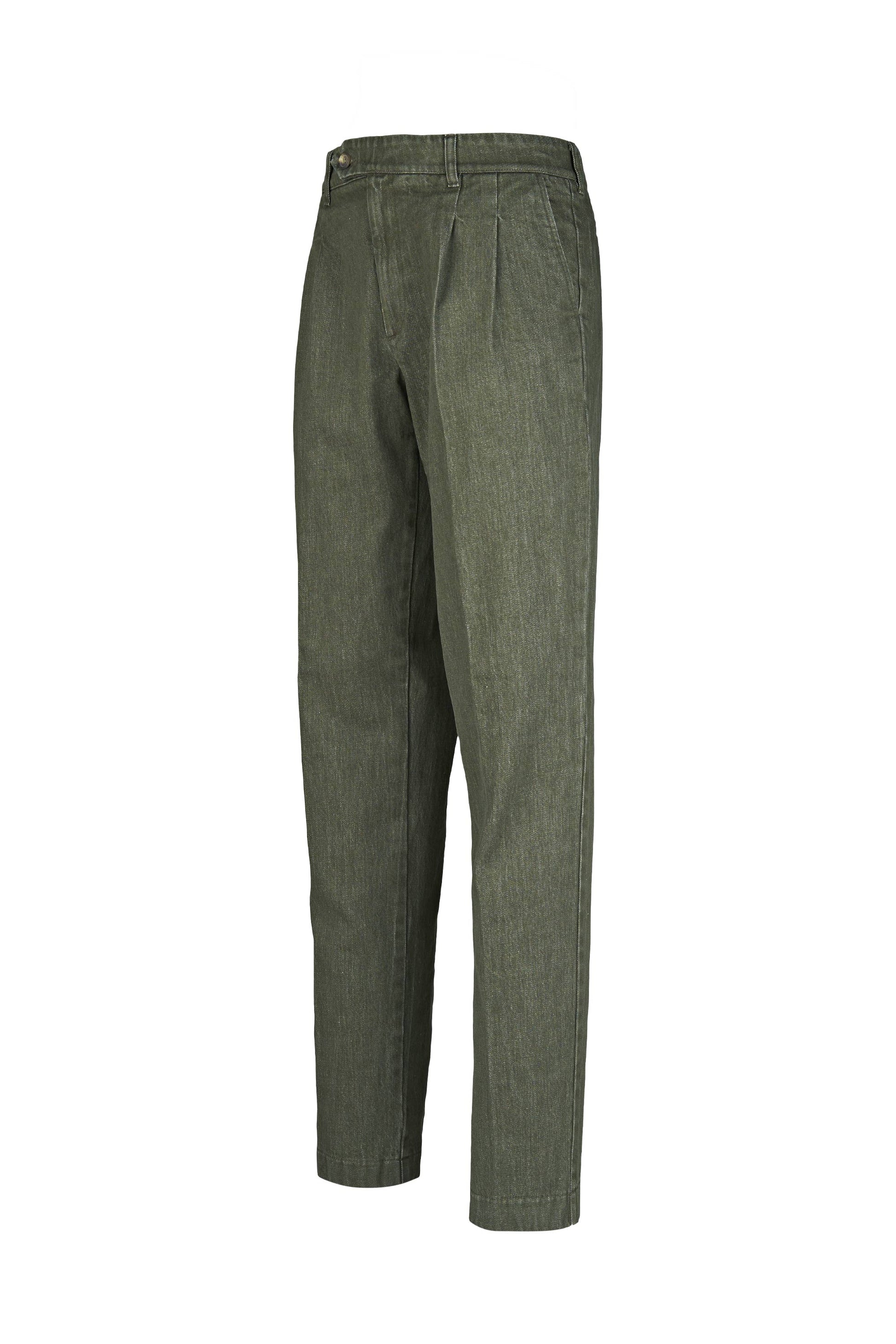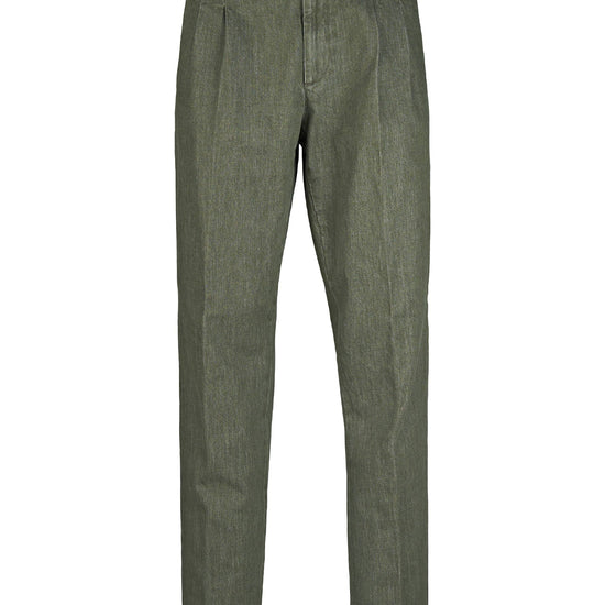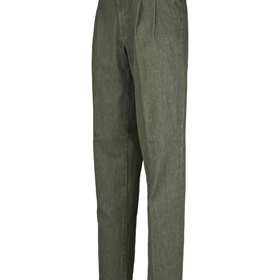 Colored washed delavé denim trousers with double front pleats, combining the discipline of tailoring with the ease of denim. The cotton fabric blended with a touch of elastane has a substantial yet flexible hand, providing comfort and shape retention. The delavé treatment delivers nuanced, lived-in shades that enhance the pressed crease and the neat topstitching. Exceptionally versatile, they pair with an Oxford shirt and a lightweight blazer for relaxed tailoring, with a polo, crew-neck knit or tee and sneakers for a sportier look, or with loafers or derbies and a short coat for refined smart-casual outfits suitable from office to off-duty.