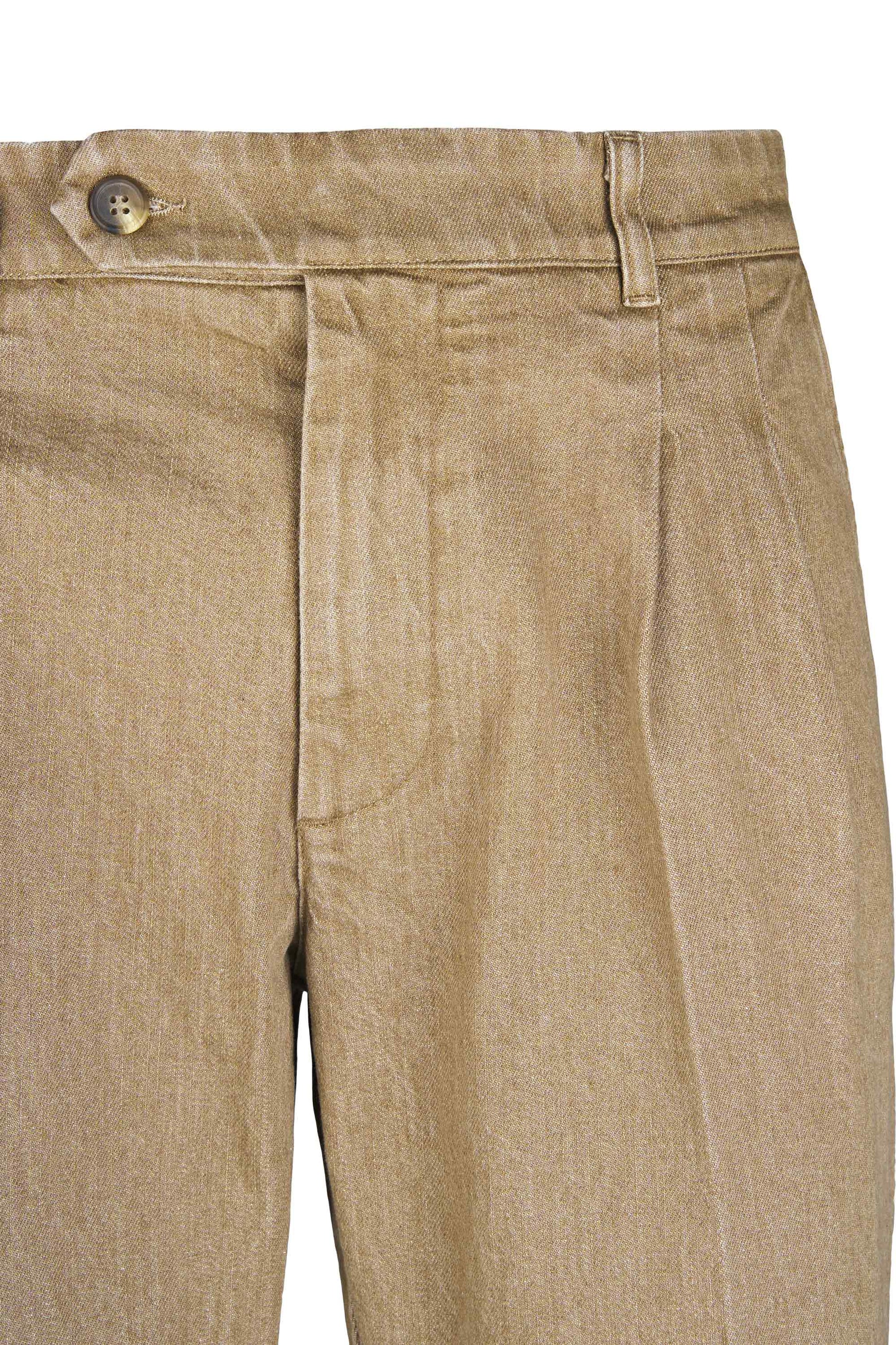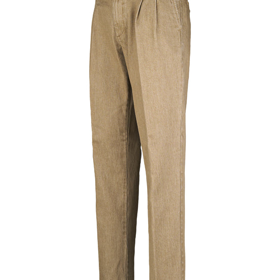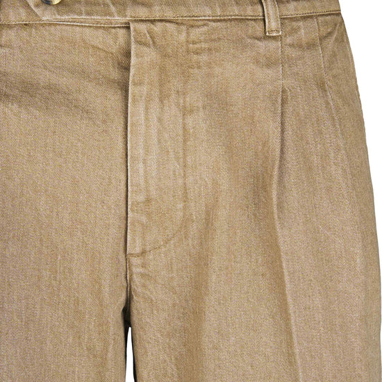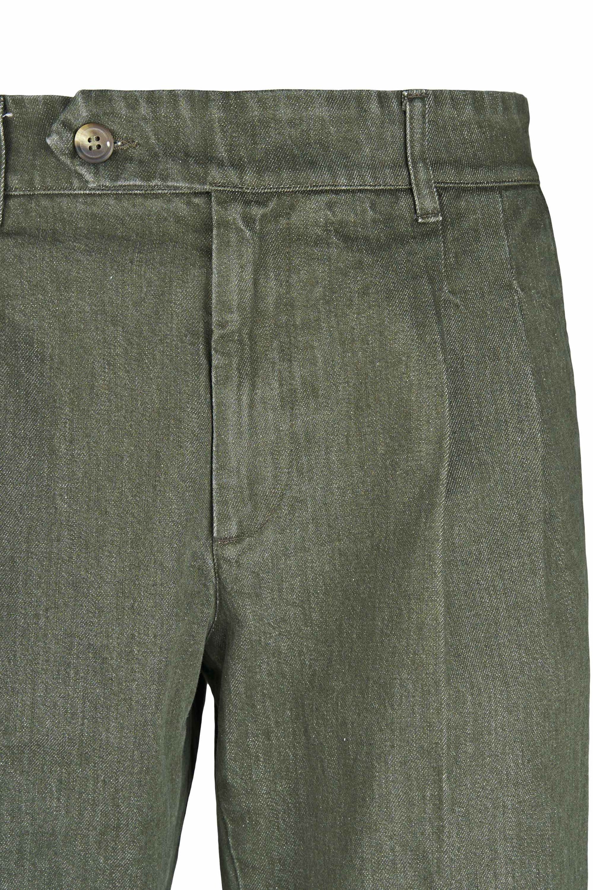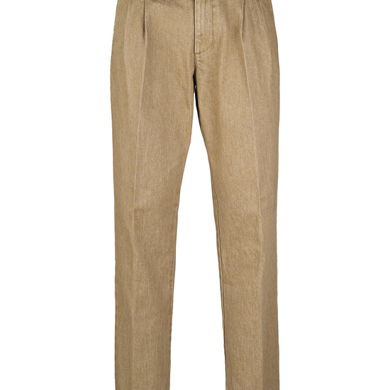 Colored washed delavé denim trousers with double front pleats, combining the discipline of tailoring with the ease of denim. The cotton fabric blended with a touch of elastane has a substantial yet flexible hand, providing comfort and shape retention. The delavé treatment delivers nuanced, lived-in shades that enhance the pressed crease and the neat topstitching. Exceptionally versatile, they pair with an Oxford shirt and a lightweight blazer for relaxed tailoring, with a polo, crew-neck knit or tee and sneakers for a sportier look, or with loafers or derbies and a short coat for refined smart-casual outfits suitable from office to off-duty.