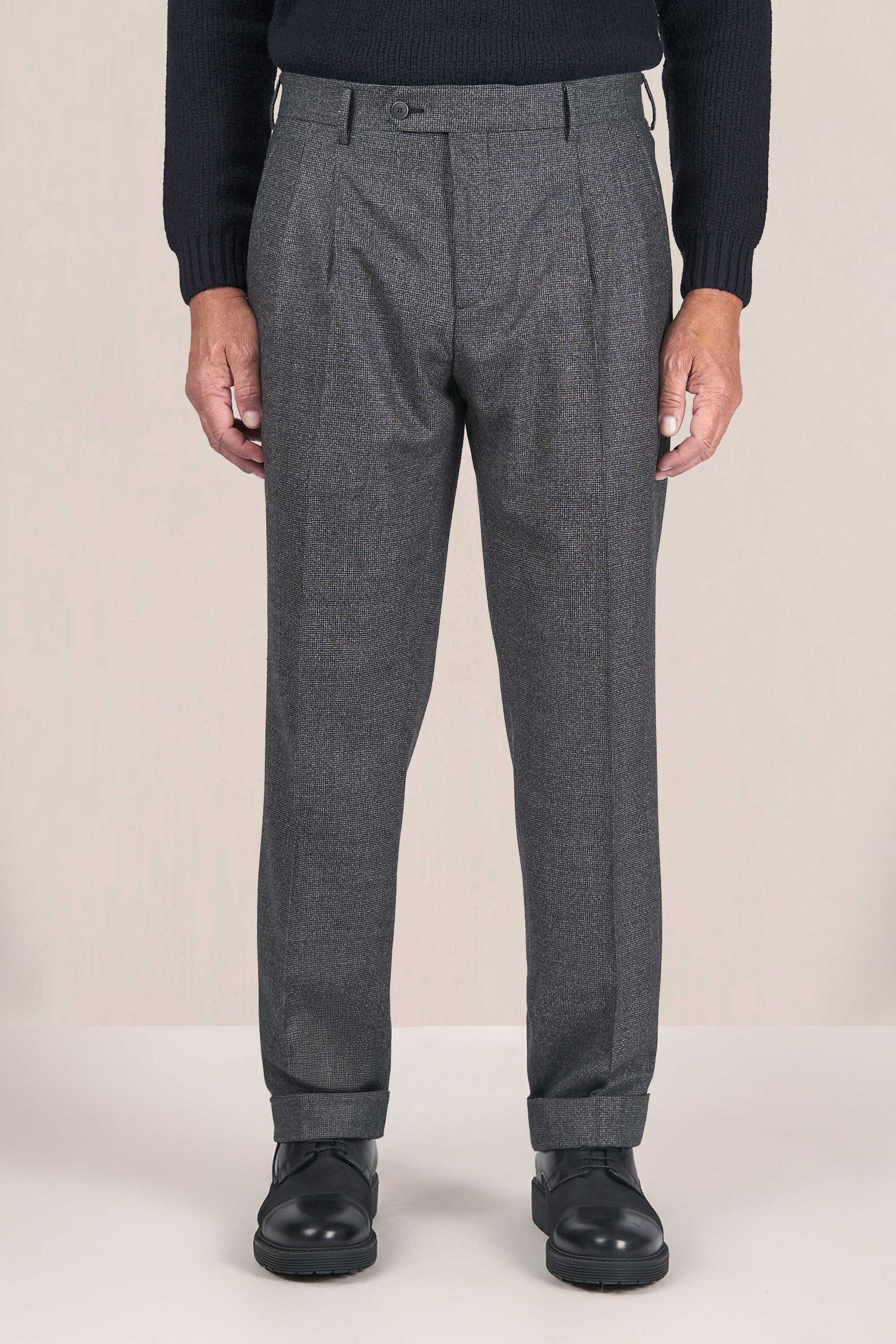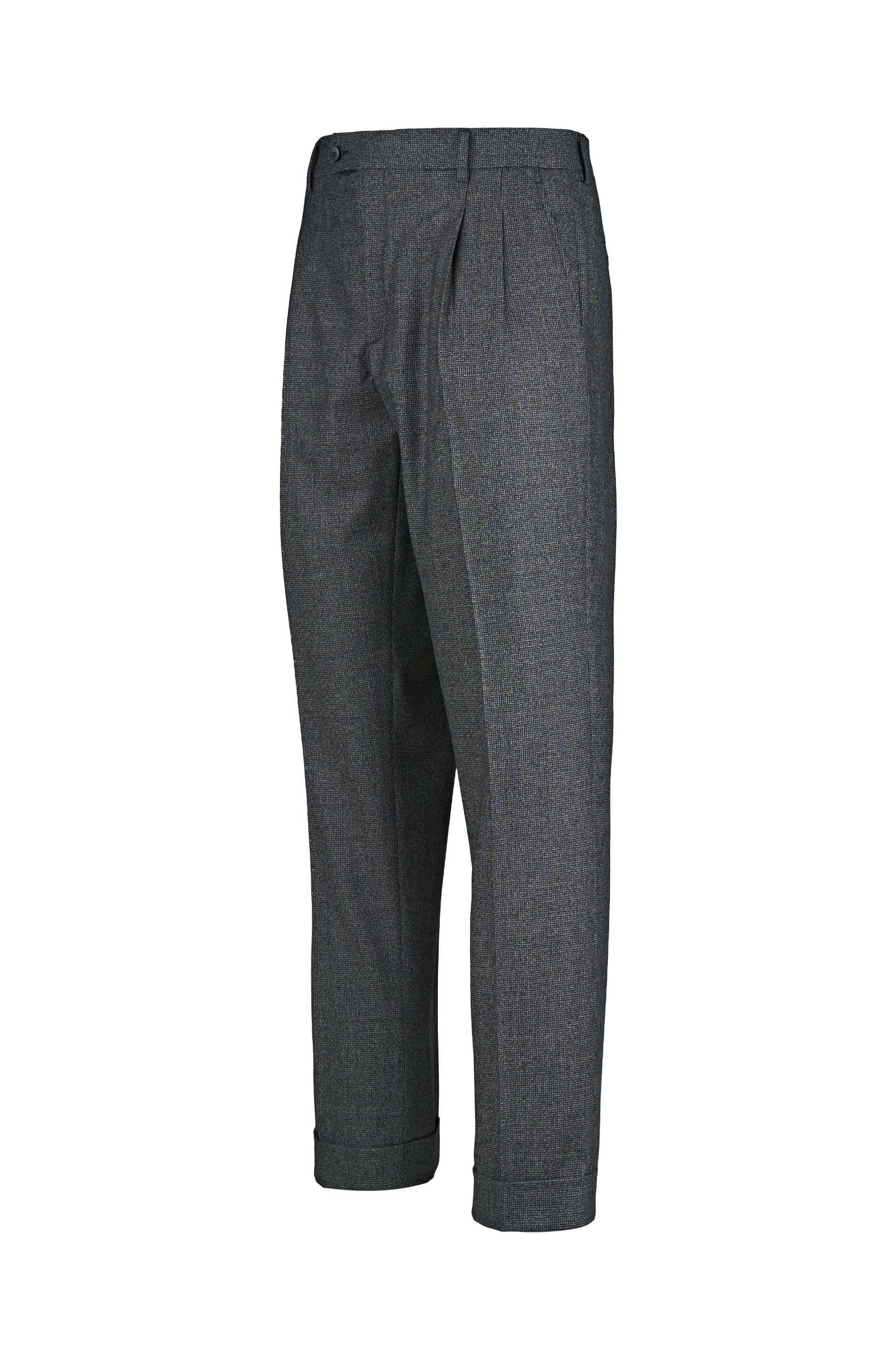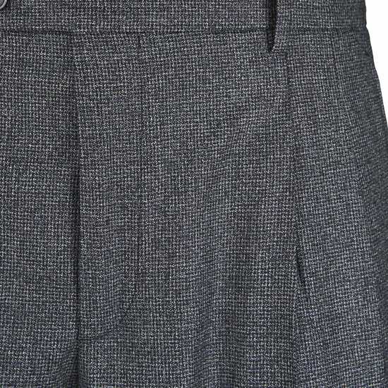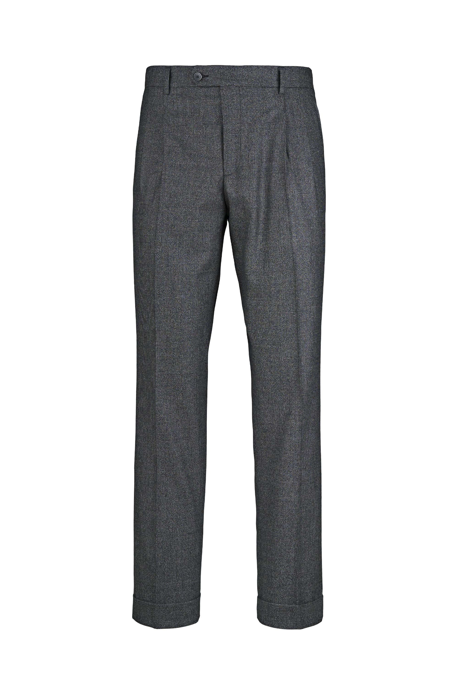 Concealed zip fastening with waistband button. Belt loops; structured mid-rise waist. Two slanted front pockets; two back welt pockets with button. Double front pleats on each side. Wide leg with pressed center crease. 20 cm hem with cuff.