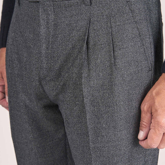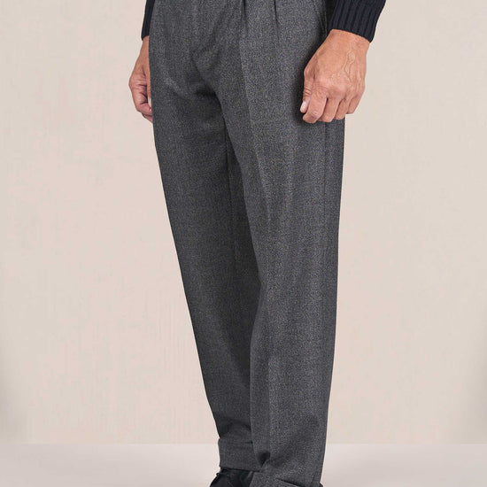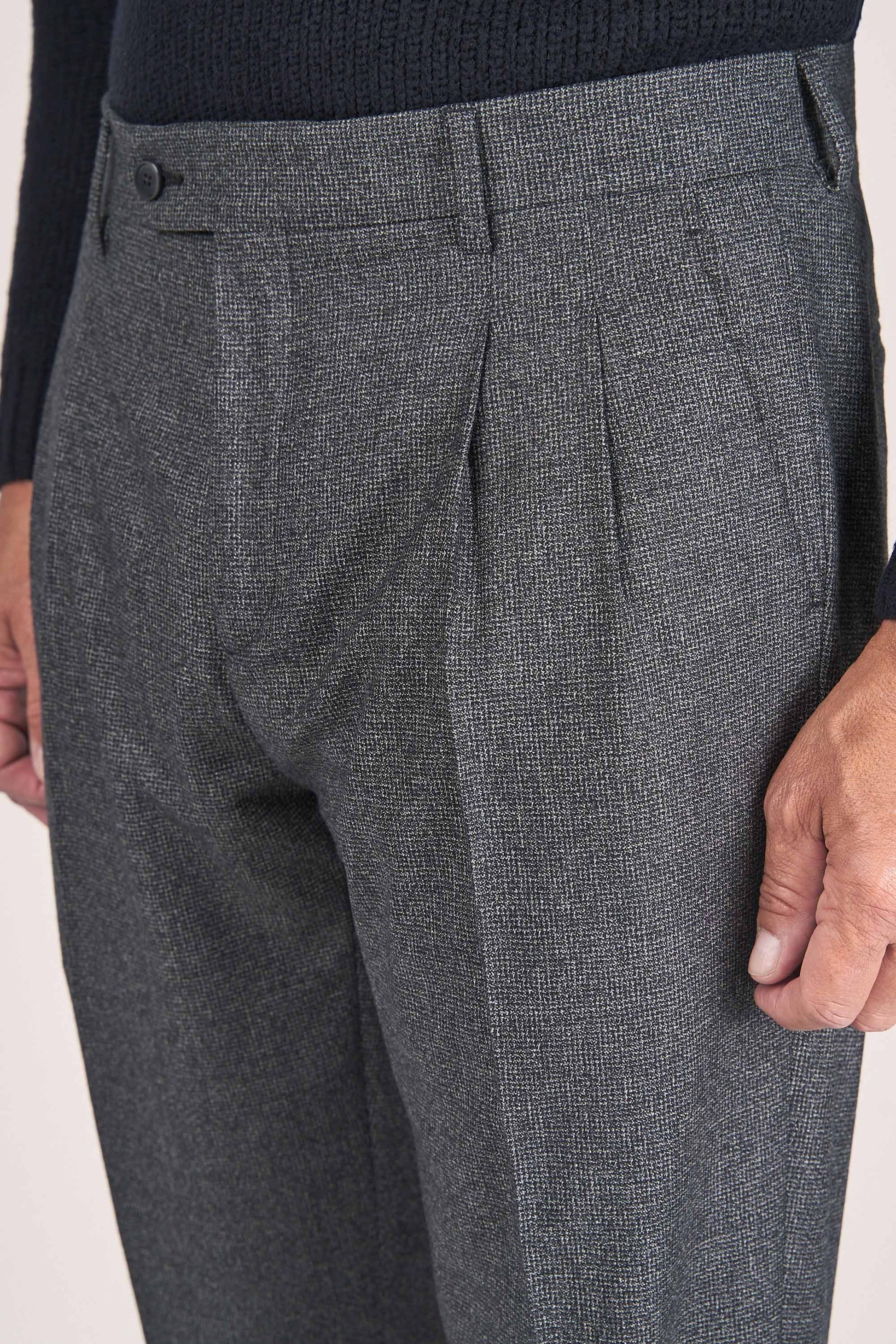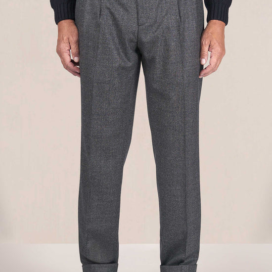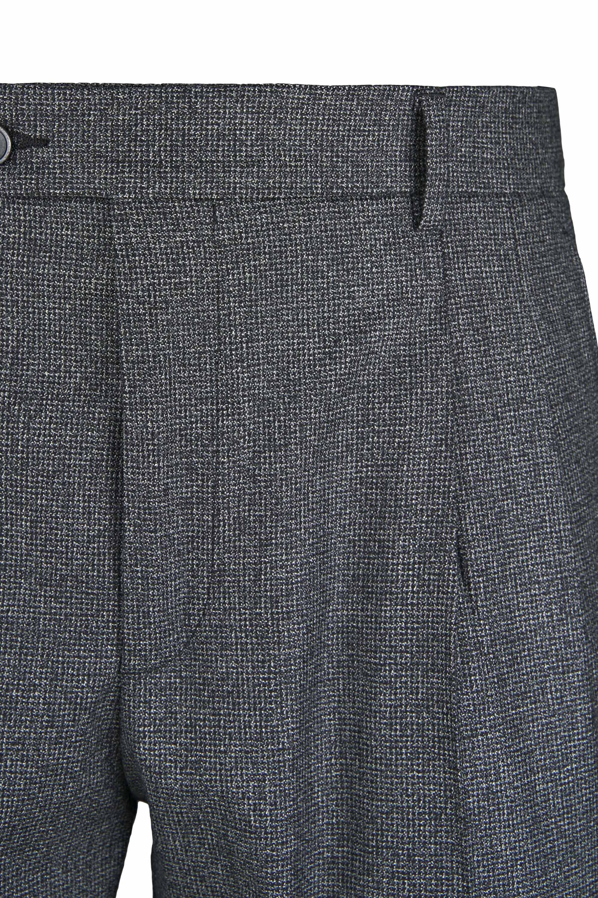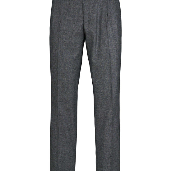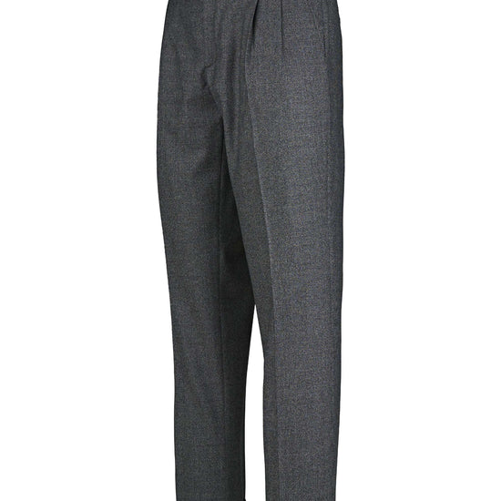 Concealed zip fastening with waistband button. Belt loops; structured mid-rise waist. Two slanted front pockets; two back welt pockets with button. Double front pleats on each side. Wide leg with pressed center crease. 20 cm hem with cuff.