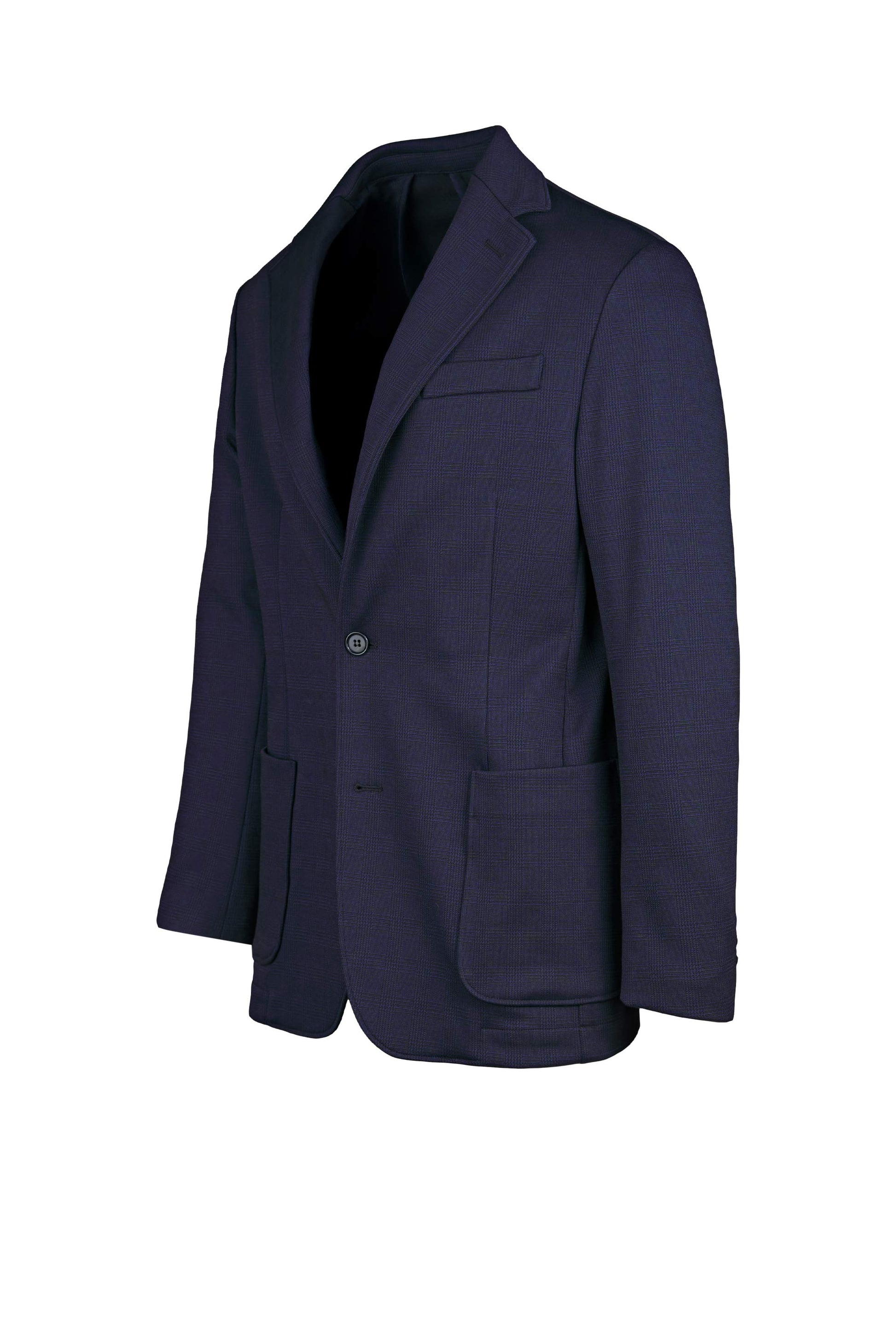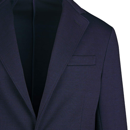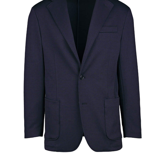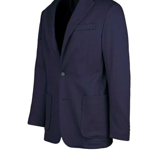 Compact stretch jersey; tone-on-tone Prince of Wales pattern; lightweight, deconstructed build with clean interior; single-breasted 2-button closure; notch lapels with buttonhole; chest welt pocket; two roomy patch pockets; natural shoulder for comfort; breathable, naturally crease-resistant fabric.